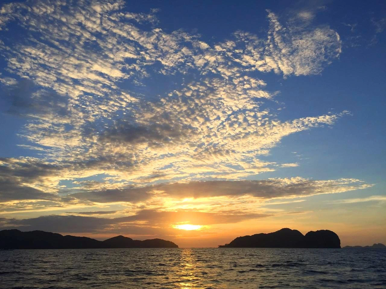 크루즈라고 해서 정말 크루즈를 기대했다면, 미안하지만 크게 실망할지도 모르겠다. 우리가 탄 크루즈, 아니 크루즈라 칭한 배는 실제로는 *방카선(Bangka)이다. 방카를 타고 엘 니도에서 가장 아름다운 노을을 볼 수 있는 뷰포인트를 향해 달렸다. 다행스럽게도 달리는 길에 해가 구름 사이에서 그 모습을 드러냈다. 하늘보다 수평선에 가까이 있는 해가 서서히 노을질 준비를 하고 있다. 혹시나 가장 아름다운 노을의 모습을 놓칠까 마음이 조마조마하다. 그렇게 10여분을 달린 끝에 마침내, 배가 멈췄다. 그와 동시에 마치 기다리고 있었다는 듯 노을이 절정의 아름다움을 뽐내기 시작했다.