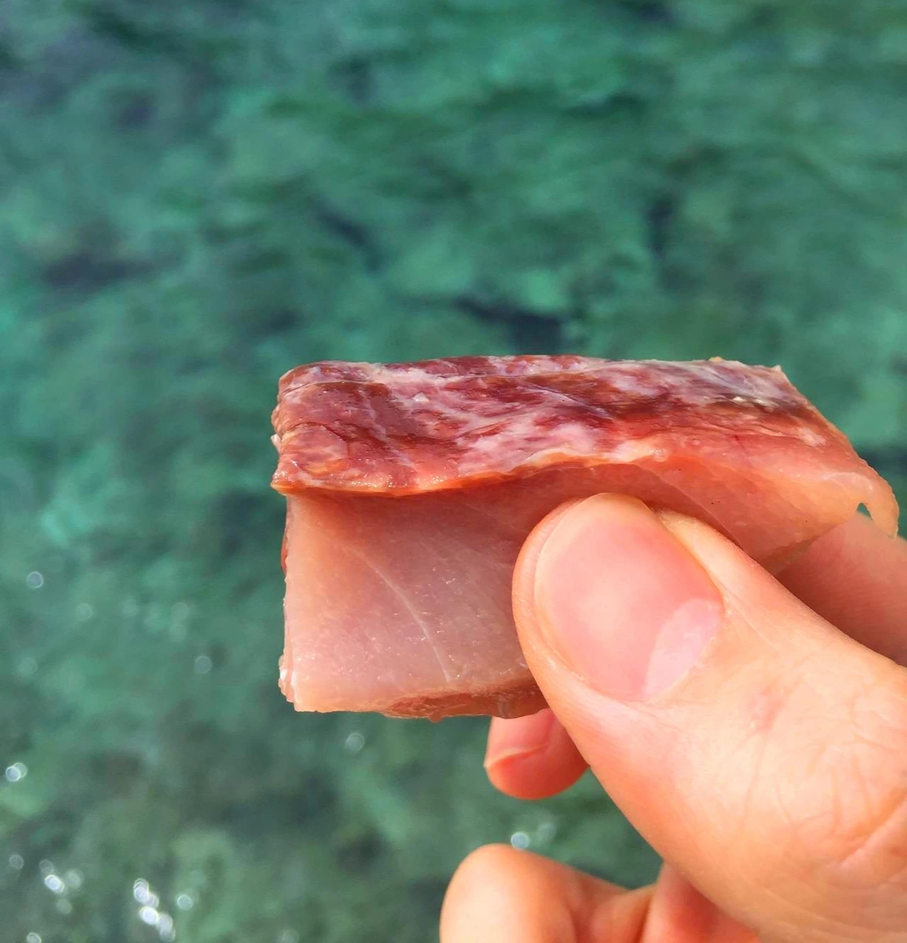 사실 미니락 초입을 지나가면서 스노클링을 하는 사람들 말고도 선착장 위에 모여있는 사람들이 있어 내심 궁금했다. 모여있는 사람들 틈을 비집고 들어가니 사람마다 네모난 깍두기 같은 고깃덩이를 손에 쥐고 있다. 싱싱하고 두툼한 생선 살코기다. 저걸 회처럼 먹는 건가 싶은 찰나, 한 사람이 바다로 휙~ 던진다. 그러자 살코기가 바다에 빠지기 무섭게 물밑 검은 형체가 순식간에 낚아챈다.