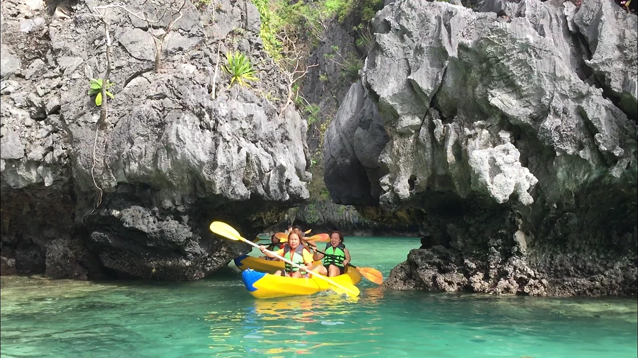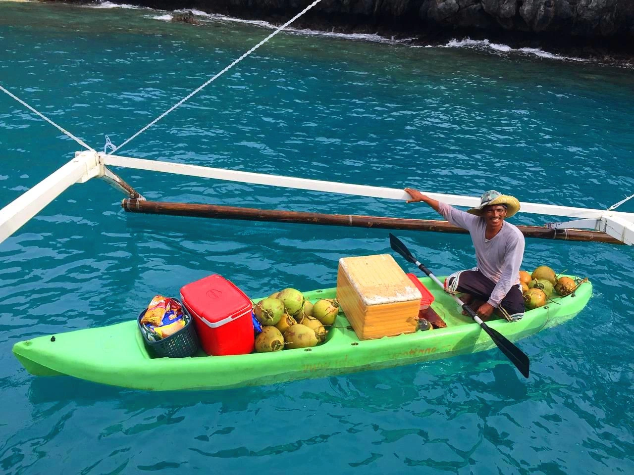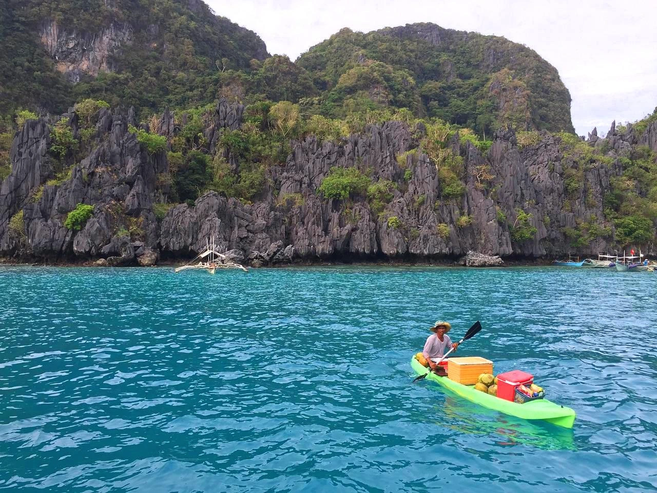 빅 라군으로 가기 위해 다시 방카선에 오른다. 카약 이상무! 필리핀 원정대 이상무! 방카 선원 이상무! 모든 점검도 마쳤겠다 이제 슬슬 시동을 켜고 출발할 준비를 하는데 연두색 카약 위에 빨간색 아이스박스, 둥글둥글 코코넛, 과자 한 바구니를 실은 수상 편의점(?) 아저씨가 접근해 온다. 연두색 카약이 바다색과 제법 잘 어울린다. 거기에 아저씨의 환한 미소는 덤. 하지만 환한 미소에 화답해줄 수 없어 미안할 뿐이다. 아저씨가 원하는 화답은 아니겠지만 뭐라도 해야겠다 싶어 찰칵! 환한 아저씨의 미소를 카메라에 담았다. 별 반응 없는 관광객에게도 끝까지 환한 미소를 잃지 않았던 아저씨의 밝고 따듯한 모습을 기억하며...