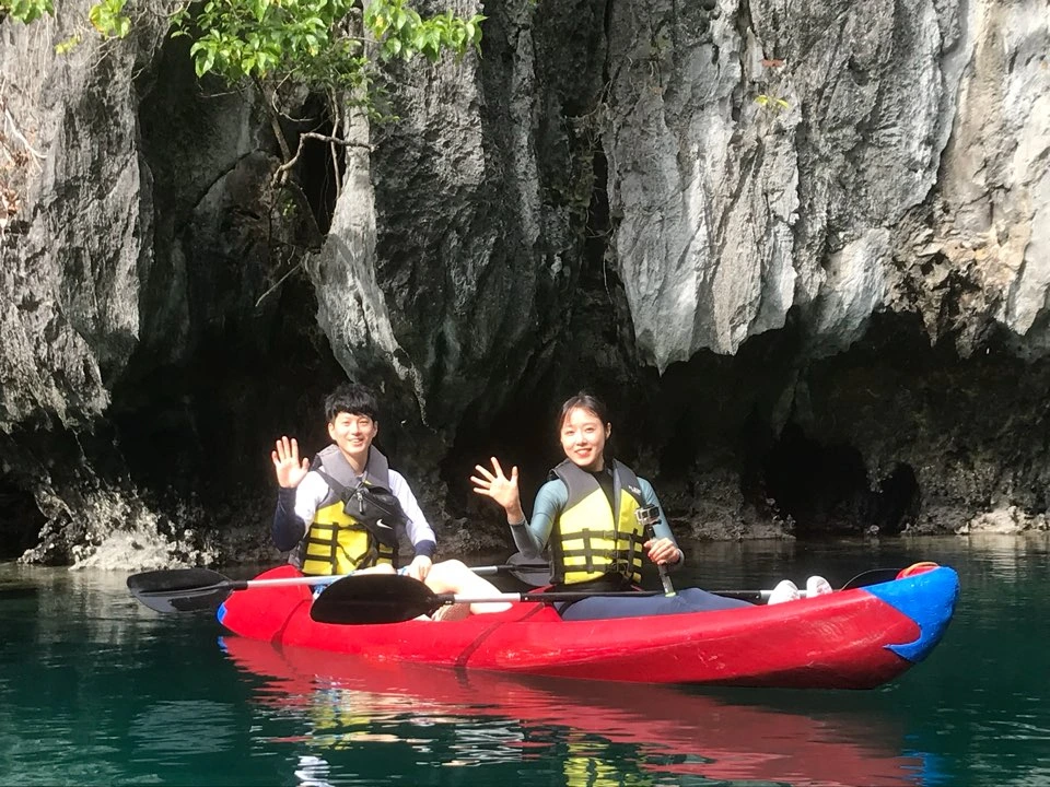 방카선 정차해있는 곳에서 스몰 라군 입구까지의 거리는 약 100m 정도. 얼른 가보고 싶은 마음에 혼자서 힘차게 노를 저어 보지만 카약은 엉뚱한 곳을 향한다. 수심이 얕은 바다 위로 뾰족 솟아 있는 바위들에 이리 쿵! 저리 쿵! 부딪히기를 몇 차례. 급기야 다른 카약과 충돌하는 사태까지 발생. 이대로는 안 되겠다 싶어 구령을 넣어 호흡을 맞춰 본다. 좌, 우로 한 번씩,