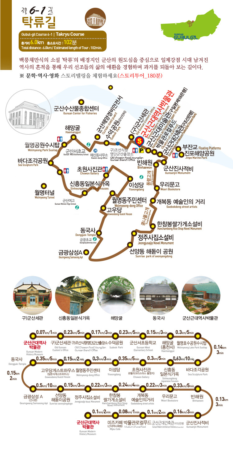 출발-군산 근대역사박물관 > (구) 군산세관 본관/호남 관세박물관 > (구) 미즈상사 > 장미갤러리 > (구) 일본제 18 은행 군산지점/근대미술과 > 장미공연장 > (구) 조선은행 군산지점/근대건축관 > 도착-진포 해양공원(기념품 수령) > 군산 화교 역사관/용문각(보너스! 추가 증정품이 있대요^^)