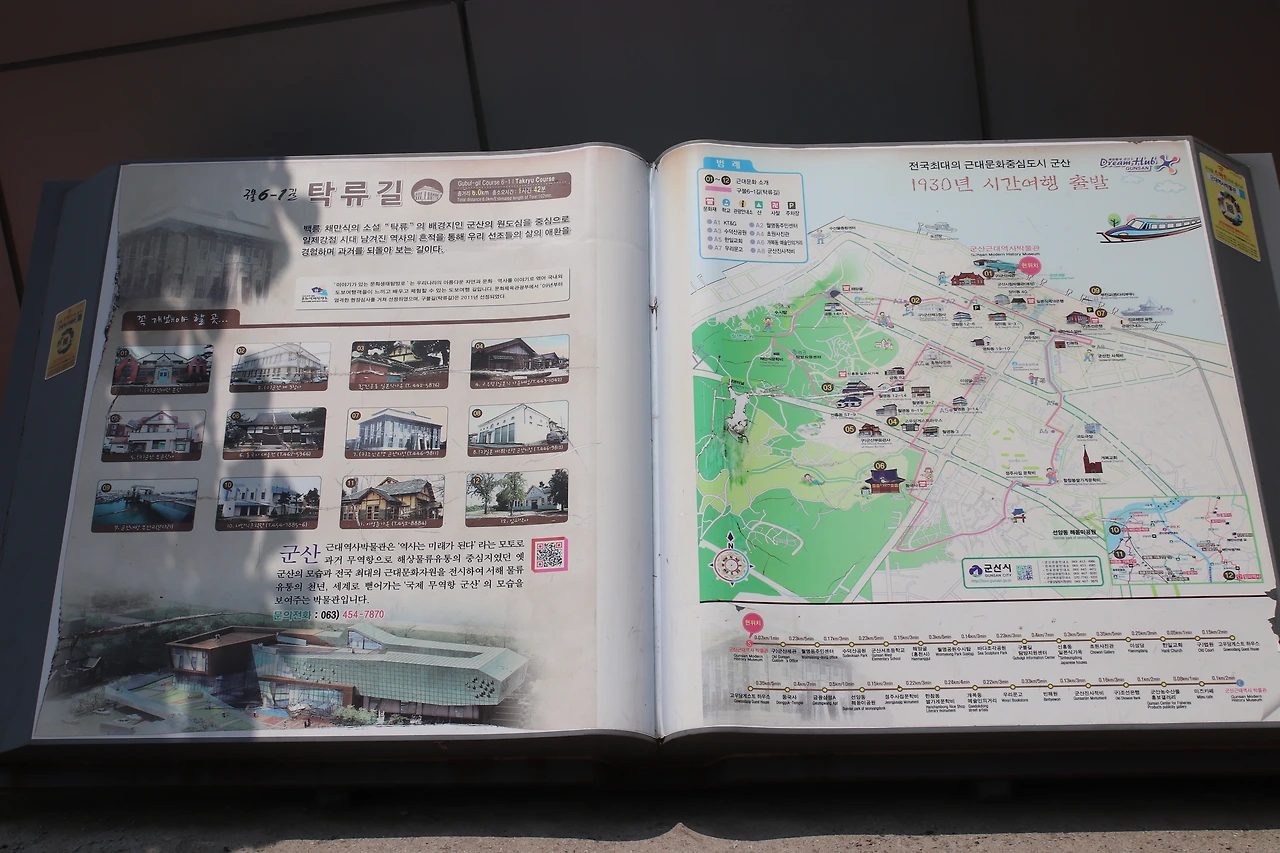 군산 근대역사박물관 정문 앞. 비스듬히 기울어져 펼쳐진 책 조형물이 보인다. 가까이 가보니 오른쪽 페이지에 군산 근대마을지도가 있고, 왼쪽에는 탁류 길이 안내되어 있다.