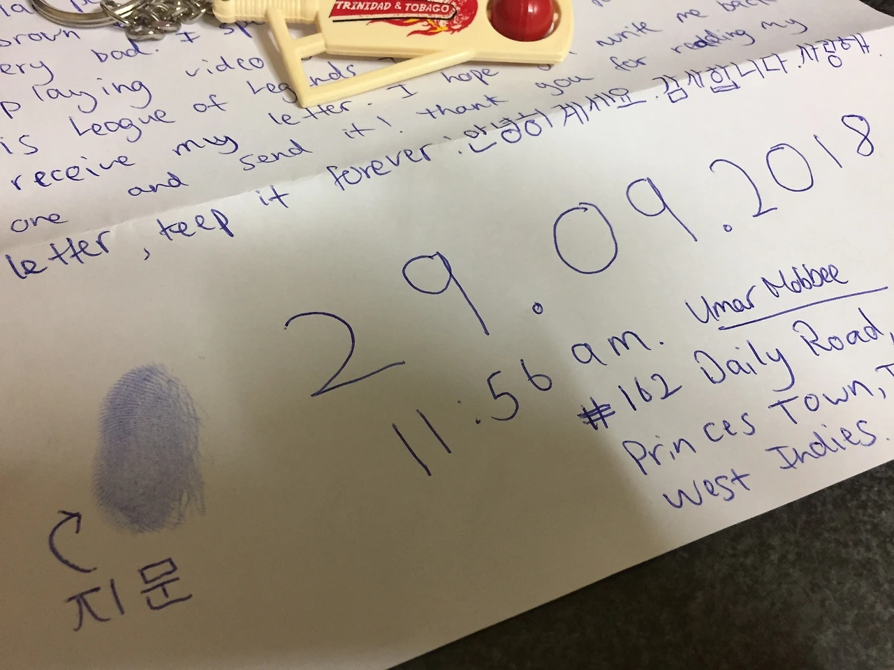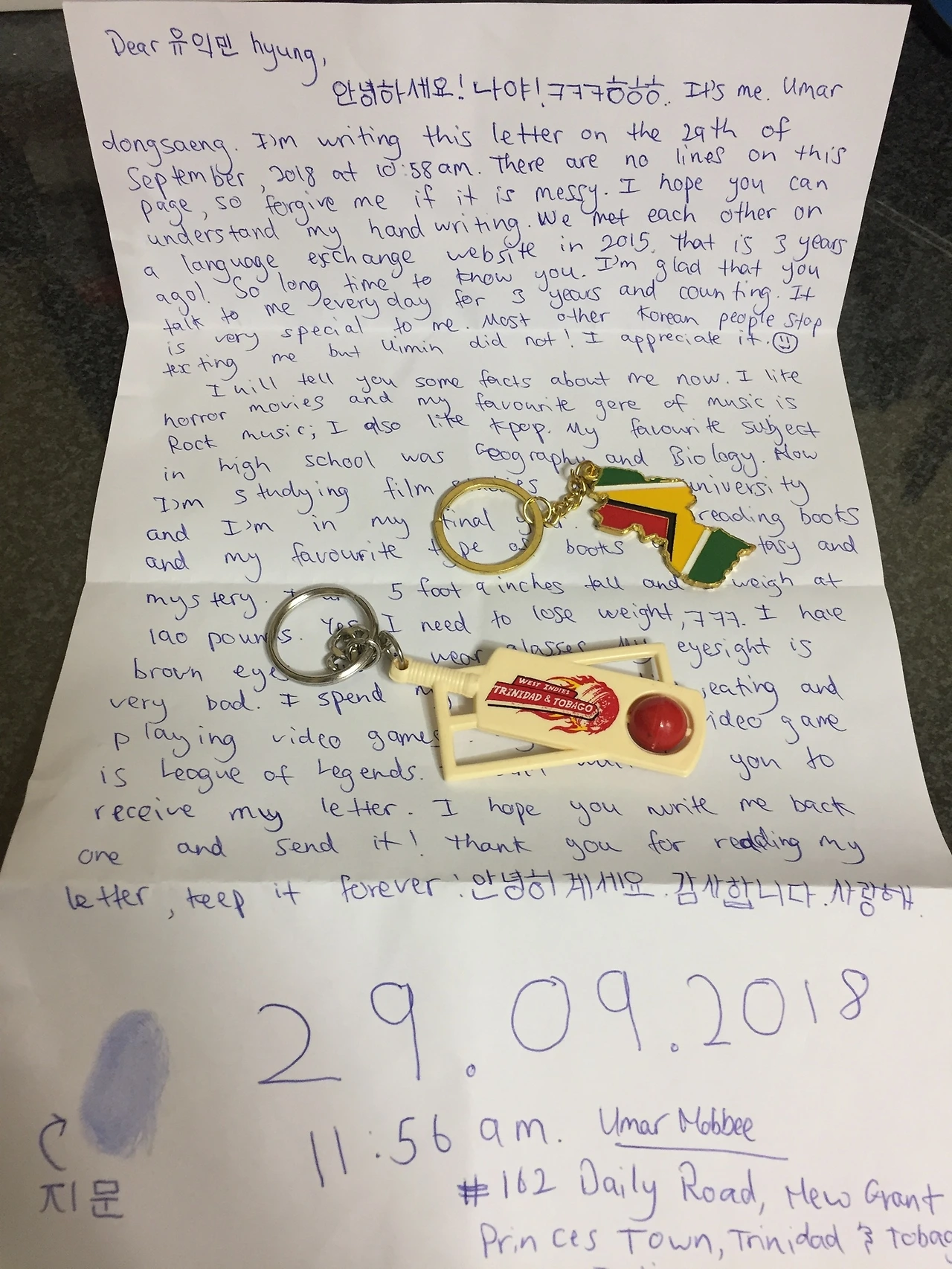 평소 우마르와 편지하자는 이야기를 종종 하곤 했다. 자세히 알아보지는 않았지만 한국과 트리니다드 사이에서 편지를 주고받는 것은 생각보다 까다로웠다. 특히나 나보다도 우마르가, 트리니다드에서 한국으로 보내는 일이 어려웠다. 게다가 나야 직장인인지라 돈문제는 크게 걱정 없었는데 우마르는 이제 갓 대학생이 되어 부모님에게 용돈을 받는 처지라 비용에 대한 부분도 신경을 쓰는 듯했다. 그래서 그냥 깔끔하게 포기! 여기에 한 가지 이유를 더 보태자면 사실 카톡으로 자주 이야기하다 보니 편지에 대한 내 의지가 약하기도 했다.(우마르에겐 조금 미안하지만, 인. 정.^^;;) 포기는 했지만 편지 이야기는 계속 끊이지 않았다. 잊힐만하면 또 하고 또 하고. 언젠가는... 언젠가는.... 마치 이루지 못할 꿈을 이야기하듯.