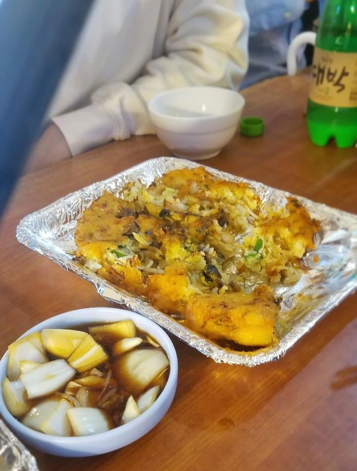 막걸리 한 사발을 다 들이키는 사이 파전과 빈대떡이 나왔다. 젓가락질이 서툴 것 같아 잘게 잘게 나누고 있는데 슉! 슉! 젓가락 네 개가 나누는 족족 낚아채간다.