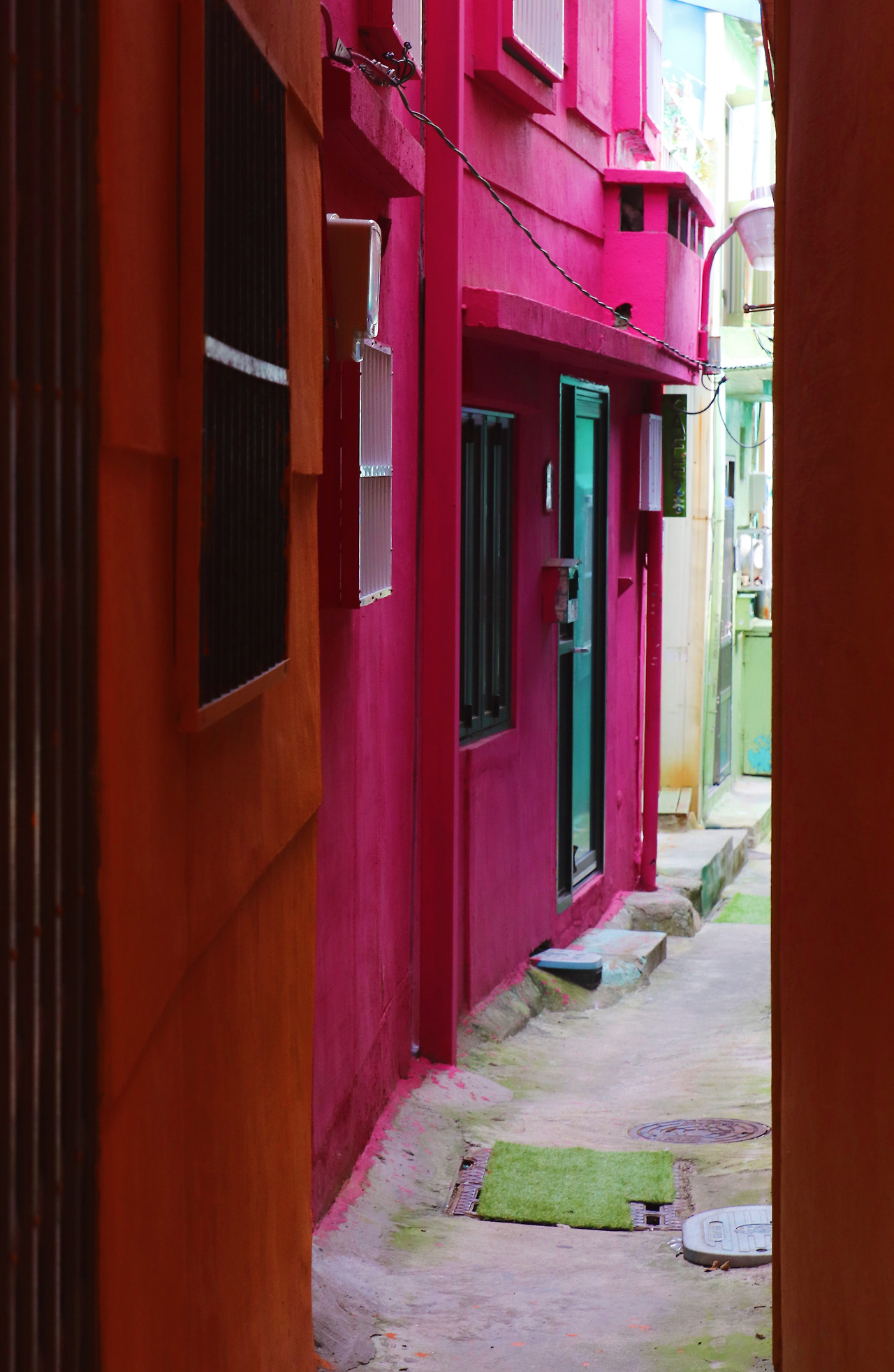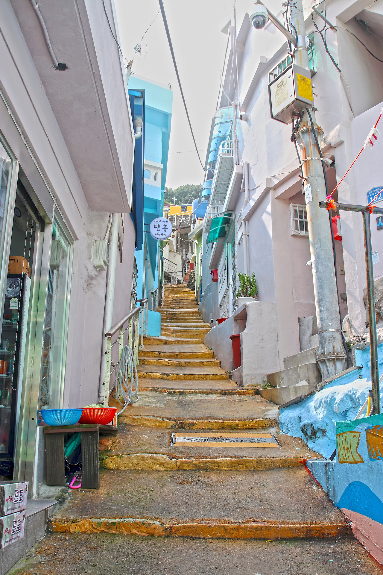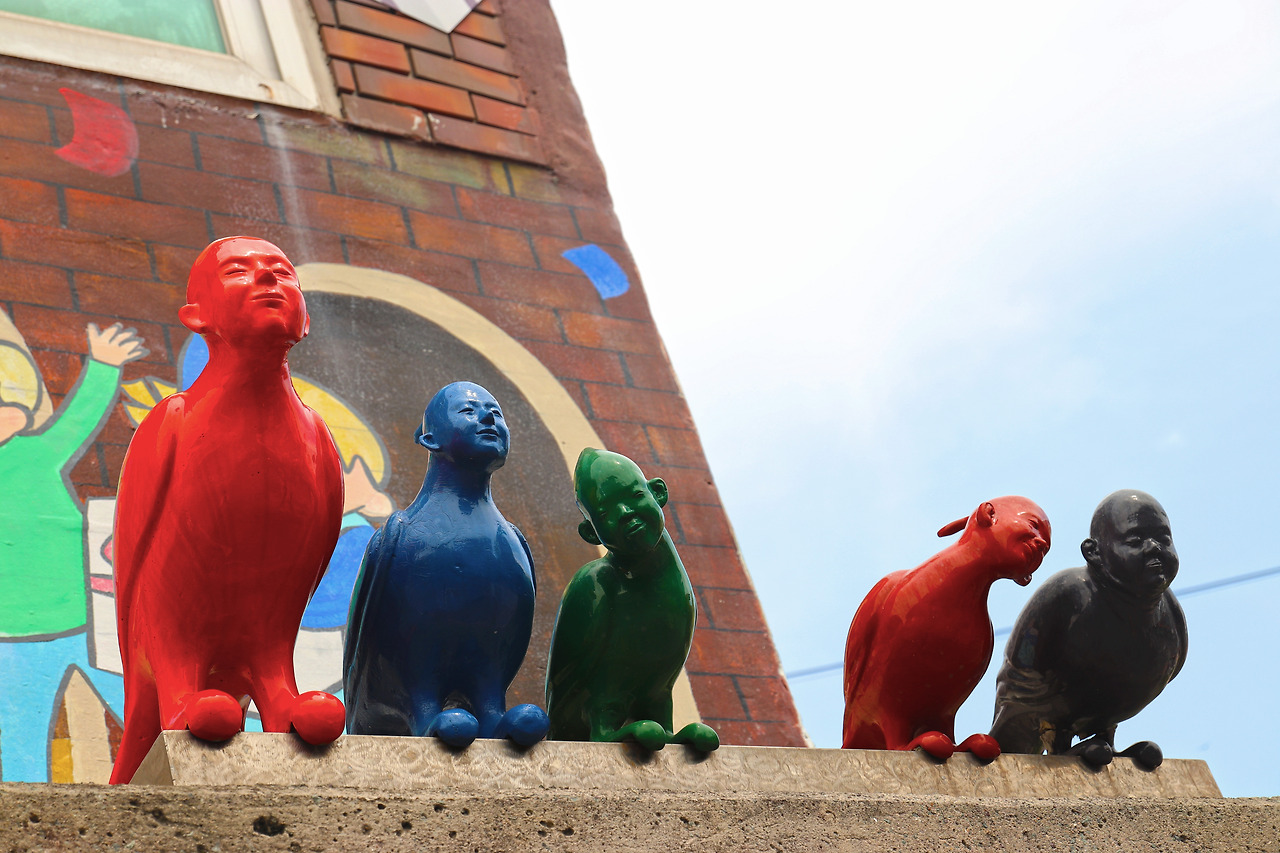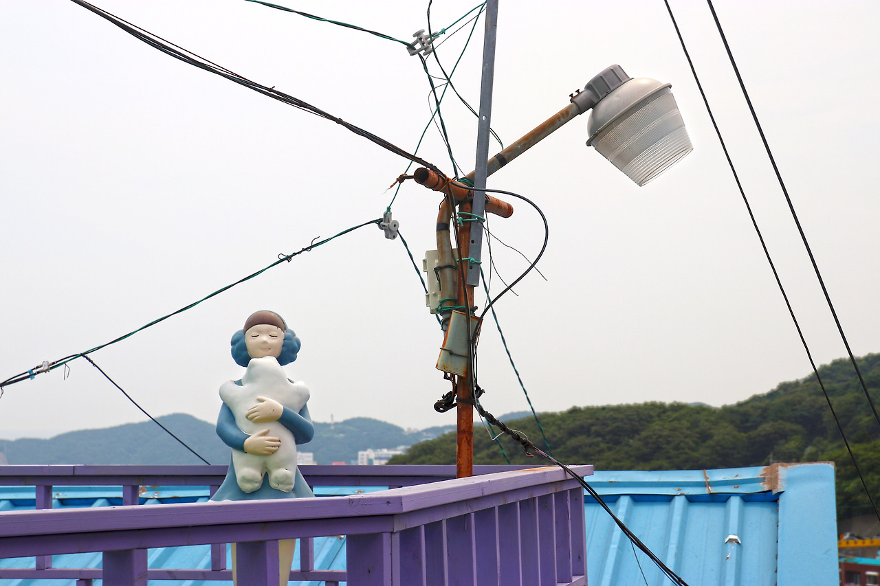 평소 여행에 있어서 만큼은 어디가 좋다더라~ 별로라더라~, 카더라 통신은 철저히 무시하는 편인데 말하는 사람들마다 너무 다 한결같으니 약간의 의심이 들기는 했다. 그렇게 긴가민가한 채 도착한 감천문화마을, 아니나 다를까 딱 듣던 대로였다. 알록달록 파스텔 톤의 건물들, 아기자기한 조형물들, 빽빽한 계단식 집들. 이미 예상했던 그림들이다 보니 아무리 열심히 눈동자를 굴려보아도 특별한 풍경이 눈에 들어오지 않았다. 뭘 찍어야 할지 카메라를 들고 있는 손이 점점 어색해졌다. 그렇게 멍~하니 서있는 사이 다른 멤버들은 뿔뿔이 흩어져 이미 사진 삼매경에 빠져 있었다.