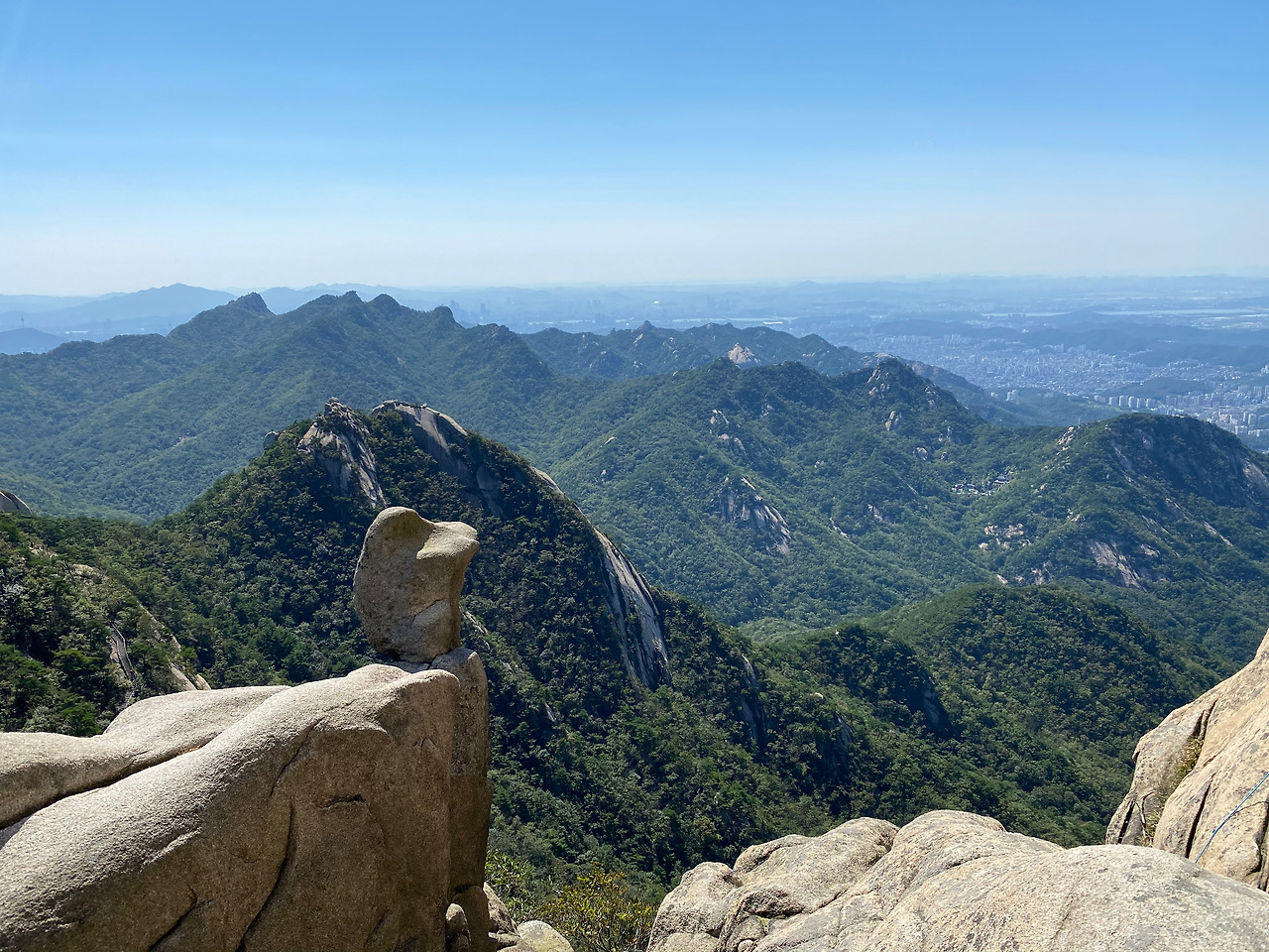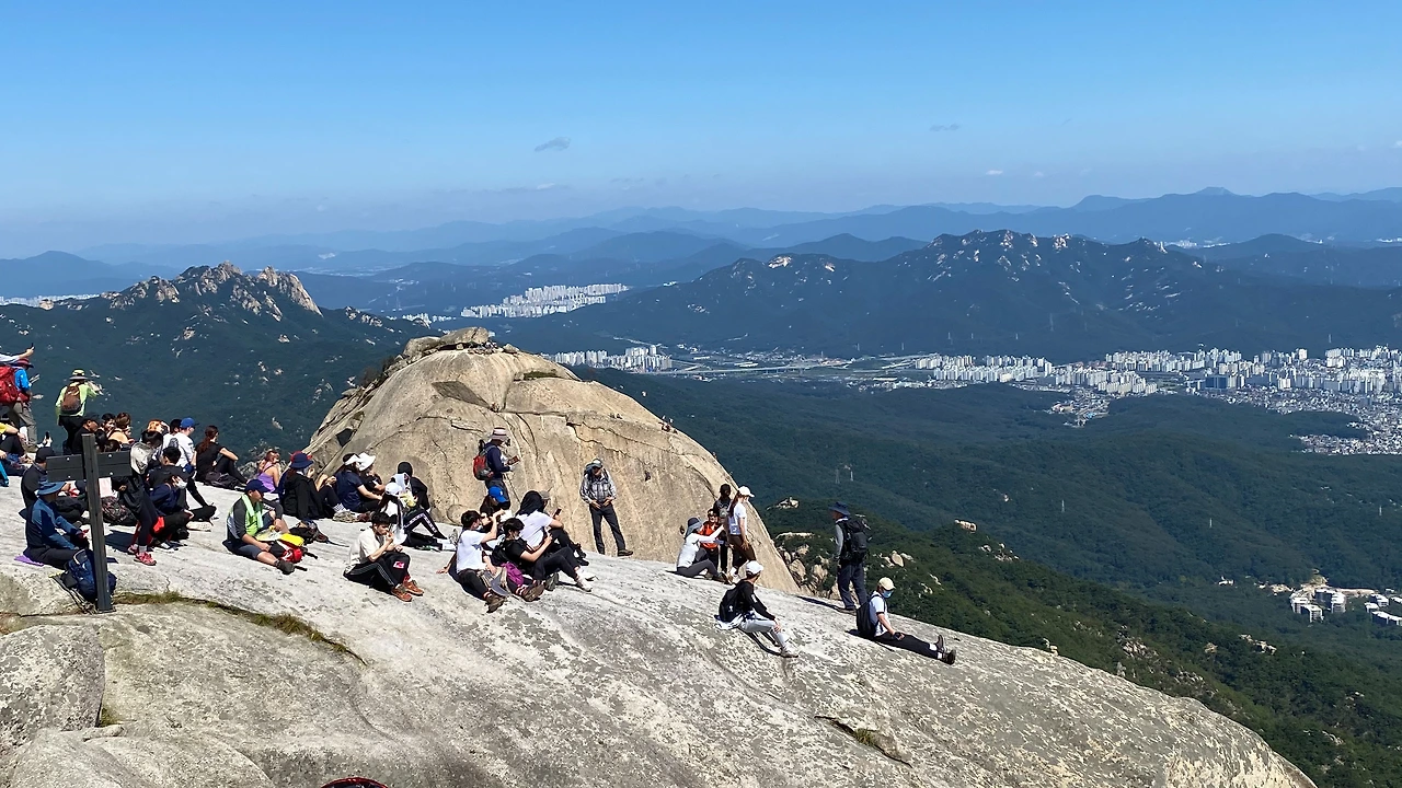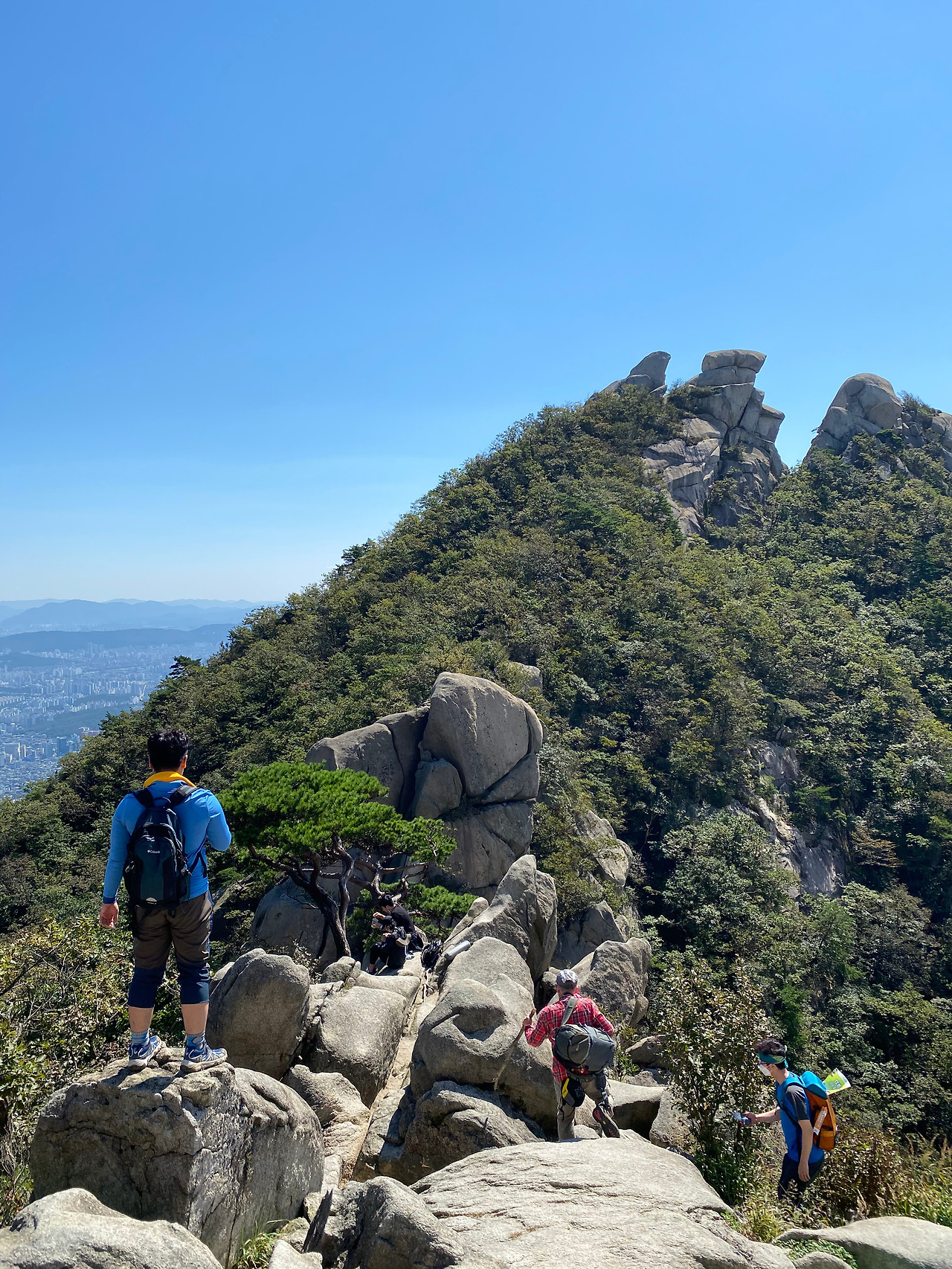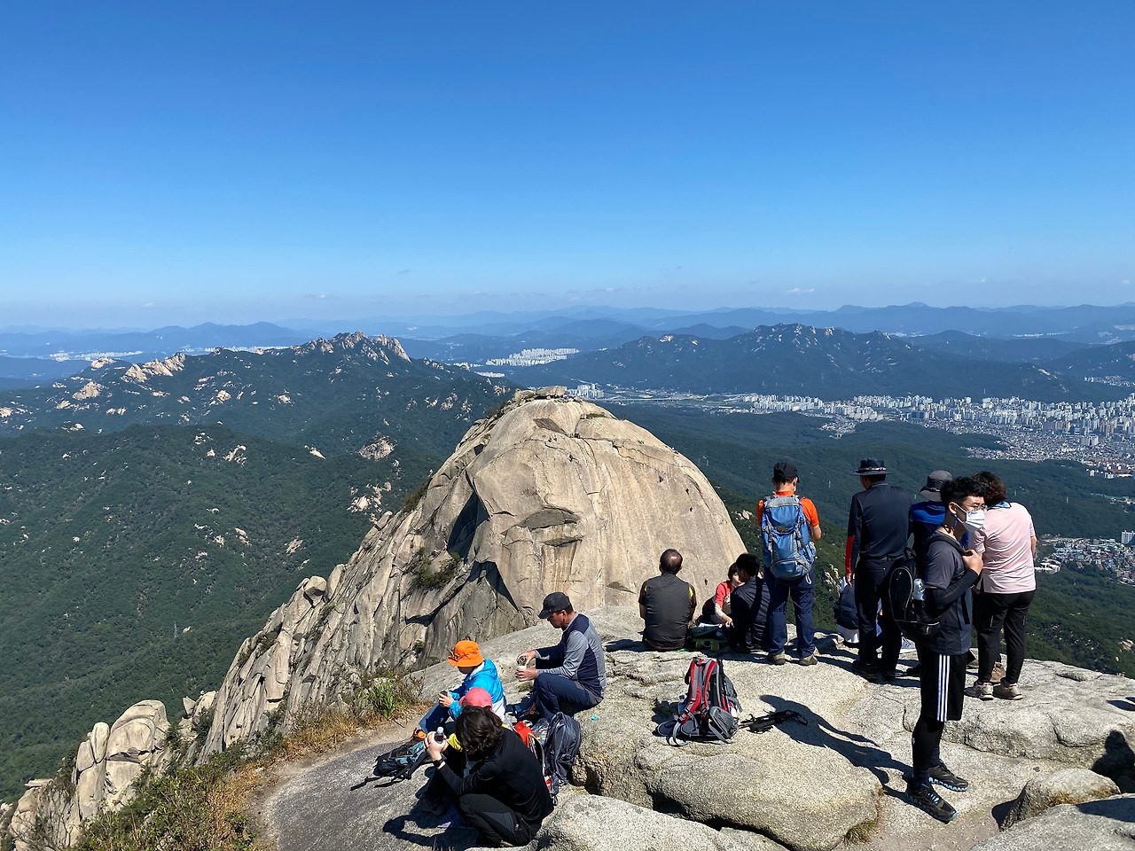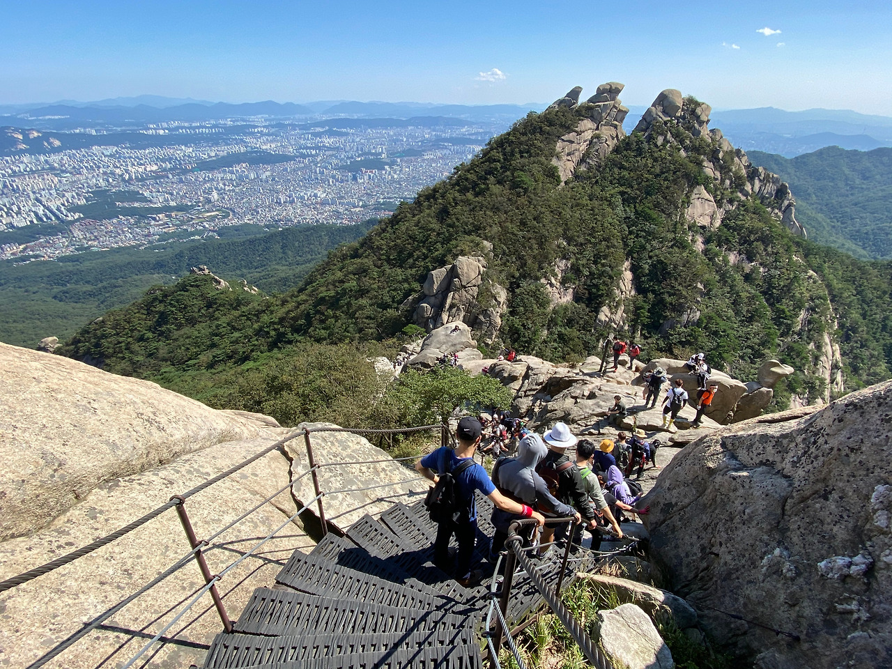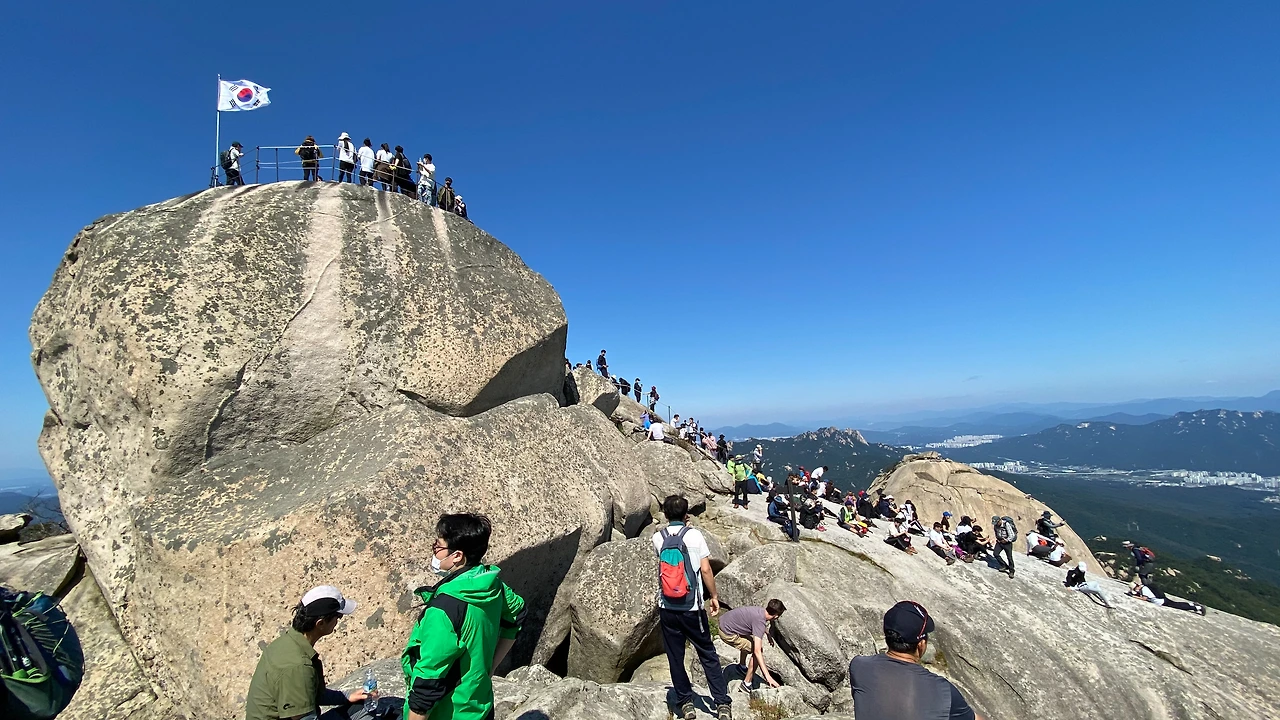 국립공원으로 지정되어 있는 북한산은 명실상부 우리나라의 명산이다. 높이뿐만 아니라 면적면에서도 수도권에서는 단연 으뜸인 만큼 코스도 다양한데, 코스마다 각기 매력이 있어 어디든 많은 사람들로 붐빈다. 모름지기 등산이라면 정상을 찍어야 하는 법. 출발점은 달라도 결국 한 곳에서 만나게 되어 있다. 바로 높이 836m의 북한산 최고봉인 백운대에서. 여러 등산로들 중 백운대로 가는 가장 빠른 길은 백운대 탐방지원센터에서 출발하는 코스다. 최단 코스인 만큼 꾸준히 오르막 길이지만 백운봉암문(구 위문)까지는 산세가 그리 험하지 않다. 백운봉암문을 지나고부터는 약간의 긴장이 필요하다. 험한 산세와 급격한 경사도 그렇지만 정말로 조심해야 할 것은 사람! 워낙 많은 사람들이 오르락내리락 하니 등산로는 항상 정체다. 그 어느 때보다 양보의 미덕이 필요하다. 한 줄로 한 사람씩 천천히, 만약 내려오는 사람이 먼저 진입했다면 잠시 숨도 고를 겸 기꺼이 기다리자. 고개만 살짝 돌리면 인수봉, 만경대, 그리고 서울의 풍경이 한눈에 담기니 기다리는 시간이 결코 지루하지 않다. 양보의 미덕과 함께 또 한 가지 필요한 덕목은 기다림. 백운대는 정상석, 태극기와 함께 인증숏을 찍으려는 사람들로 문전성시다. 하지만 걱정 마시라! 백운대에서의 절경을 감상하다 보면 어느새 정상석과 태극기가 바로 내 앞에 와있을 테니.