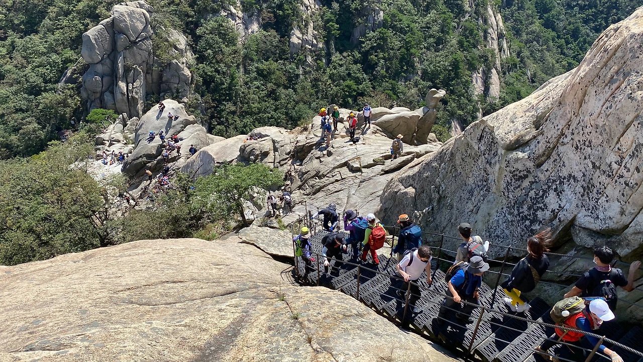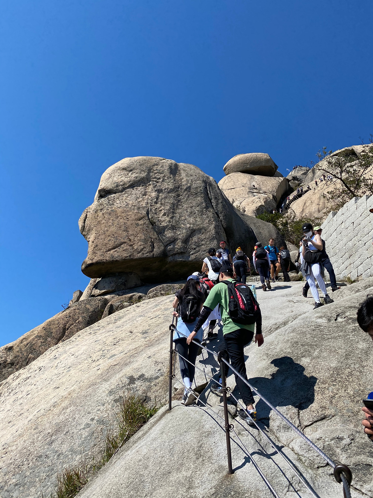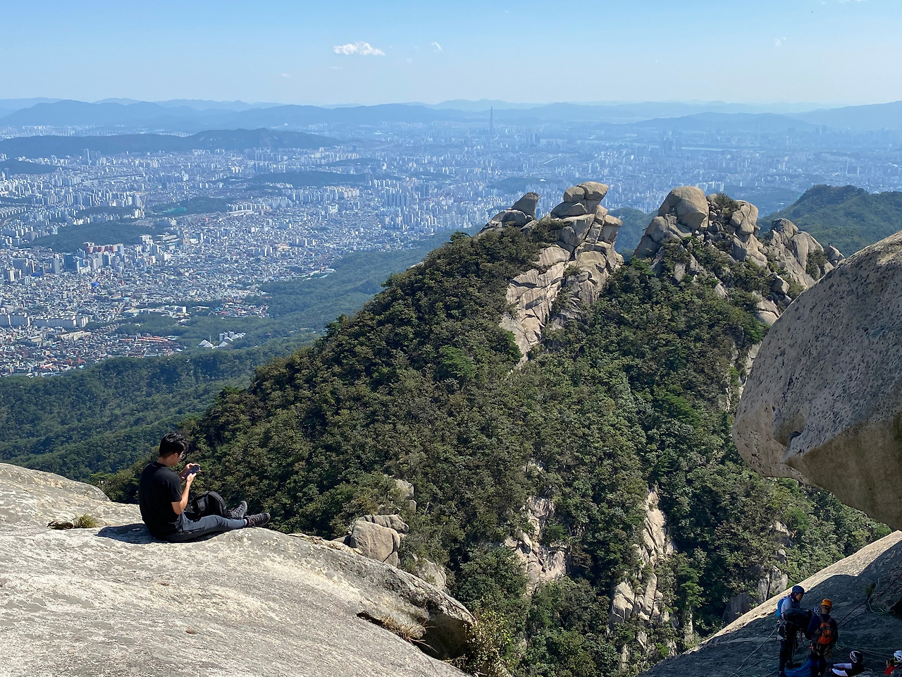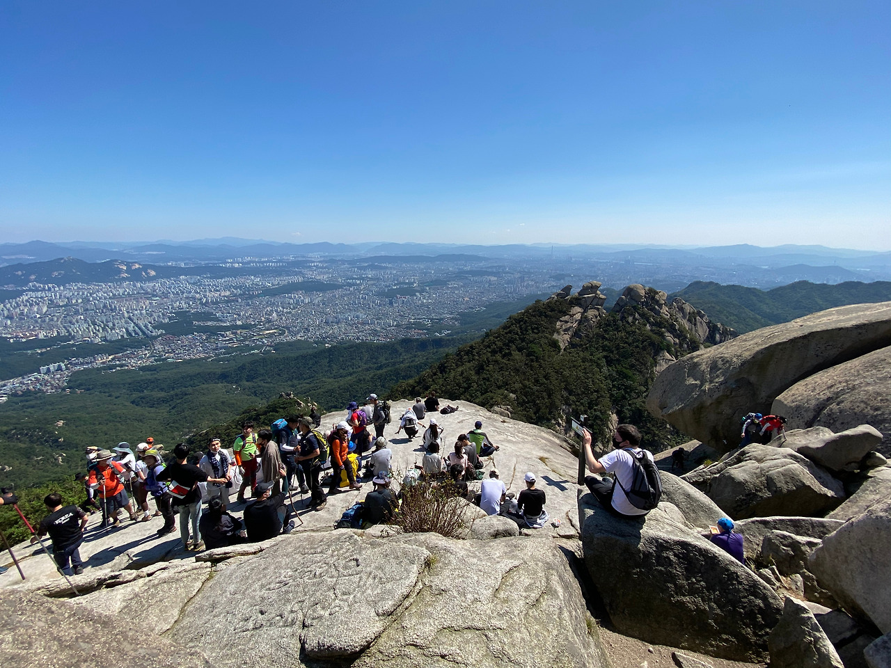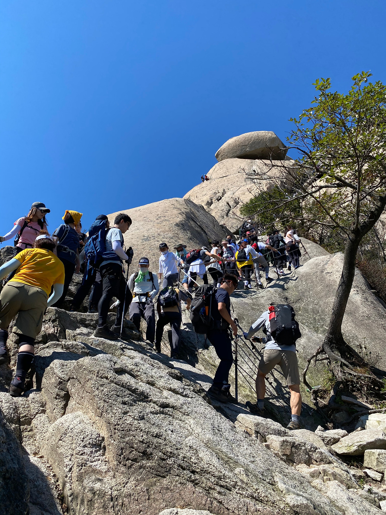 국립공원으로 지정되어 있는 북한산은 명실상부 우리나라의 명산이다. 높이뿐만 아니라 면적면에서도 수도권에서는 단연 으뜸인 만큼 코스도 다양한데, 코스마다 각기 매력이 있어 어디든 많은 사람들로 붐빈다. 모름지기 등산이라면 정상을 찍어야 하는 법. 출발점은 달라도 결국 한 곳에서 만나게 되어 있다. 바로 높이 836m의 북한산 최고봉인 백운대에서. 여러 등산로들 중 백운대로 가는 가장 빠른 길은 백운대 탐방지원센터에서 출발하는 코스다. 최단 코스인 만큼 꾸준히 오르막 길이지만 백운봉암문(구 위문)까지는 산세가 그리 험하지 않다. 백운봉암문을 지나고부터는 약간의 긴장이 필요하다. 험한 산세와 급격한 경사도 그렇지만 정말로 조심해야 할 것은 사람! 워낙 많은 사람들이 오르락내리락 하니 등산로는 항상 정체다. 그 어느 때보다 양보의 미덕이 필요하다. 한 줄로 한 사람씩 천천히, 만약 내려오는 사람이 먼저 진입했다면 잠시 숨도 고를 겸 기꺼이 기다리자. 고개만 살짝 돌리면 인수봉, 만경대, 그리고 서울의 풍경이 한눈에 담기니 기다리는 시간이 결코 지루하지 않다. 양보의 미덕과 함께 또 한 가지 필요한 덕목은 기다림. 백운대는 정상석, 태극기와 함께 인증숏을 찍으려는 사람들로 문전성시다. 하지만 걱정 마시라! 백운대에서의 절경을 감상하다 보면 어느새 정상석과 태극기가 바로 내 앞에 와있을 테니.