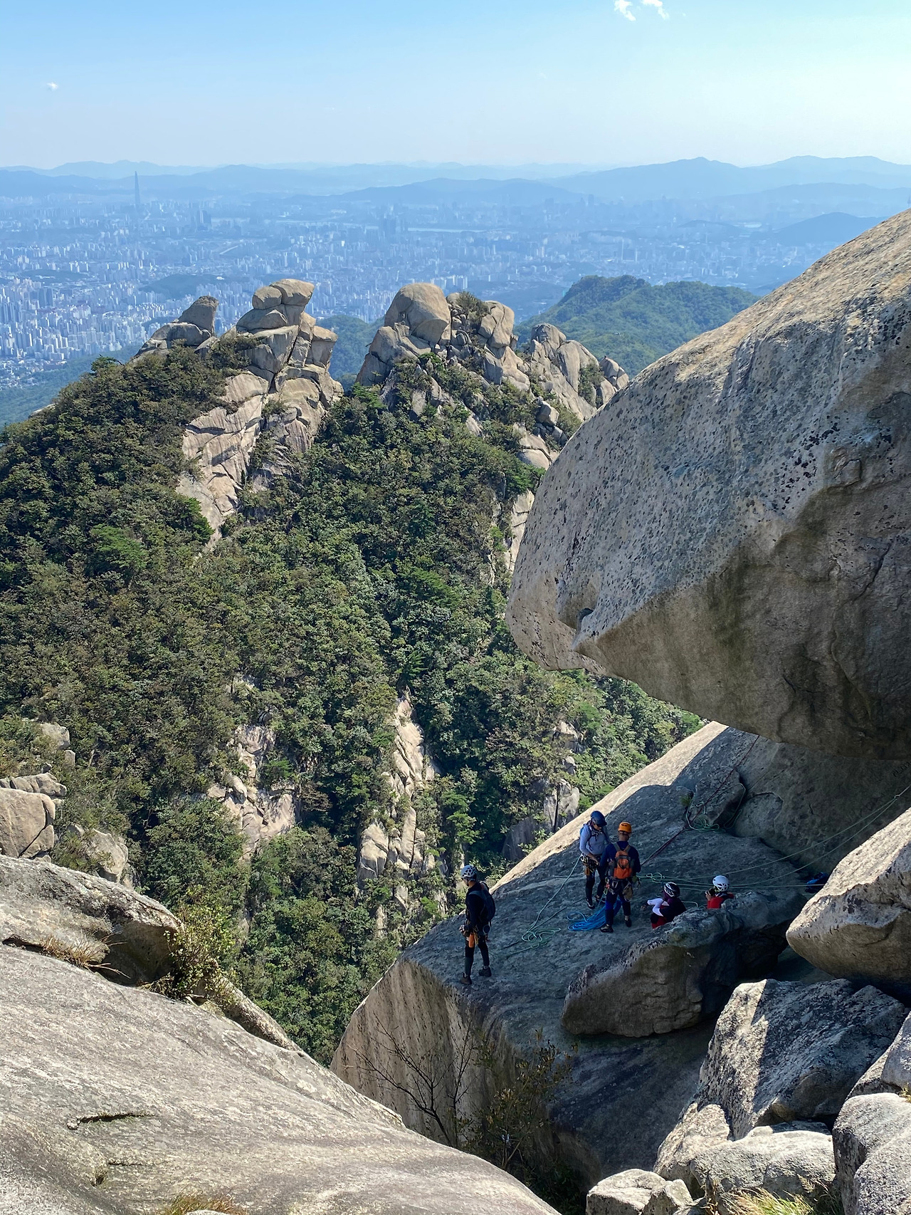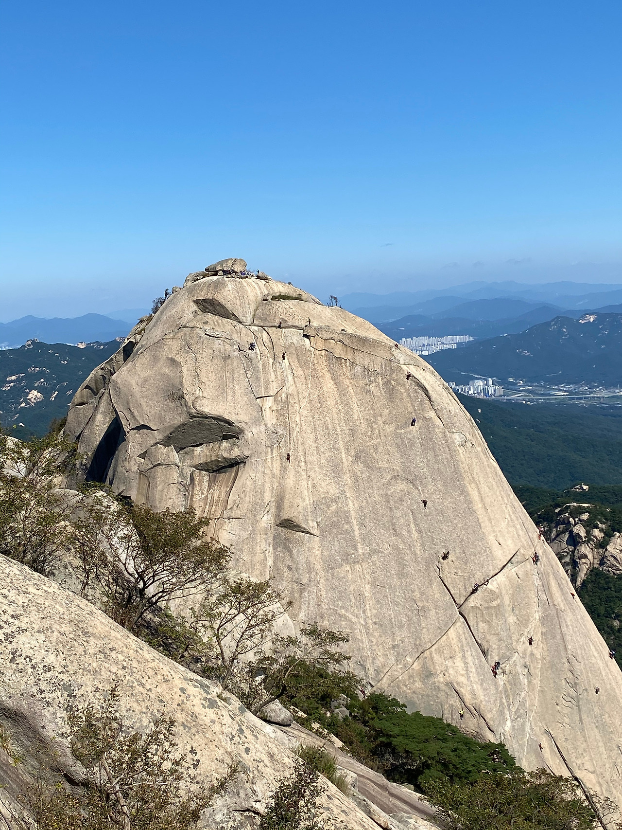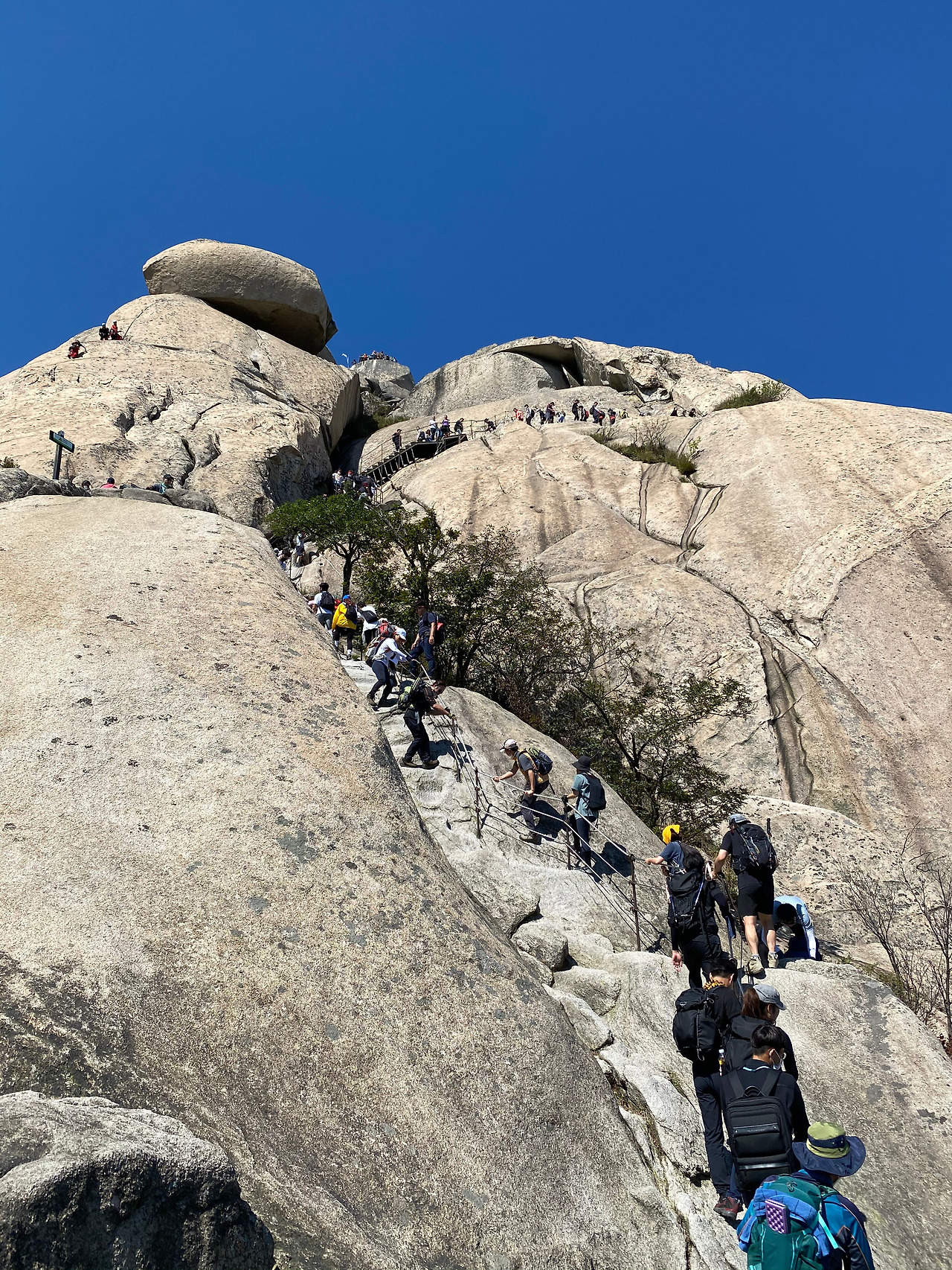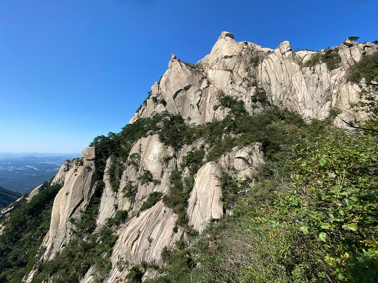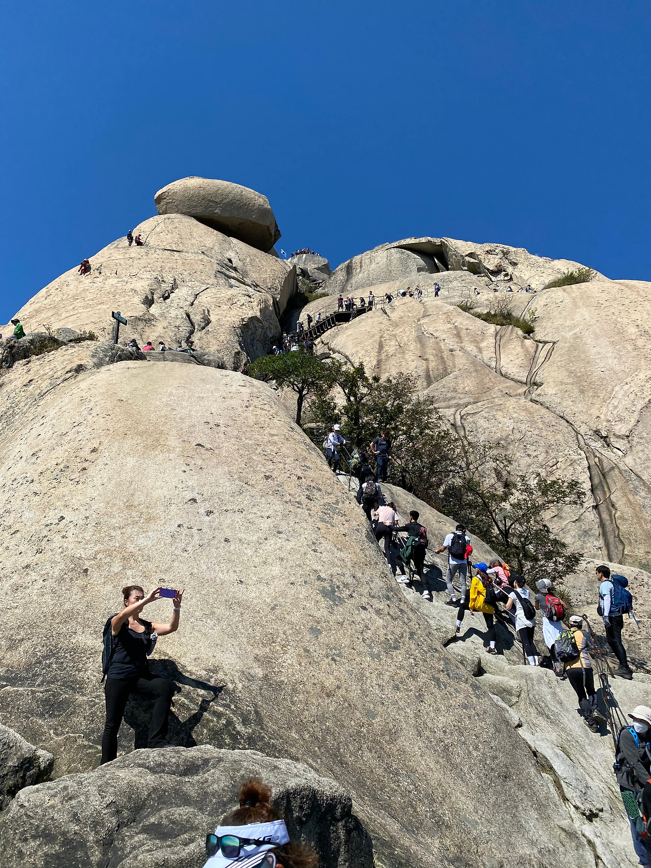 국립공원으로 지정되어 있는 북한산은 명실상부 우리나라의 명산이다. 높이뿐만 아니라 면적면에서도 수도권에서는 단연 으뜸인 만큼 코스도 다양한데, 코스마다 각기 매력이 있어 어디든 많은 사람들로 붐빈다. 모름지기 등산이라면 정상을 찍어야 하는 법. 출발점은 달라도 결국 한 곳에서 만나게 되어 있다. 바로 높이 836m의 북한산 최고봉인 백운대에서. 여러 등산로들 중 백운대로 가는 가장 빠른 길은 백운대 탐방지원센터에서 출발하는 코스다. 최단 코스인 만큼 꾸준히 오르막 길이지만 백운봉암문(구 위문)까지는 산세가 그리 험하지 않다. 백운봉암문을 지나고부터는 약간의 긴장이 필요하다. 험한 산세와 급격한 경사도 그렇지만 정말로 조심해야 할 것은 사람! 워낙 많은 사람들이 오르락내리락 하니 등산로는 항상 정체다. 그 어느 때보다 양보의 미덕이 필요하다. 한 줄로 한 사람씩 천천히, 만약 내려오는 사람이 먼저 진입했다면 잠시 숨도 고를 겸 기꺼이 기다리자. 고개만 살짝 돌리면 인수봉, 만경대, 그리고 서울의 풍경이 한눈에 담기니 기다리는 시간이 결코 지루하지 않다. 양보의 미덕과 함께 또 한 가지 필요한 덕목은 기다림. 백운대는 정상석, 태극기와 함께 인증숏을 찍으려는 사람들로 문전성시다. 하지만 걱정 마시라! 백운대에서의 절경을 감상하다 보면 어느새 정상석과 태극기가 바로 내 앞에 와있을 테니.