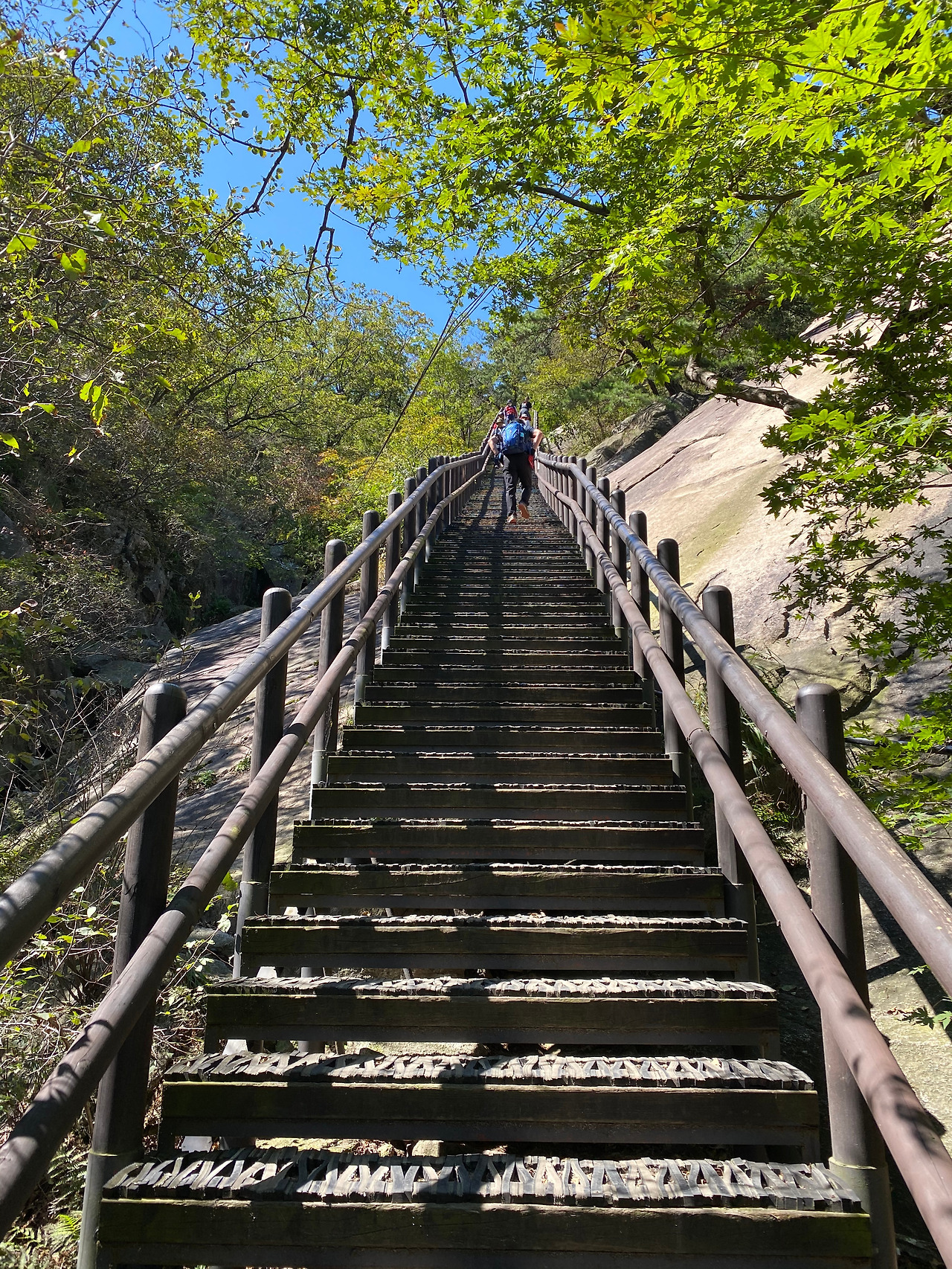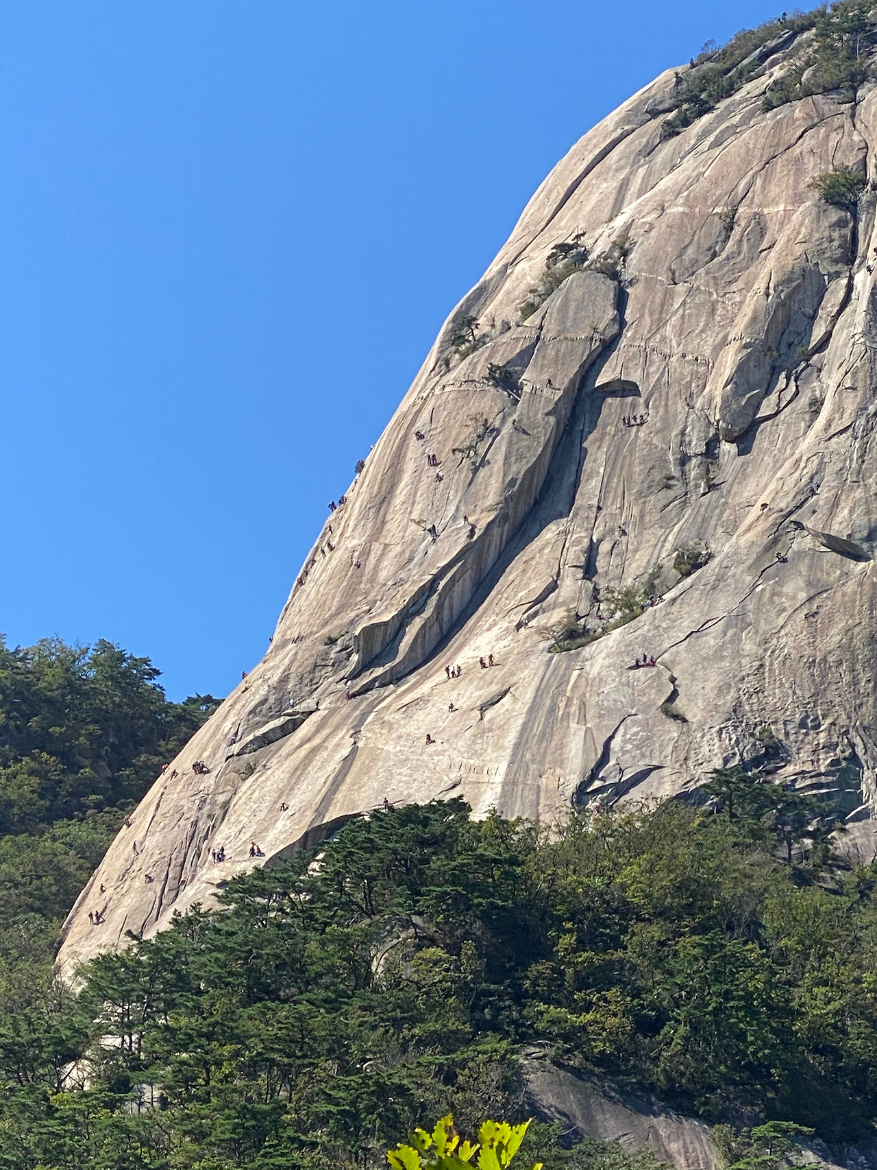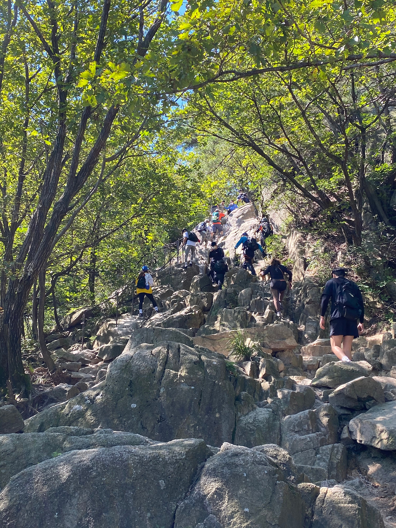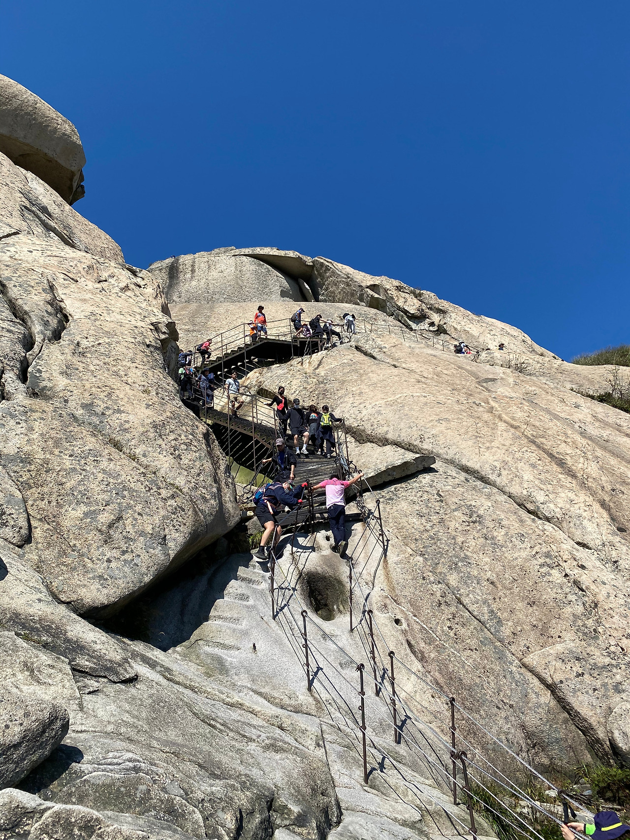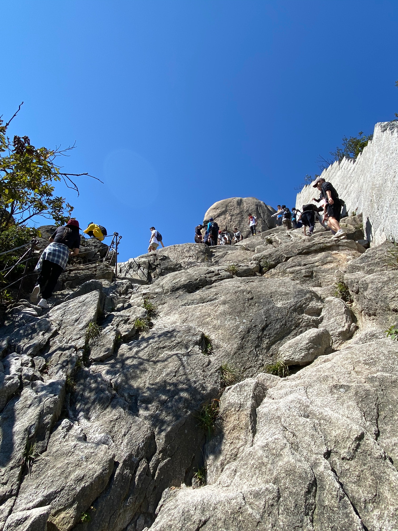 국립공원으로 지정되어 있는 북한산은 명실상부 우리나라의 명산이다. 높이뿐만 아니라 면적면에서도 수도권에서는 단연 으뜸인 만큼 코스도 다양한데, 코스마다 각기 매력이 있어 어디든 많은 사람들로 붐빈다. 모름지기 등산이라면 정상을 찍어야 하는 법. 출발점은 달라도 결국 한 곳에서 만나게 되어 있다. 바로 높이 836m의 북한산 최고봉인 백운대에서. 여러 등산로들 중 백운대로 가는 가장 빠른 길은 백운대 탐방지원센터에서 출발하는 코스다. 최단 코스인 만큼 꾸준히 오르막 길이지만 백운봉암문(구 위문)까지는 산세가 그리 험하지 않다. 백운봉암문을 지나고부터는 약간의 긴장이 필요하다. 험한 산세와 급격한 경사도 그렇지만 정말로 조심해야 할 것은 사람! 워낙 많은 사람들이 오르락내리락 하니 등산로는 항상 정체다. 그 어느 때보다 양보의 미덕이 필요하다. 한 줄로 한 사람씩 천천히, 만약 내려오는 사람이 먼저 진입했다면 잠시 숨도 고를 겸 기꺼이 기다리자. 고개만 살짝 돌리면 인수봉, 만경대, 그리고 서울의 풍경이 한눈에 담기니 기다리는 시간이 결코 지루하지 않다. 양보의 미덕과 함께 또 한 가지 필요한 덕목은 기다림. 백운대는 정상석, 태극기와 함께 인증숏을 찍으려는 사람들로 문전성시다. 하지만 걱정 마시라! 백운대에서의 절경을 감상하다 보면 어느새 정상석과 태극기가 바로 내 앞에 와있을 테니.
