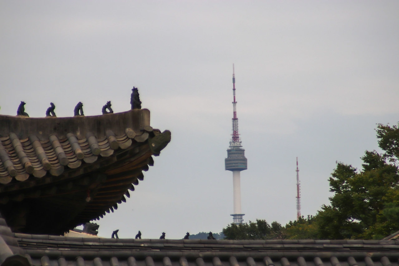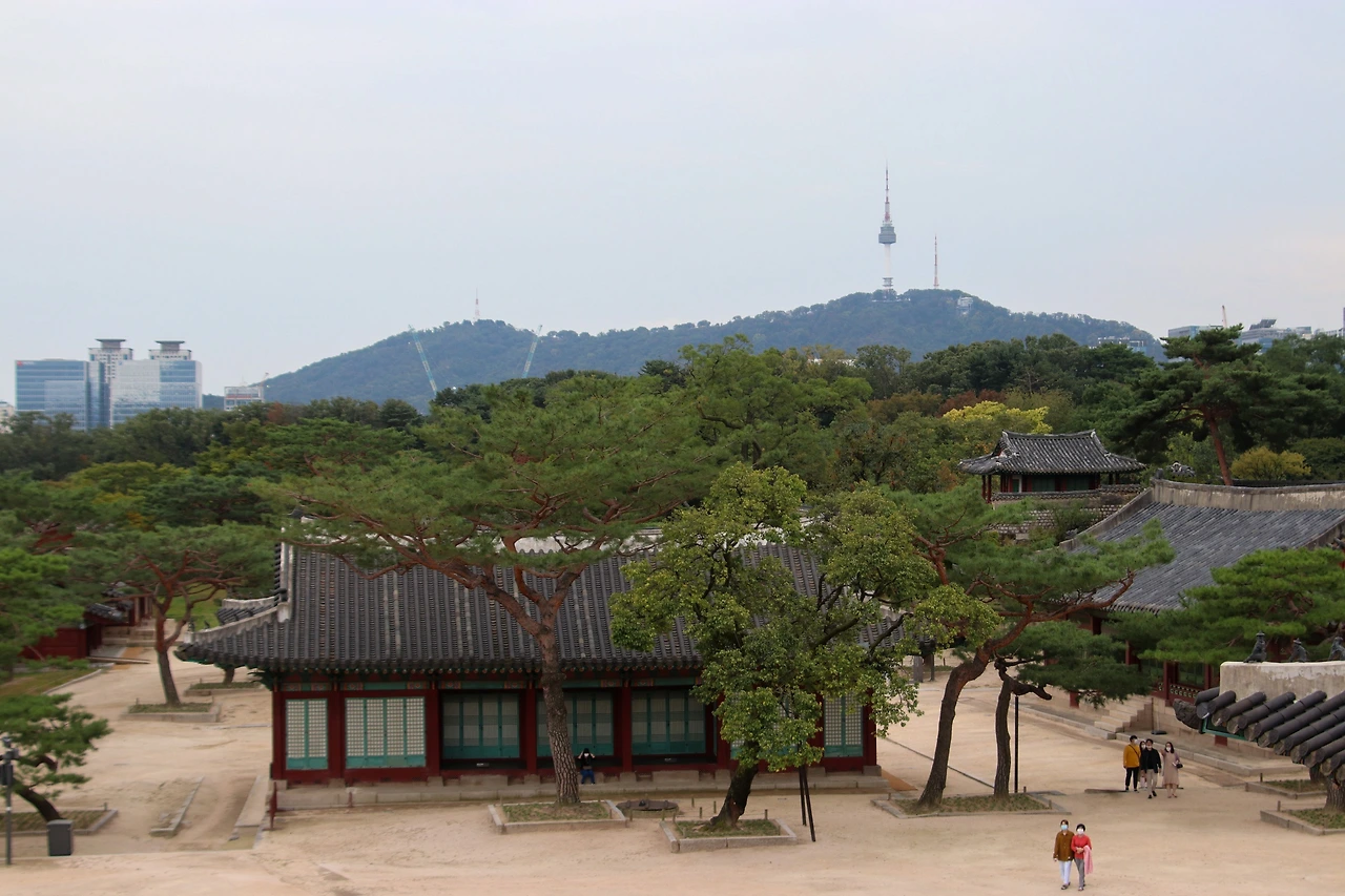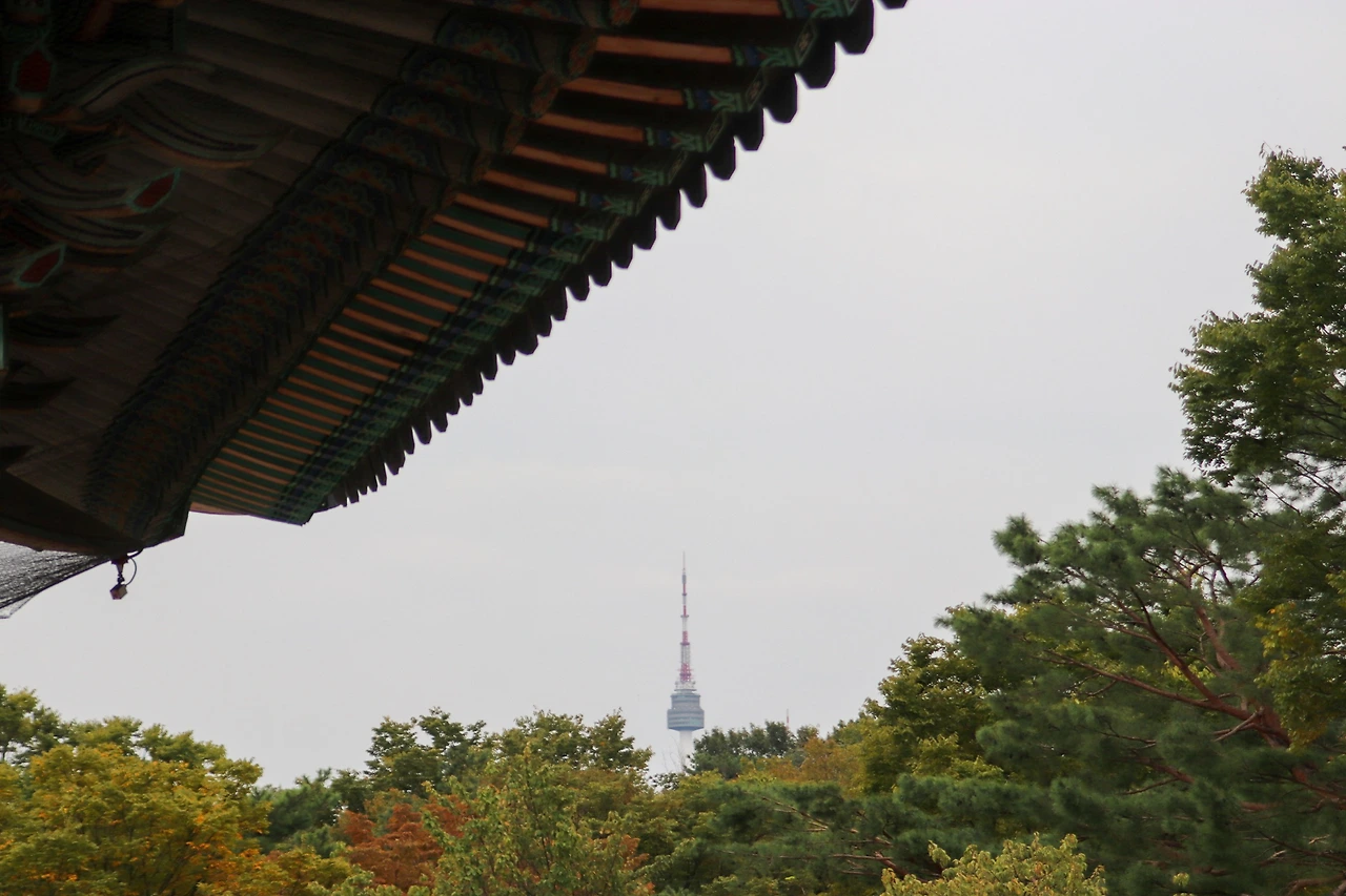 한복을 입고 오기로 한 멤버들 연락을 받고 먼저 궁으로 들어왔다. 경복궁은 몇 번 가본 적이 있었지만 창경궁은(서울에서 30년 넘게 살았는데도) 태어나 처음이었다. 경복궁에 비해 소박한 느낌이었다. 군더더기가 없다고나 할까? 근데 그래서 그런지 카메라에 담고 싶다 할만한 풍경이 눈에 딱 들어오지 않았다. 평소 수평 맞추고 찍는 기본 중에 기본인 정면 구도를 즐겨 찍기는 하지만(그나마 그게 가장 쉬워서) 이번만큼은 피하고 싶었다. 꼴에 출사 한 번 다녀왔다고 평소와는 다른 사진을 찍어보고 싶었기 때문이다. 모름지기 좋은 사진이란 세심한 관찰력에서 나온다 했으니 기와지붕 하나하나까지 매의 눈으로 살폈다. 그러자 하나 눈에 잡히는 게 있었다. 바로 남산서울타워! 식상하지만 과거와 현대의 조화! 난 창경궁 속 숨은 남산 찾기를 시작했다.