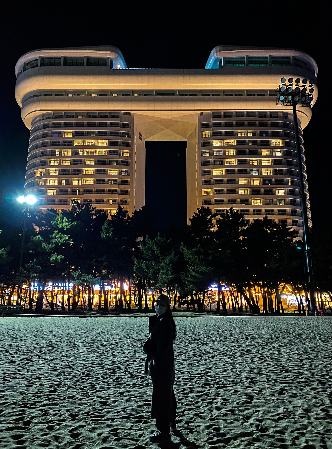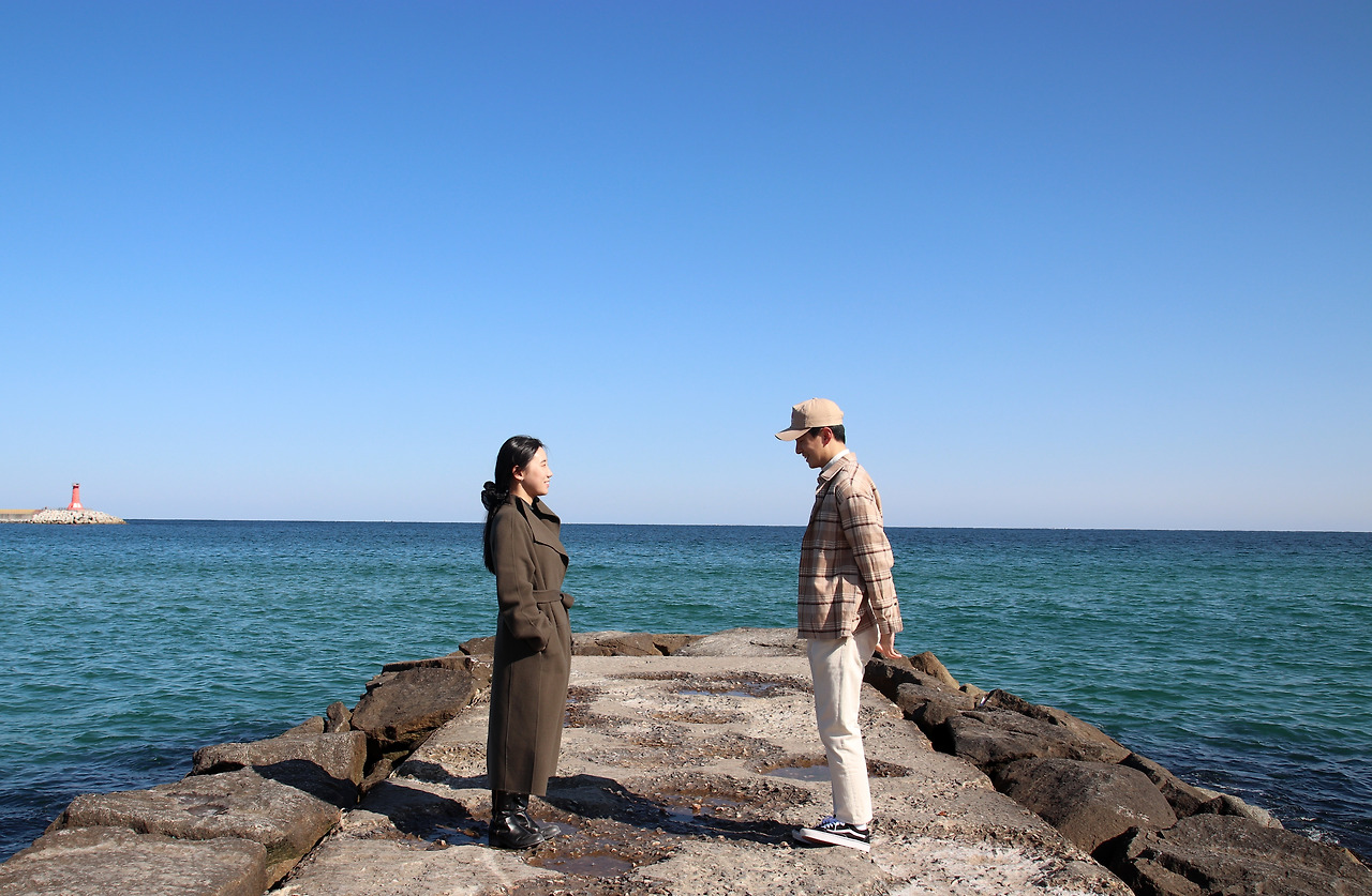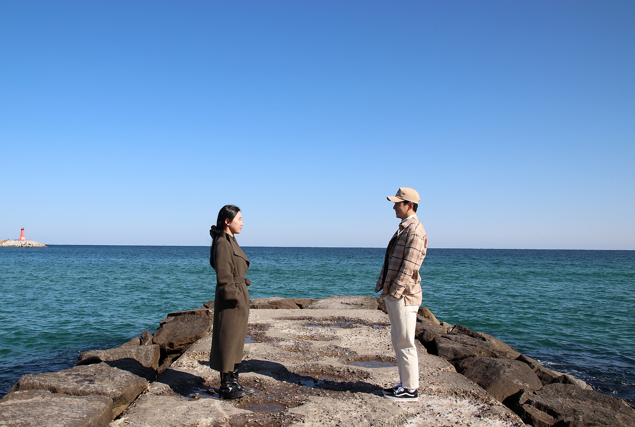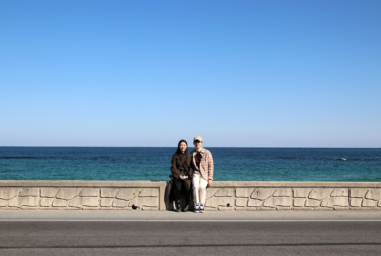 이게 벌써 4년 전이라니!? 4년이나 된 드라마도 놀랍지만 더 놀라운 건 4년이나 지났음에도 도깨비 촬영지로 유명한 영진해변은 여전히 강릉의 핫플이라는 사실이다. 평일이기도 했고, 이른 오전이니 한적한 분위기 속에서 오붓하게 인증샷 겸 인생샷 좀 남겨볼까 했는데 우리의 예상을 빗나갔다. 사진 찍는 우리의 모습에서 오붓함은 찾아보기 힘들었다. 신경 안 써야지 했지만 곁눈질로 레이저를 쏘고 있는 뒷사람들 눈치가 살살 보였다. 그렇게 헐레벌떡 찍은 커플사진. 인생샷까지는 아니지만 다행히 인증은 제대로 된 것 같았다. 하지만 짝꿍의 표정은 좋지 않았다. 이유는 분명했다. 미안하다, 공유가 아니라서.