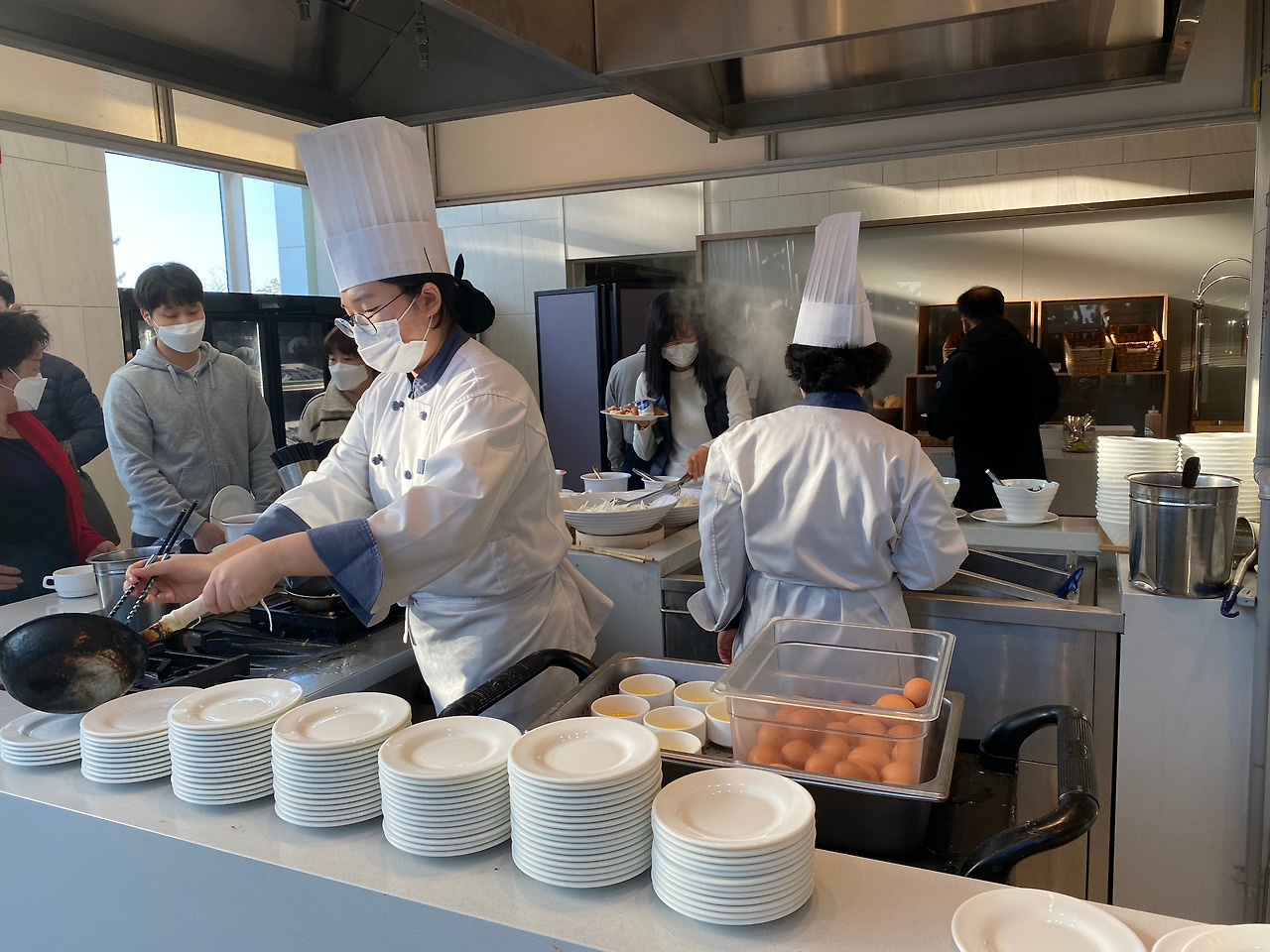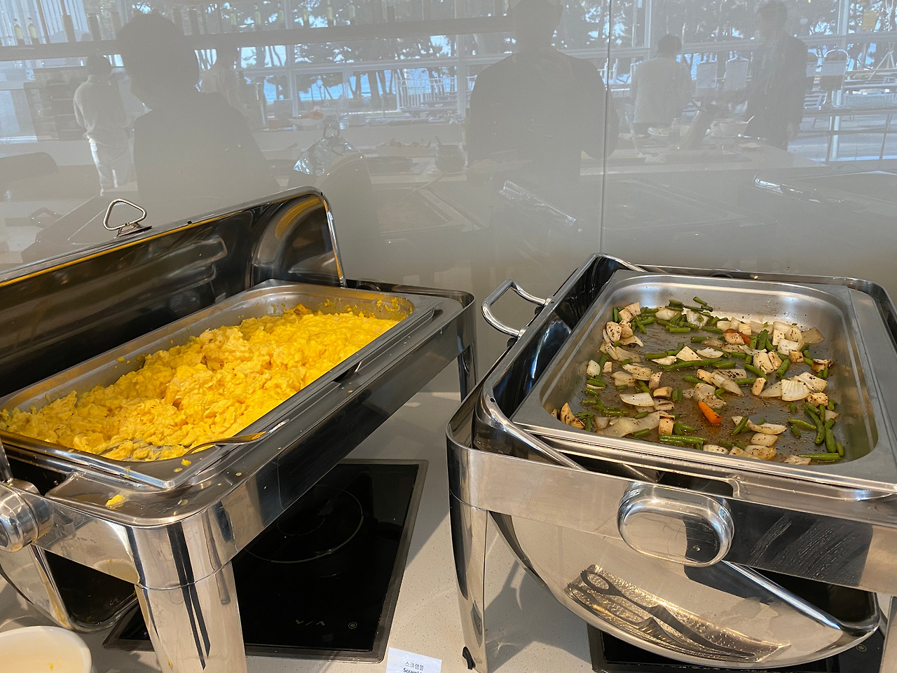 오전 8시. 내게는 이른 아침인데도 부지런히들 옷까지 차려입고 조식을 먹으러 온 사람들로 바글바글했다. 스크램블드 에그, 베이컨, 해쉬 브라운, 소시지, 두부 등의 메인 메뉴를 기본으로 간편하게 먹을 수 있는 베이커리와 시리얼은 물론 즉석요리코너에서는 오믈렛을 만들어 주었다. 음식은 역시 바로바로 해서 따듯하게 먹는 게 제맛! 오믈렛이 가장 인기 있었다.