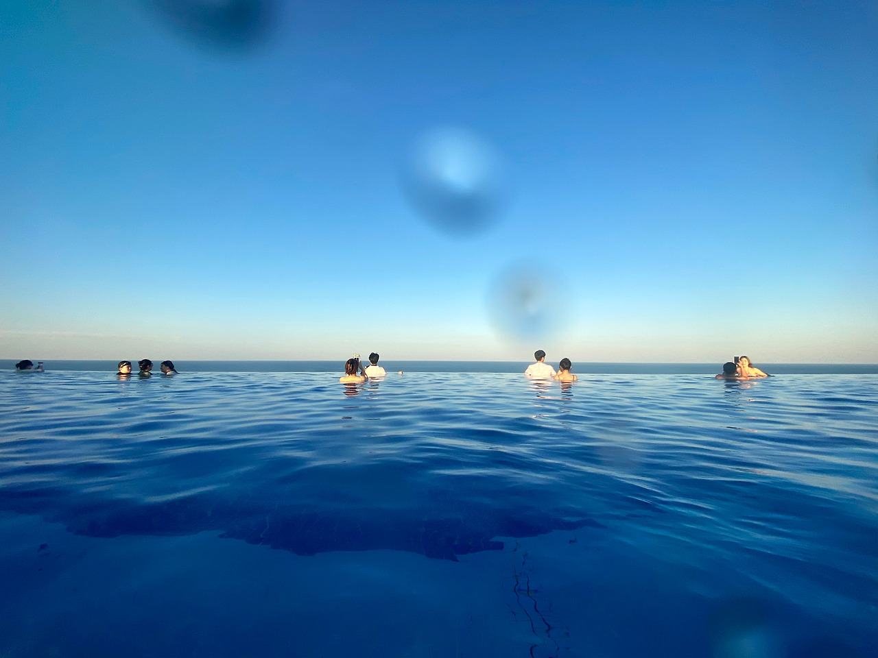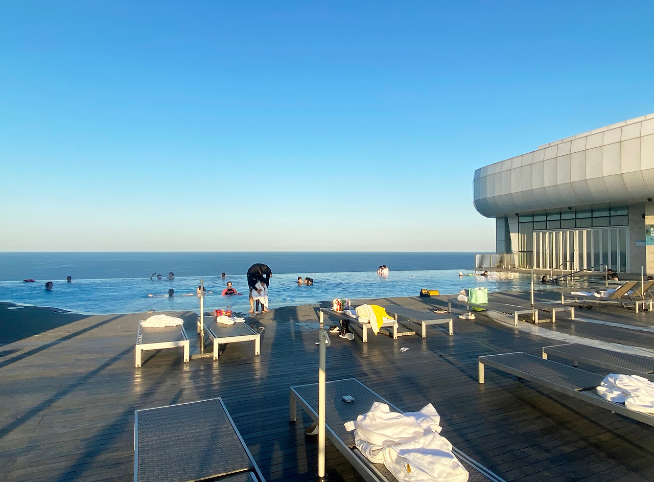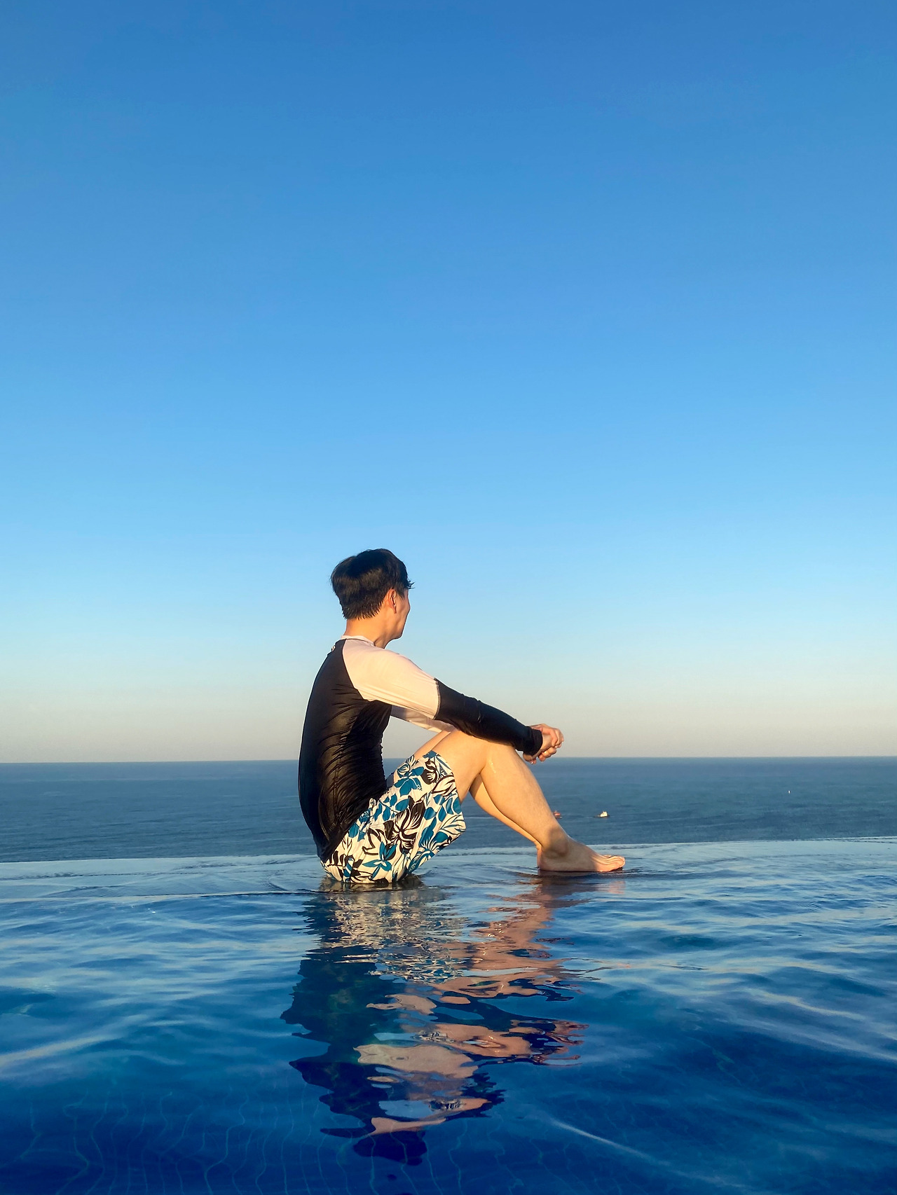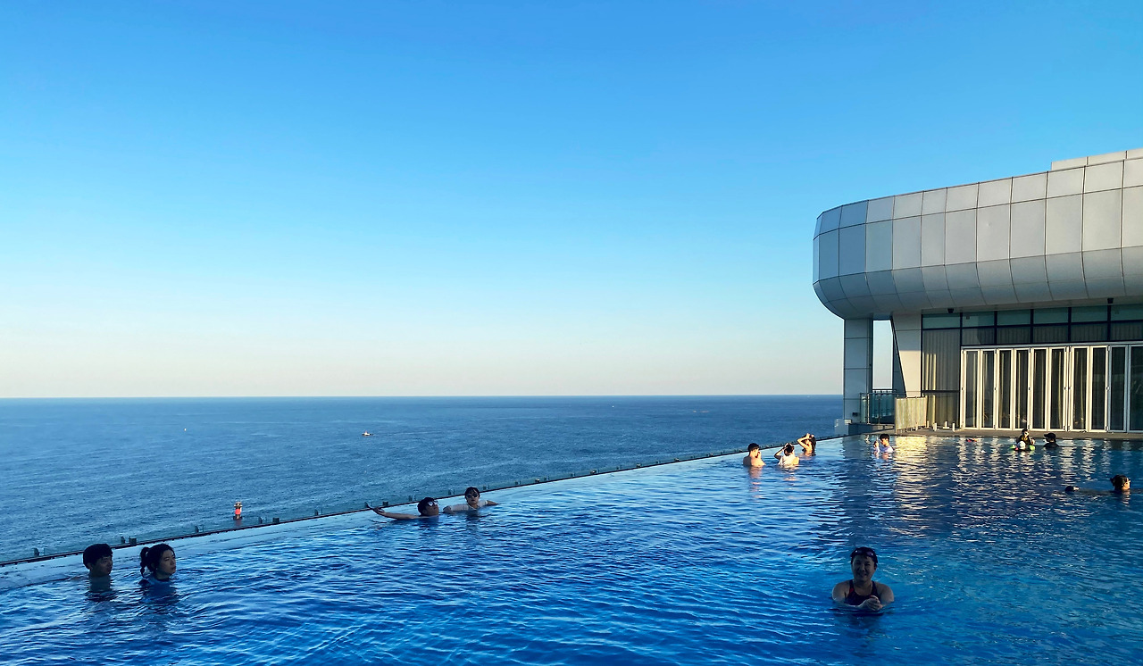 방구경을 마치고 수영복으로 갈아입었다. 호캉스 하면 역시 인피니티풀. 개인적으로는 생애 첫 인피니티풀이었다. 멋진 풍경과 그 풍경을 병풍 삼아 찍을 인생샷이 기대가 됐다. 무엇보다 이게 얼마만의 물이던가!? 코로나 때문에 수영장을 못가 수영이 너무도 하고 싶던 참이었다. 하지만 이때까진 전혀 예상하지 못했다. 인피니티풀에서 운동으로 찐수영을 하는 사람이 나 밖에 없을 줄은...