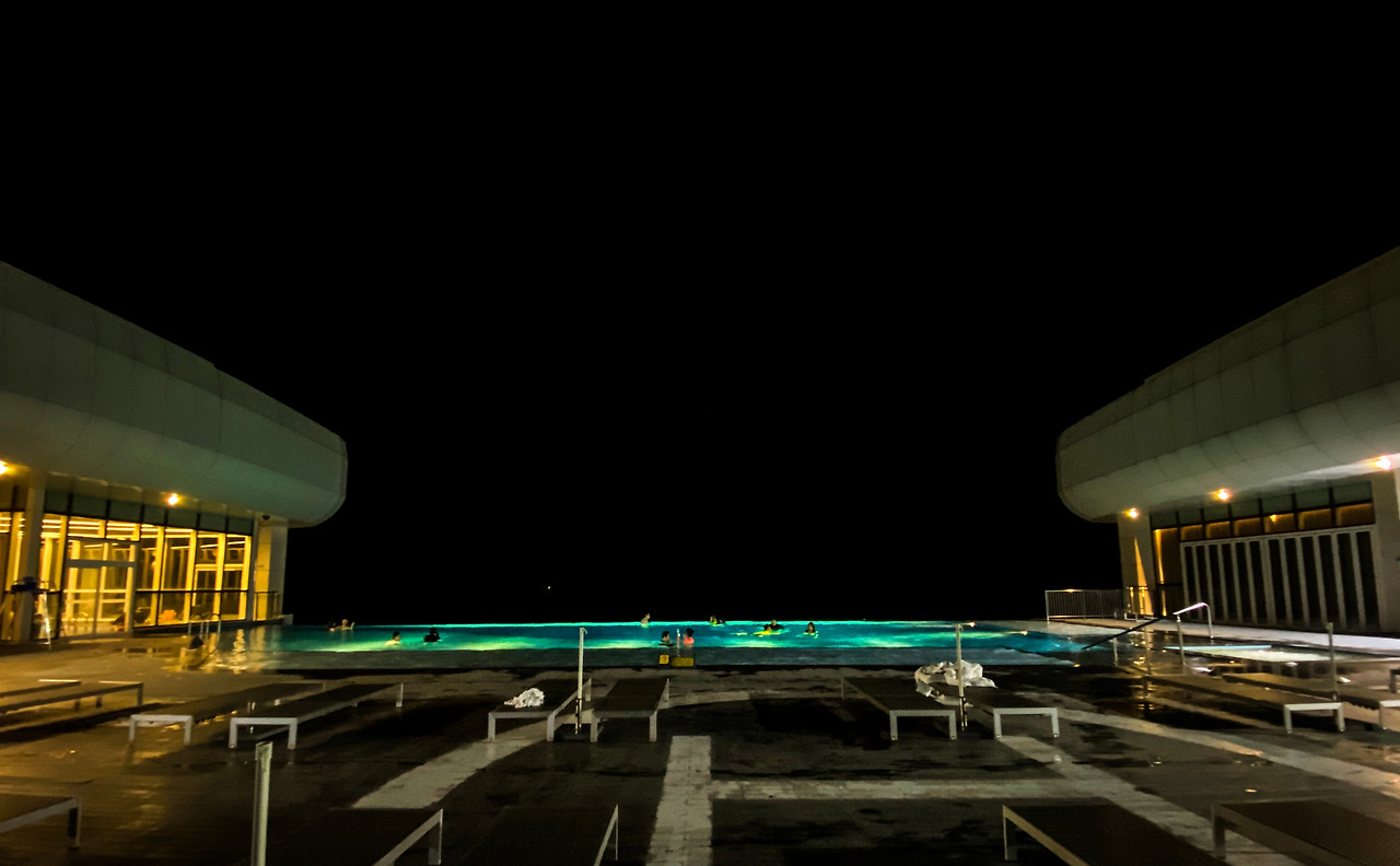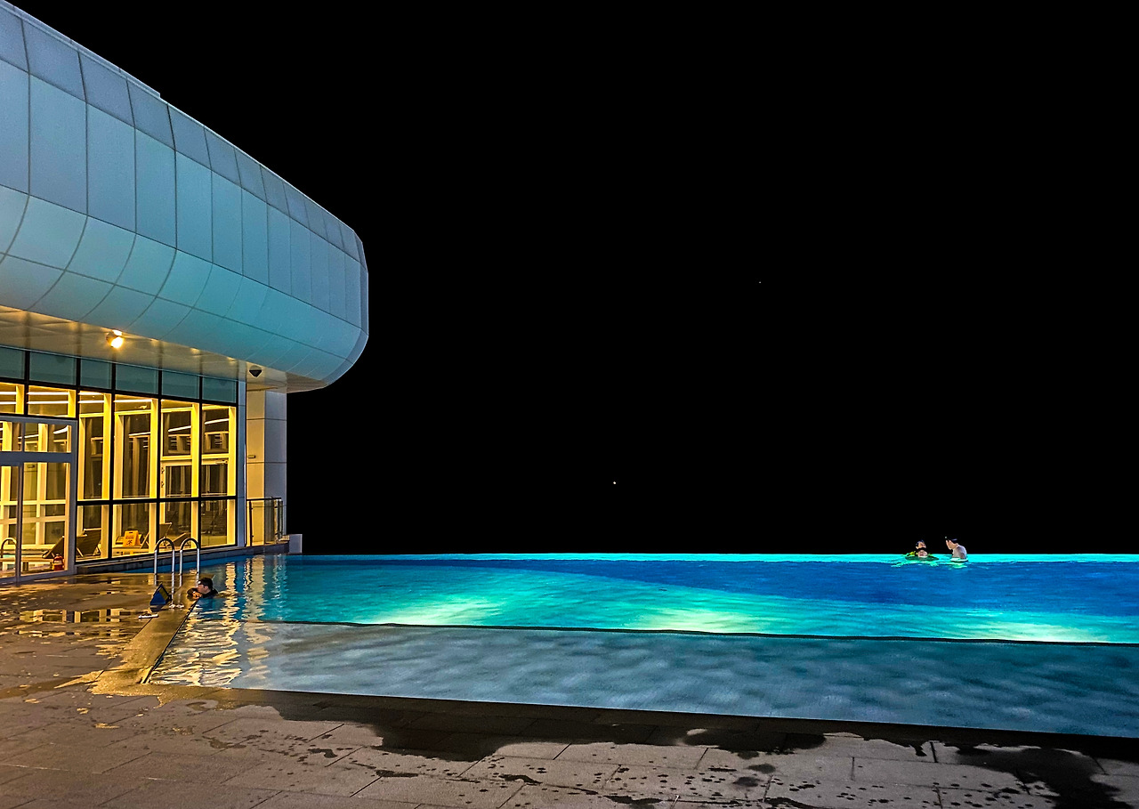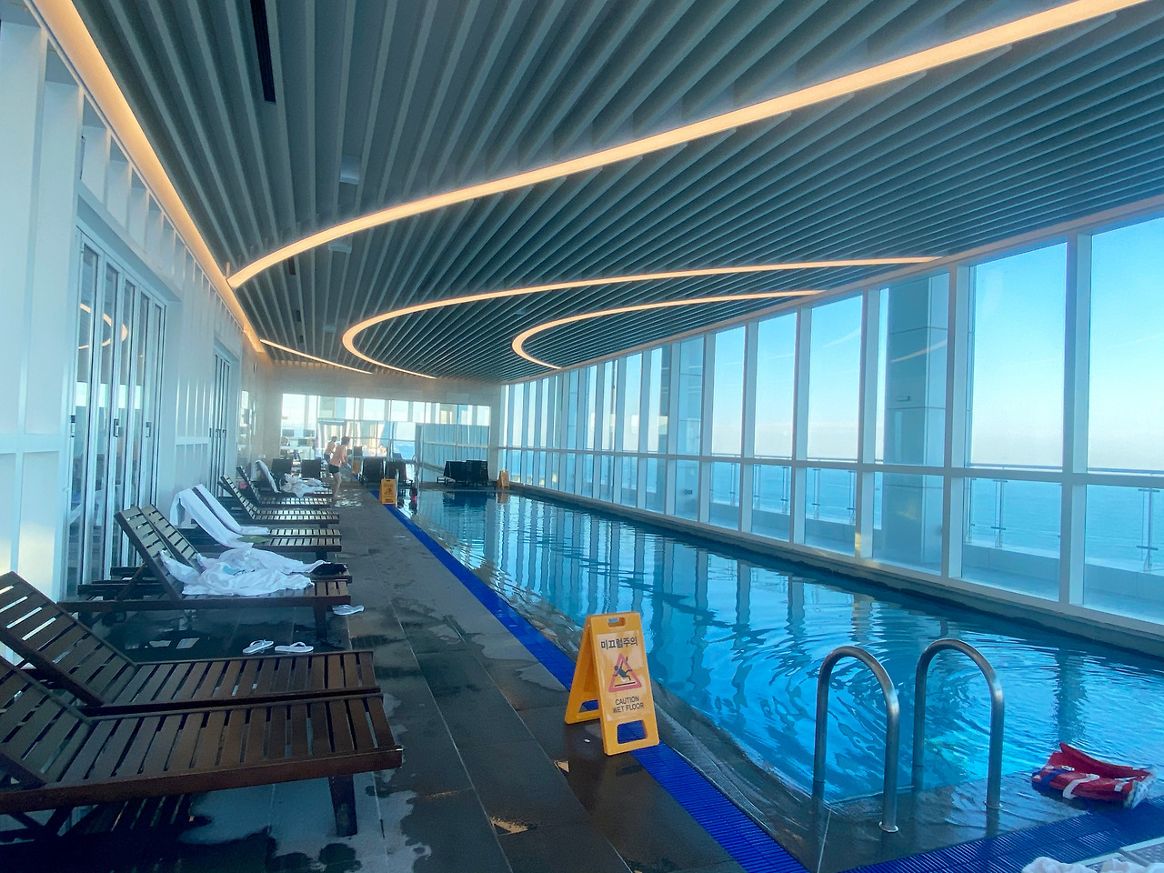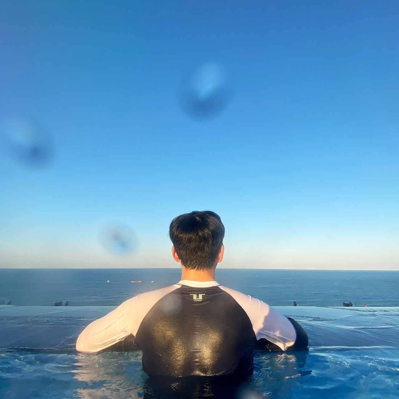 방구경을 마치고 수영복으로 갈아입었다. 호캉스 하면 역시 인피니티풀. 개인적으로는 생애 첫 인피니티풀이었다. 멋진 풍경과 그 풍경을 병풍 삼아 찍을 인생샷이 기대가 됐다. 무엇보다 이게 얼마만의 물이던가!? 코로나 때문에 수영장을 못가 수영이 너무도 하고 싶던 참이었다. 하지만 이때까진 전혀 예상하지 못했다. 인피니티풀에서 운동으로 찐수영을 하는 사람이 나 밖에 없을 줄은...