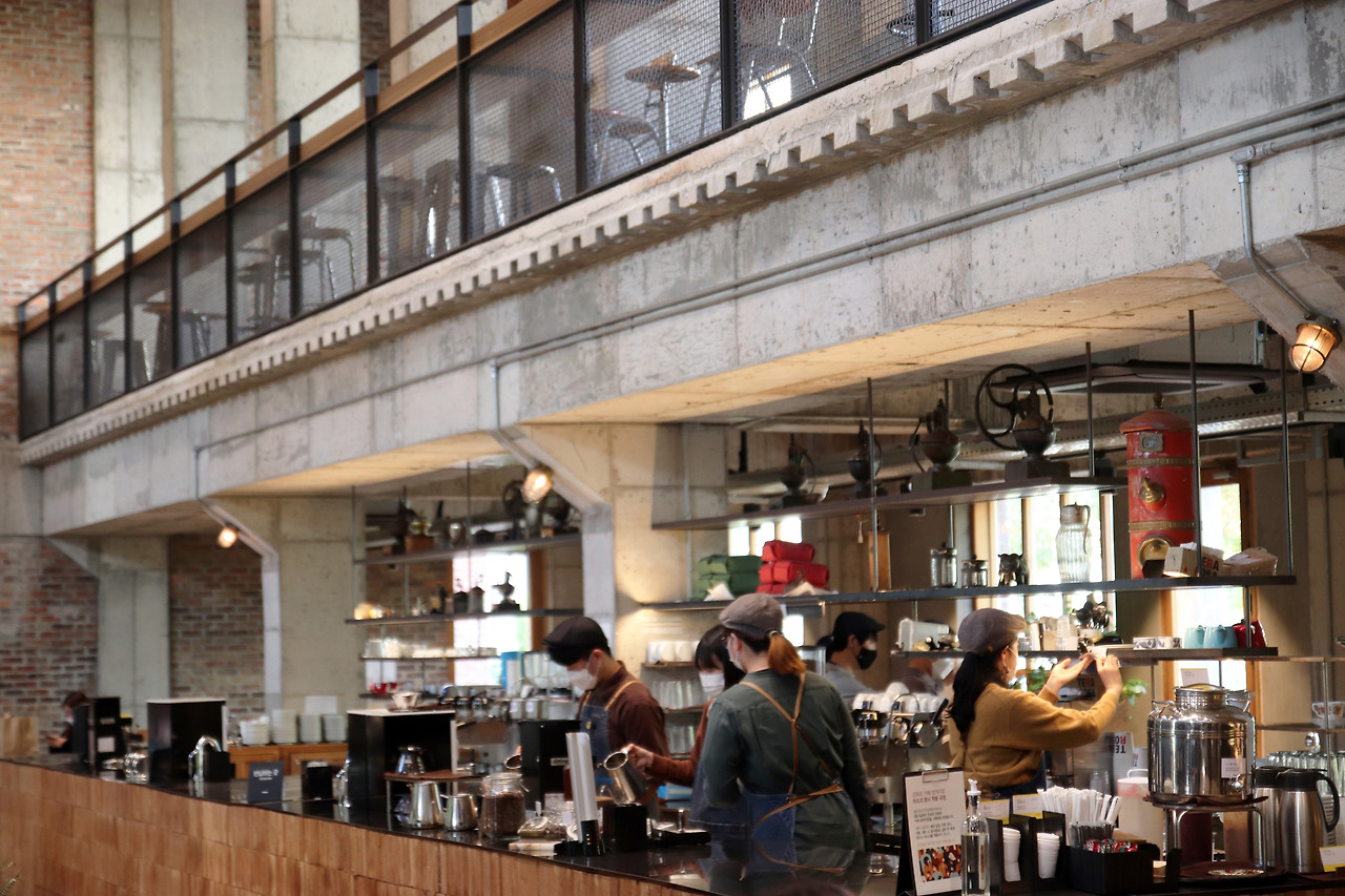 시원한 바닷길이 아닌 육지로 굽이굽이 깊숙이 들어가 테라로사 커피공장 강릉 본점에 도착했다. 주말에는 갈 수 없는 곳으로 소문나 있을 정도로 사람들이 많이 찾는 곳이라는데 평일이라 한산했다. 본점이라 그런지 크기도 크고, 카페라기보다는 정말 공장 같았다. 안으로 들어서자 SNS에서 자주 봤던 그 풍경이 딱! 눈에 들어왔다. 본능적인 사진 욕심에 주문도 안 하고 사진부터 찍으려는 나를 짝꿍이 끌어당겼다.