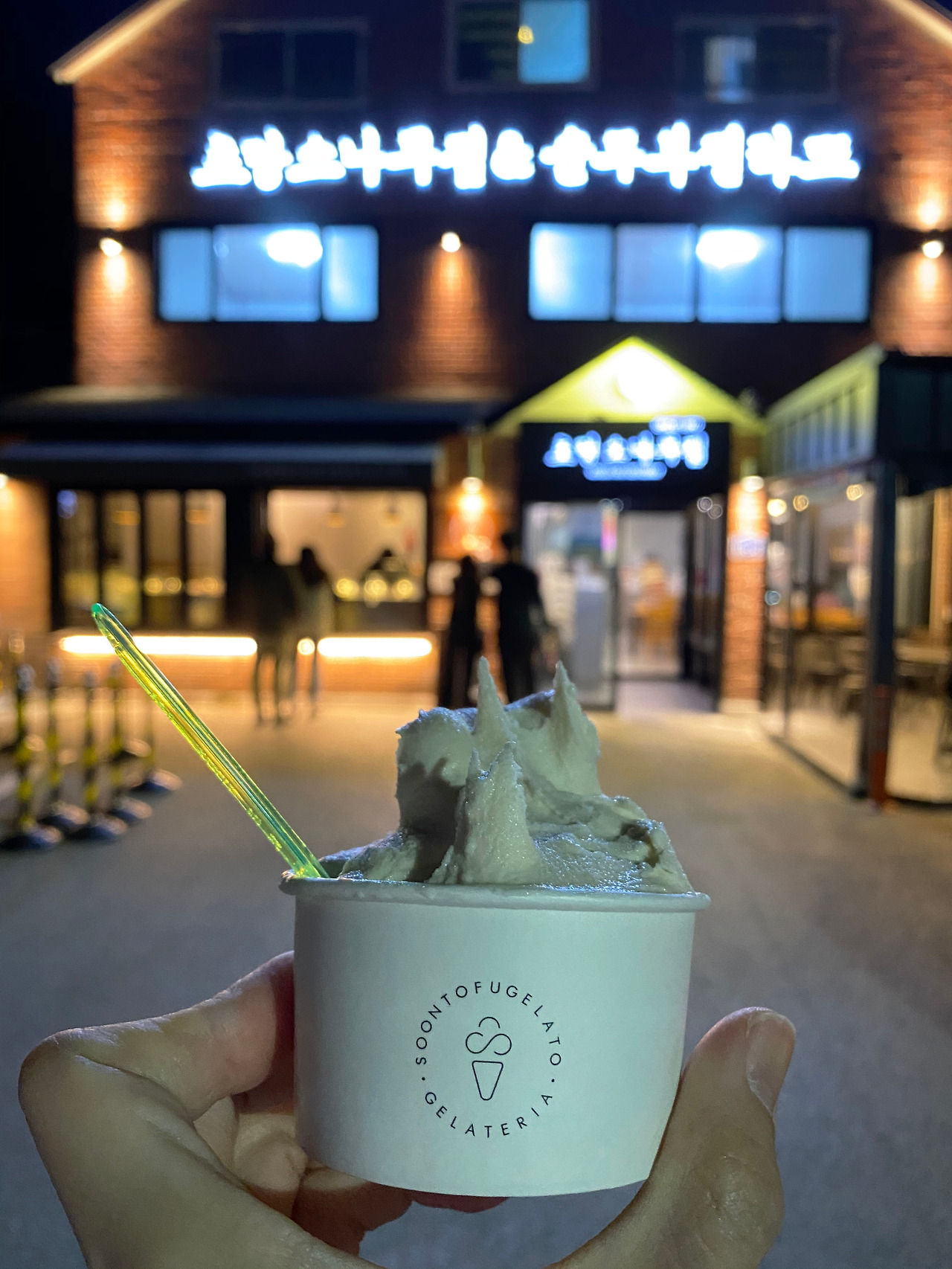 순두부젤라또는 짬순과는 달랐다. 전혀 모르는 맛이었다. 순두부로 젤라또라니. 두부가 젤라또가 되는 게 신기해 사장님께 물었다.