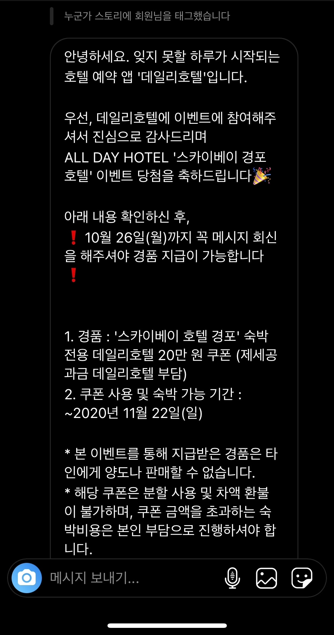 인스타그램에 알 수 없는 누군가로부터 DM(다이렉트 메시지)이 왔다. 또 무슨 광고 DM인가 싶어 읽지도 않고 지워버릴 생각으로 들어가 봤는데