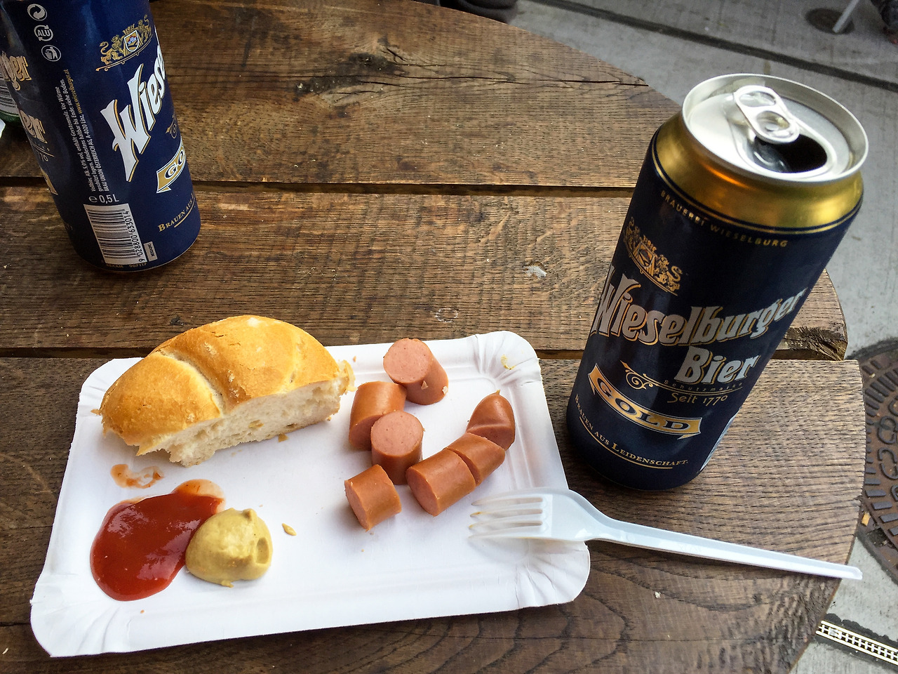 칼스플라츠(Karlsplatz)역에서부터 약 1km 정도에 달하는 시장을 초입에서부터 끝까지 다 돌고 나니 슬슬 배꼽시계가 으르렁대기 시작했다. 잔뜩 흥분해있는 뱃속의 거지를 진정시키기 위해 유일하게 딱! 열려있었던 소시지 가게로 향했다. 각자 맥주 한 캔씩 시키고 안주 겸, 요기할 겸 해서 소시지를 시켰다. 거기에 함께 곁들일 빵까지. 오독오독 소시지 한입에, 크으~ 맥주 한 모금. 역시 동유럽 맥주, 역시 맥주엔 소시지다. 빵은 거들뿐.