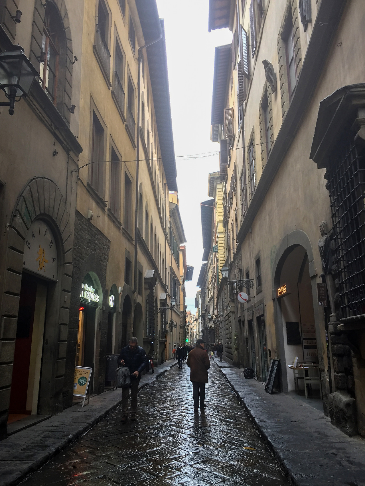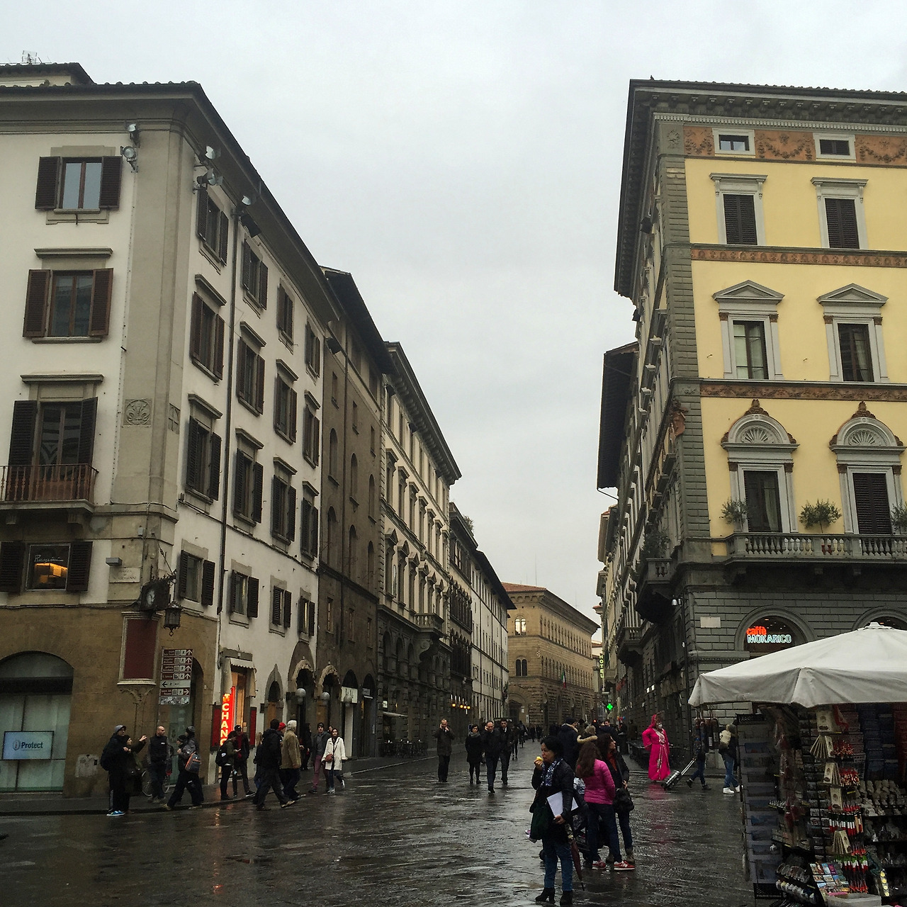사람들이 한창 가죽제품 쇼핑에 빠져있는 사이 홀로 가게를 빠져나왔다. 좋아! 아무도 모르는군. 자연스러웠어.^^V 사실 우리 패키지뿐만 아니라 다른 패키지는 물론 세계 각지에서 모인 개인 관광객들이 얽히고설켜 있어 나 하나쯤 빠진다고 티가 날 분위기가 전혀 아니었다. 무엇보다 사람들의 관심은 오로지 가죽제품에 있었기에 말이 몰래지 그냥 대놓고 나와도 아무도 몰랐다. 스읍, 하~ 가죽 냄새로 마비됐던 코가 다시 돌아왔다. 가는 비가 보슬보슬 날리고 있는 피렌체의 습한 공기가 상쾌했다. 보통 습한 공기는 눅눅하기 마련인데. 아마 일탈 후 찾아오는 해방감에서 느껴지는 상쾌함인 것 같았다. 기분 탓이라는 얘기다. 아무렴 어떠랴, 내 기분이 중요하지.