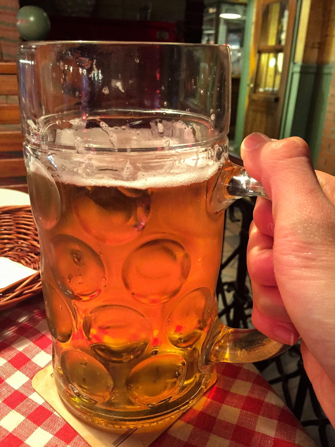 습관처럼 500을 말했다가 500이 없대서 잠시 당황했으나 어차피 500 두 잔은 할 운명이었기에 그냥 1리터를 시켰다. 맥주 1리터는 한국에서 본 적이 없어 어떻게 나올지 궁금하기도 했다. 슬슬 목이 말라 올 때쯤 드디어 맥주가 나왔다. 두둥! 500과는 스케일이 완전히 달랐다. 흔히 아는 500잔과 생긴 건 똑같은데 당연한 얘기지만 더 컸다. 거인들의 잔 같았다. 손잡이를 잡고 첫 모금을 마셔보려는데 부러질까 봐 나머지 한 손으로 잔을 떠받들었다. 허세 좀 보태서 자칫 잘못하면 한 손으로 들다가 손목이 나갈 것 같았다.