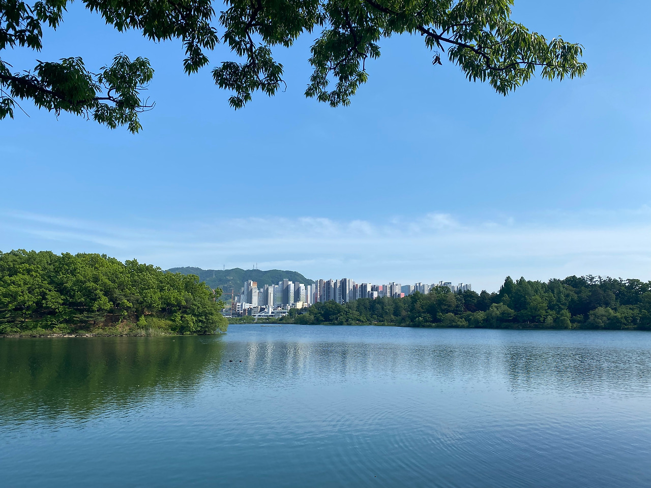 실희원에서 한상 거하게 해치우고 나니 본능적으로 산책이 당겼다. 아무리 풀데기 들이라지만 위에 뿌려진 깨 한 톨 안 남기고 싹쓸이해버리니 배가 터지기 일보 직전의 풍선이 되어 있었다. 지도 앱에서 짝꿍의 오후 스케줄 장소를 찍고 그 주변으로 어디 걸을 만한 곳이 있는지 검색했다. 충주 시내 한가운데에 파란색 덩어리가 보였다. 파란색이라면 필시 물이라는 얘기다. '호암지'라는 호수였다. 망설임 없이 한껏 성난 우리의 배를 어르고 달래줄 두 번째 충주 여행지로 낙점했다.