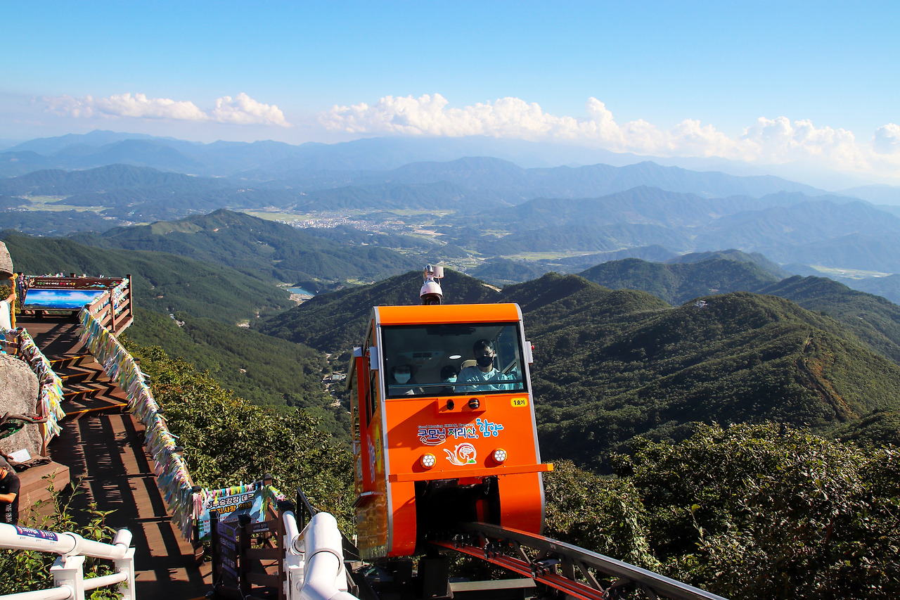 함양에서의 첫 번째 취재 스폿은 대봉산휴양밸리, 그중에서도 대봉모노레일과 짚라인을 체험할 수 있는 대봉스카이랜드였다. 즐기는 법은 단순했다. 전국 최장거리를 자랑하는 대봉 모노레일을 타고 대봉산 정상에 올라 대봉산 정상 소원바위에 소원을 빈 후, 멀리 지리산이 보이는 대봉산 정상의 전경을 바라보며 잠시 산멍도 때려보고, 내려올 때는 역시 국내 최장을 자랑하는 대봉 짚라인을 타고 내려오기. 이렇게만 하면 대봉 스카이랜드를 100% 즐겼다고 할 수 있다. 취재 여행을 왔으니 당연히 해보지 않을 수 없을 터. 단, 여행기자에게 주어진 시간이 그리 넉넉하지는 않기에(다른 곳을 또 취재하러 가야 하니...) 짚라인은 총 5개의 코스 중 가장 낮은 코스만 체험하기로 했다.