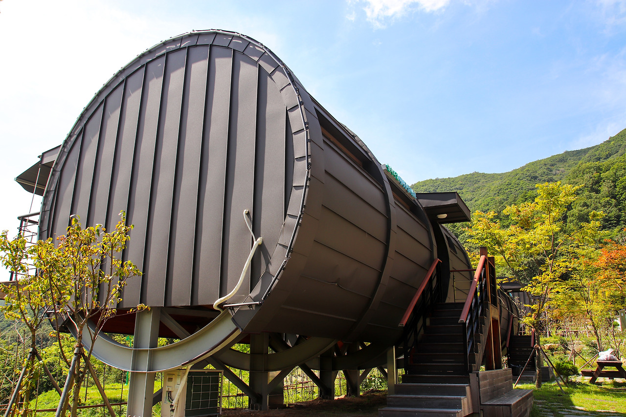 대봉캠핑랜드는 최신식 펜션시설과 깨끗한 자연환경으로 숲 속 자연 속에서 편안하고 즐거운 휴식을 즐길 수 있는 힐링 숙박시설이다. 숲 속의 집 대나무둥지를 추천! 테라스뷰가 풍경화가 따로 없다.