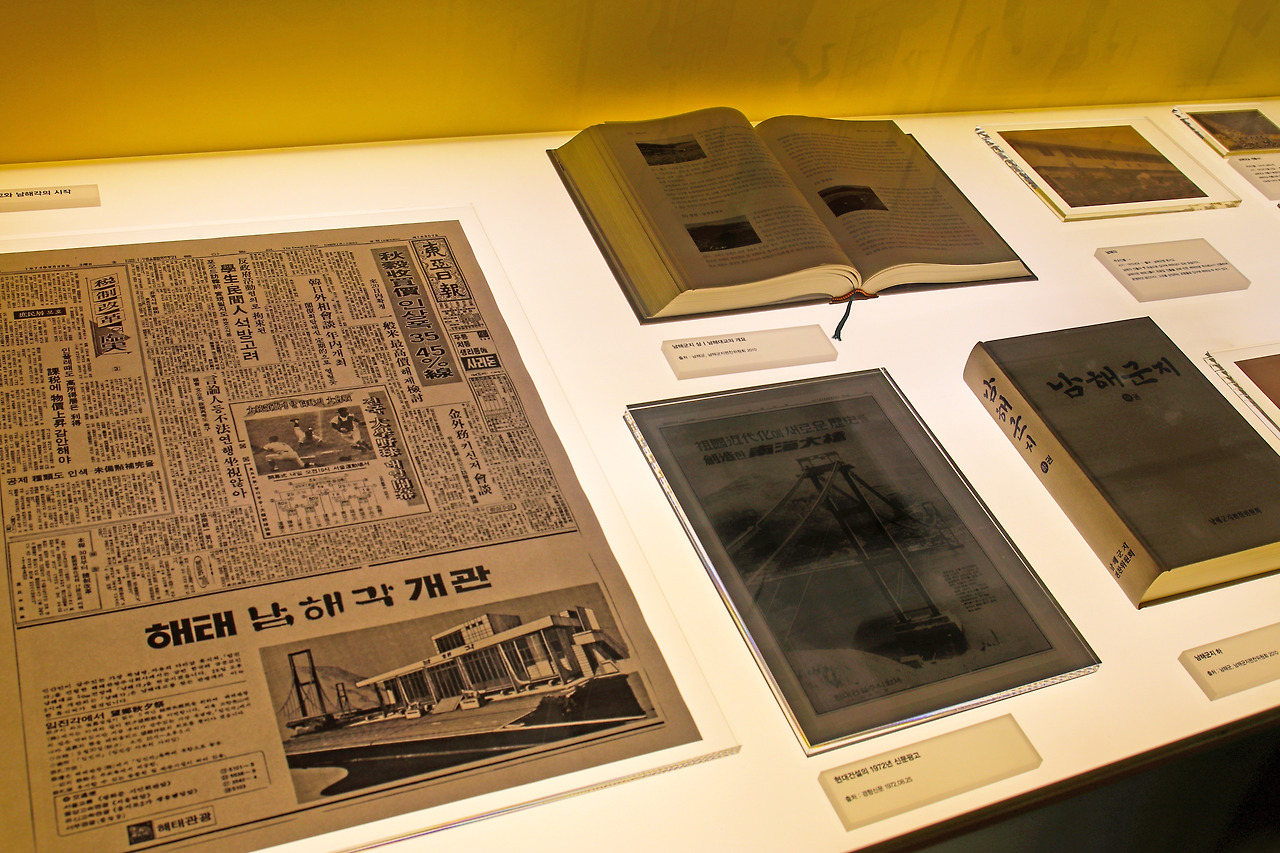 손가락으로 가리키는 '저 위'는 남해각 옥상이었다. 그제야 리뉴얼된 남해각이 눈에 들어왔다. 이름만 듣고서 중국집이 떠올랐던 게 무색할 만큼 새하얀 외벽에 통유리창으로 디자인된 남해각은 요즘 힙한 서촌의 복합문화공간 중 하나 같았다. 다만「남해각」 간판은 여전히 예전 향수를 간직하고 있었다. 신구의 조화가 묘하게 잘 어울렸다. 남해각 관광 플랫폼 사업을 통해 다시 태어난 남해각은 과거와는 달리 남해각의 역사와 옛날이야기를 간직한 전시관이자 여행자를 위한 서비스 공간이었다. 외관의 남해각 간판처럼 내부의 오래된 구조물들을 옛 모습 그대로를 살려 리뉴얼했다. 여기에 여관으로 사용되었던 당시 각 호수가 쓰여있는 열쇠들, 남해대교 건설 소식과 남해각 개관을 알렸던 옛 신문광고나 책자 등이 그 시절 향수를 더 짙게 만들었다.
