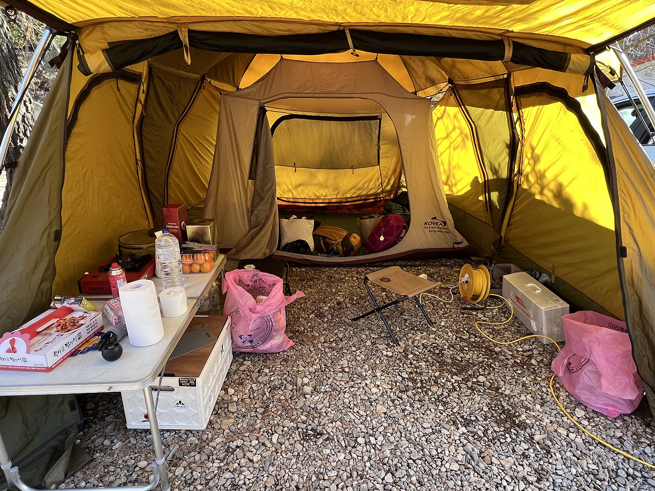 도저히 찾을 수 없어 텐트 렌털 업체에 전화를 해볼까 하는 찰나 텐트 기본 구성품이 생각났다. 렌털 했던 사이트로 들어가 구성품을 살펴봤다. 역시 타프는 따로 없었다. 아닌데? 사진에는 분명 입구 앞쪽으로 타프가 있었다. 혹시 사진과 다른 제품인 건가? 인터넷 쇼핑은 종종 실물과 다른 경우가 있으니까. 애꿎은 입구 쪽 날개만 만지작거렸다. 그때, 돌돌 말아놓은 날개에서 뭔가를 발견했다. 뒤쪽 날개와는 다르게 두께감이 있었던 것. 말린 날개를 다시 펴보니 그제야 보이는 지퍼. 지퍼를 열자 스르륵~ 와우! 숨어있던 타프가 나타났다. 일체형이었구나! 이름하야 익스텐션 타프 시스템.(이런 게 있는 줄 이번에 알았다. 찐 캠린이 인증^^;;) 크으~ (겨우 이 정도에) 세상 참 좋아졌다며 감탄의 감탄과 함께 집 완성의 기쁨을 누렸다. 자, 이제부터가 진짜 캠핑 시작!인데 기쁨도 잠시, 에너지를 너무 쏟은 탓에 그만 텐션이 떨어져 버렸다. 후... 삶이든 여행이든 역시 내 집 마련은 어렵구나.ㅜㅠ