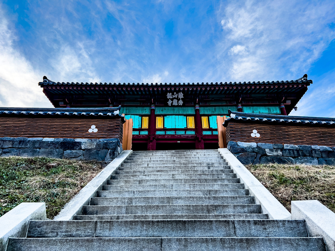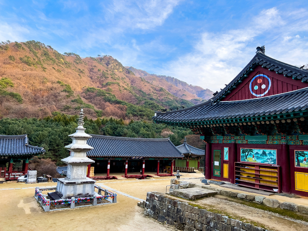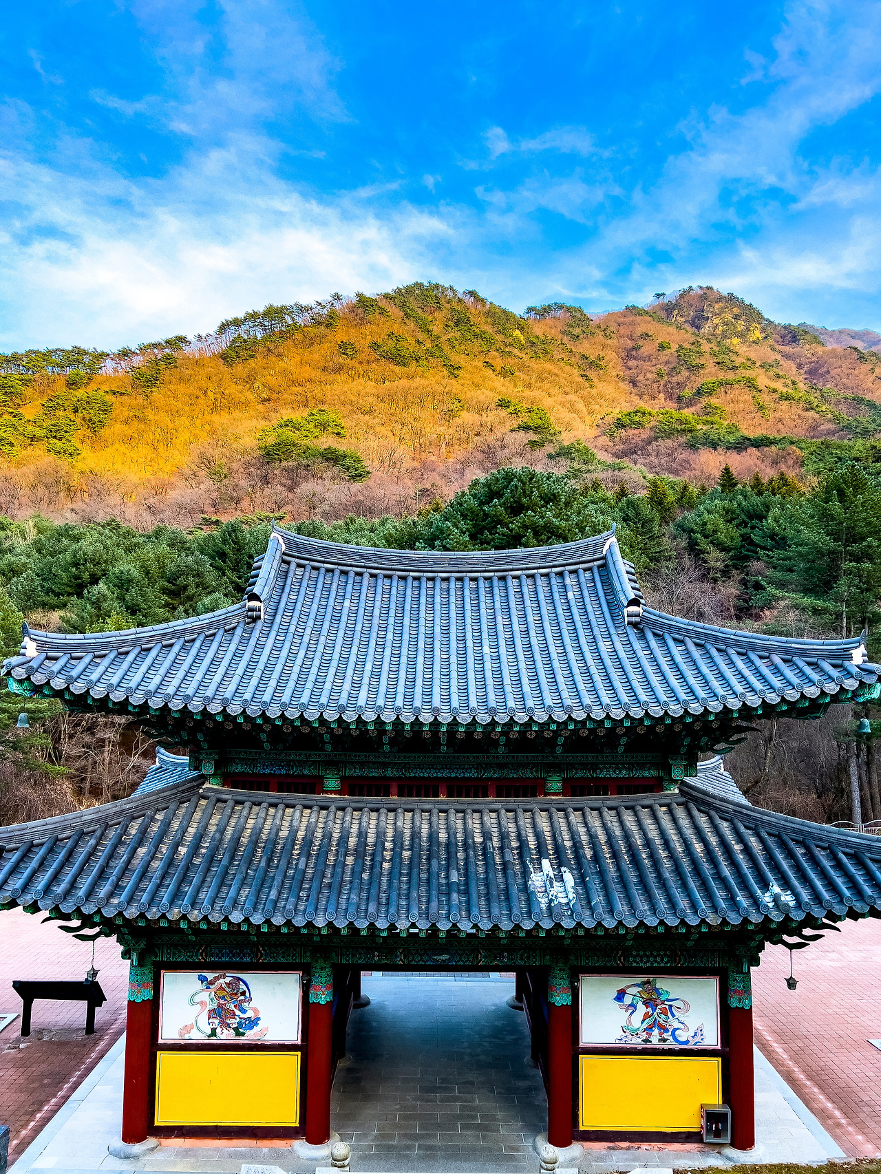 캠핑을 빙자한 혹한기 훈련을 마치고 서울로 돌아가는 길에 점심도 해결할 겸 원주에 들렀다. 생활에 달인에 나온 원주 3대 막국수 집에서 시원한 물막국수 한 사바리 때리고서는 바로 옆 카페에서 커피를 마시며 원주 관광안내지도를 줍줍했다. 원주에는 대체 뭐가 있을까? 사실 원주 하면 딱 떠오르는 곳은 '뮤지엄 산'과 '소금산 출렁다리'가 있기는 했는데 둘 다 사람이 너무 많을 것 같아 패스. 그 외에는 관광안내지도를 봐도 마땅히 당기는 데가 없었다. 그냥 갈까? 하다가, 그래도 모처럼 왔으니 한 군데라도 가보자고 하여 별 기대 없이(진짜 기대 1도 안 했다) 가게 된 곳은 치악산국립공원 자락에 있는 천년고찰 구룡사. 때마침 푸른 하늘이 처마와 잘 어울렸고, 치악산을 품고 있는 전경이 산속에 숨겨진 비밀의 장소처럼 고즈넉하면서도 신비로웠다. 그냥 갔으면 어쩔 뻔!? 원주에는 치악산국립공원이 있고 그 아래 구룡사가 있다.