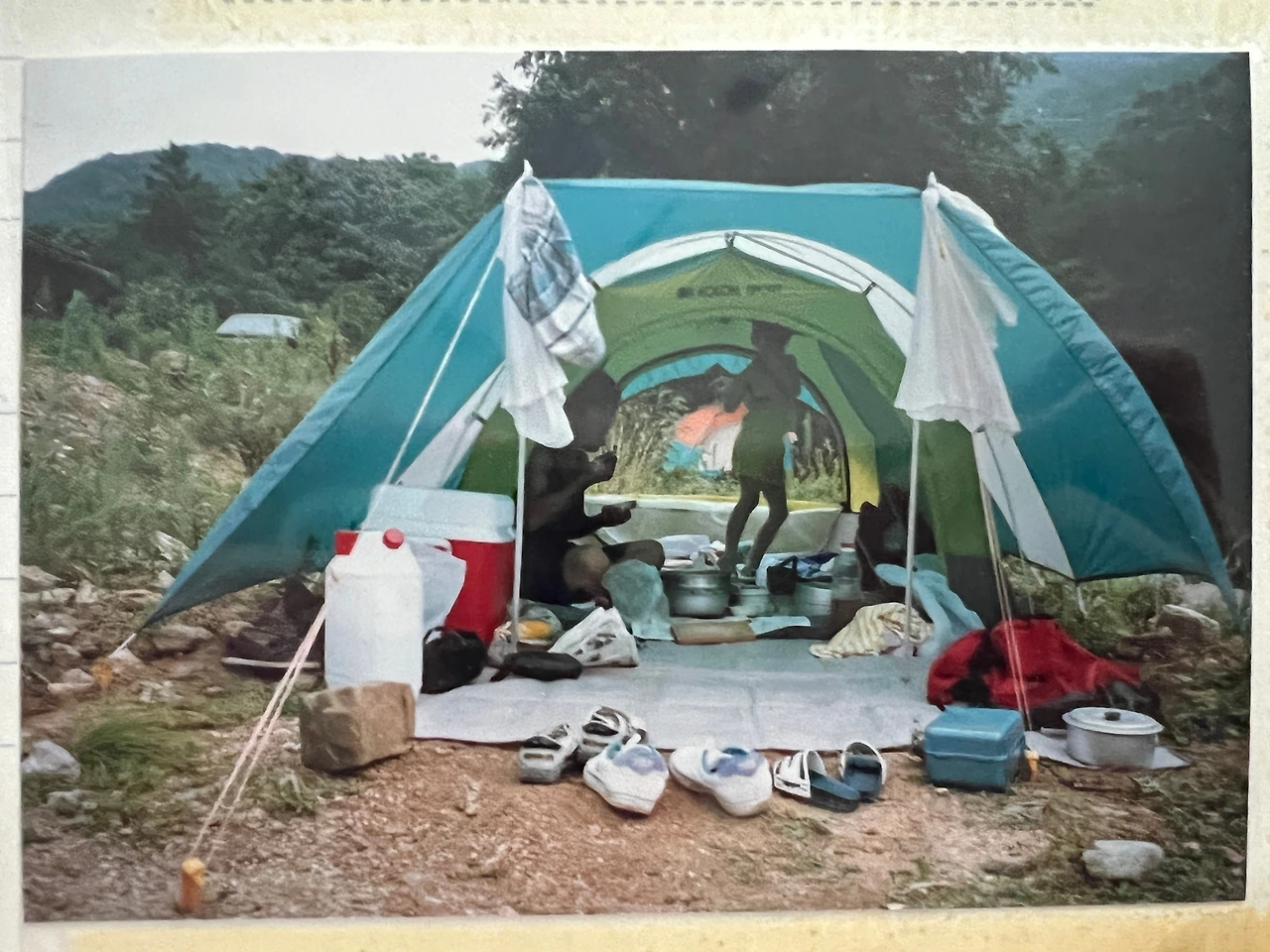 그로부터 몇 달 후, 지인들과 캠핑을 가게 됐다. 캠핑 장비를 모두 갖춘 캠핑러와 함께 하기에 사실 내가 텐트를 가져갈 필요는 없었지만 혹시나 싶어 아빠 텐트를 챙겼다. 캠핑장에 도착해 사이트를 꾸미고 식사 준비를 하는 동안 짬을 내 아빠 텐트를 봉인 해제했다. 감격의 순간ㅠ 30년간 독방에 갇혀있다가 이제야 세상 밖으로 나오게 됐다. 커버에 붙어 있는 구성품 및 설치방법(얼마나 보관이 잘되었으면 아직도 글자가 선명했다.)을 보며 텐트 피칭을 시작했다. 살짝 긴장됐다. 30년 만에 완성시키는 아빠의 유품이기도 하거니와 요즘이야 워낙 기술이 좋아 던지면 펴지는 텐트도 있고(말 그대로 pitching이다.) 구조가 단순해 폴도 많이 필요 없지만 옛날 텐트는 폴도 많고 설치하는 방법도 까다로워 혼자서 치기는 어렵다는 (뜬?) 소문을 종종 들었기 때문이다. 우선 본체를 쫙~ 펼치고 폴을 조립했다. 다 조립하고 보니 앞서 친 지인의 최신식 눈피크 텐트에 비해 폴이 확실히 많았다. 그렇다고 사이즈가 더 큰 것도 아닌데... 다음으로는 폴을 본체에 끼워 세울 차례. 끼우는 것은 요즘 것들과 별반 다를 게 없었으나 끼운 후 고정하는 방식에서 차이가 있었다. 끼우면 알아서 고정이 되는 요즘 것들과는 달리 아빠의 텐트는 중간중간에 있는 고리로 일일이 고정시켜주어야 했다. 폴을 다 끼웠으면 이제 들어 올리면 끝. 하지만 양쪽에서 잡고 일으켜 세운 순간 걸어둔 고리들이 빠지는 경우가 발생했다. 세운 걸 다시 내리자니 나머지 고리마저 다 빠져버려 다시 원점으로 돌아갈 것 같고 한쪽에서 들고 있는 상태로 나머지 한 사람이 왔다 갔다 다시 고리를 재정비하는 수밖에는 없었다. 몇 번을 왔다 갔다 한 끝에 본체 앞쪽과 뒤쪽(앞부분과 뒷부분으로 나뉘어 폴이 들어갔다. 폴이 많은 이유가 여기에 있었다.)을 차례로 세웠다. 그리고는 위에 플라이(본체가 젖는 것을 막아주는 텐트의 지붕)를 대충 얹었다. 드디어 텐트 완성! 완성하고 보니 컬러와 디자인이 쪼금 촌스러워 그렇지 상태는 최상급이었다.