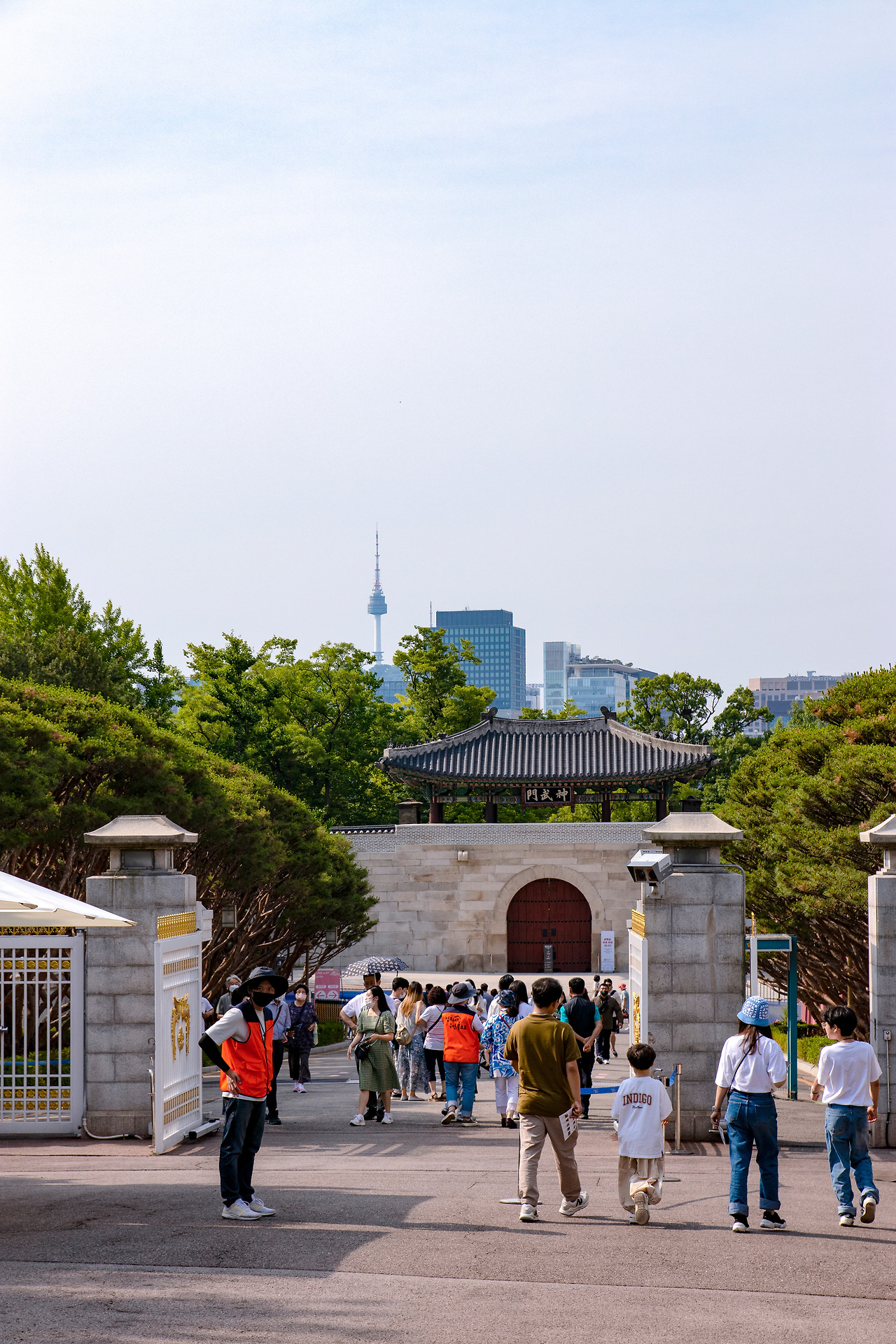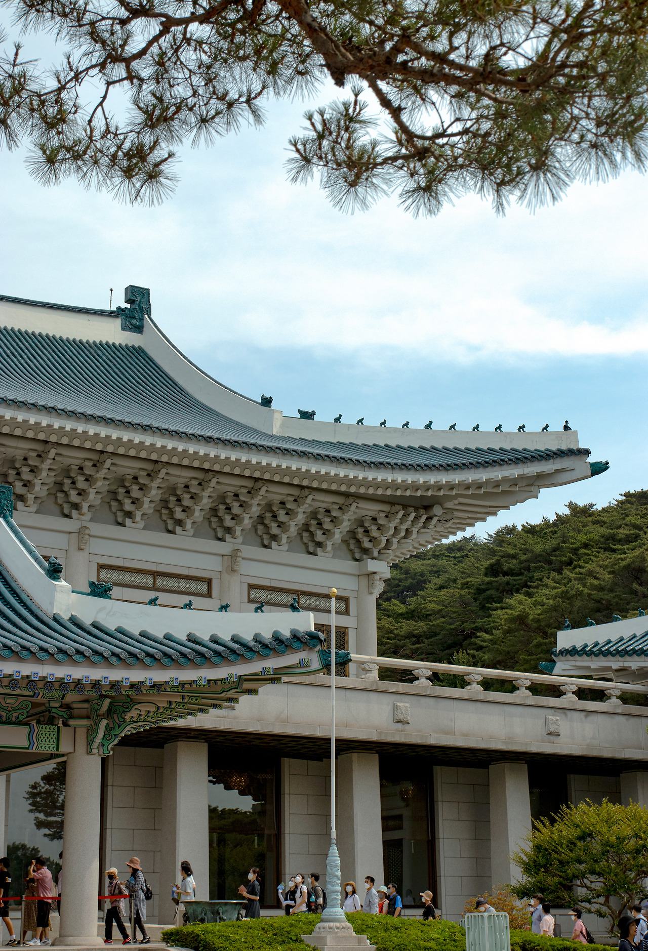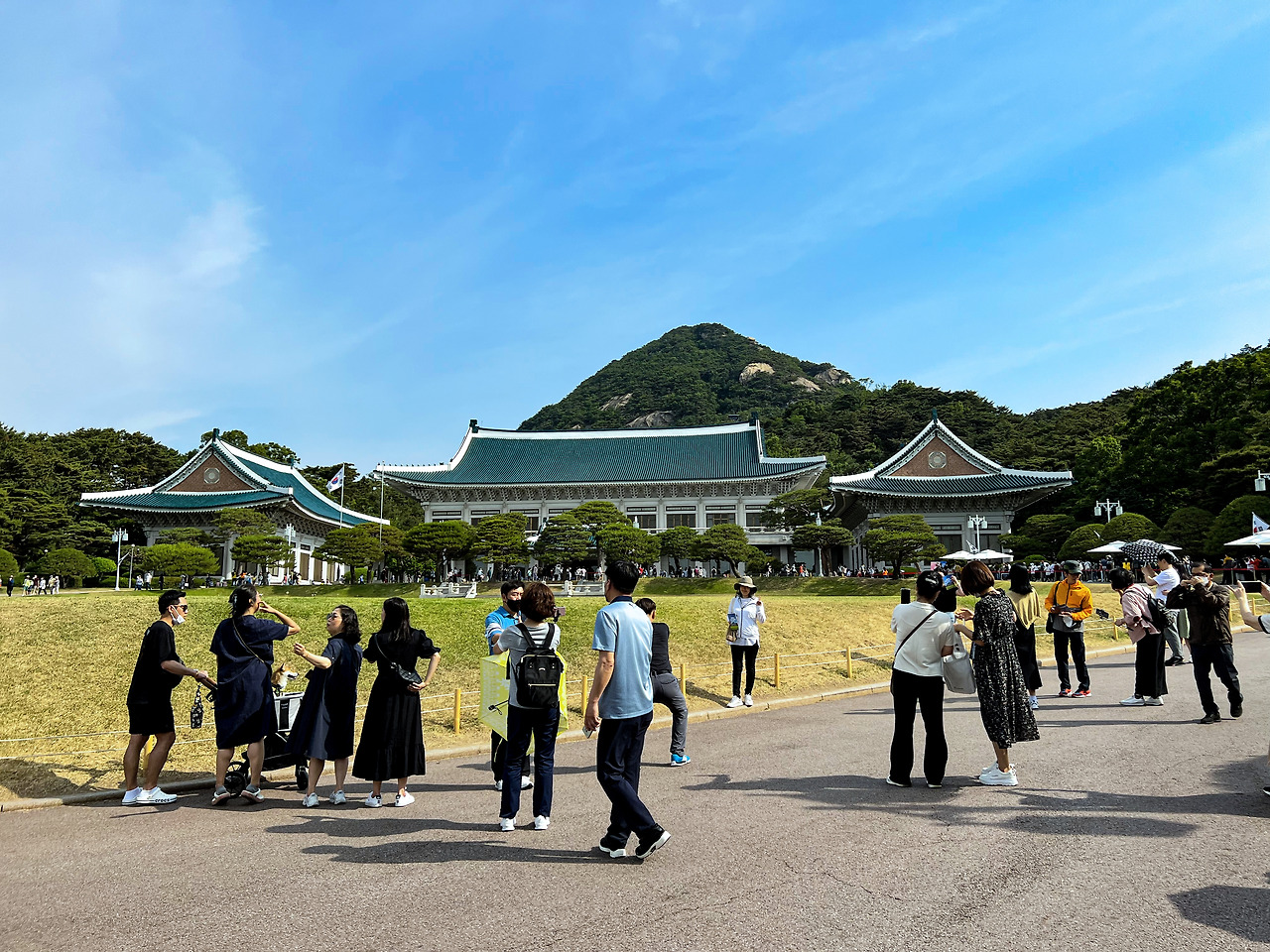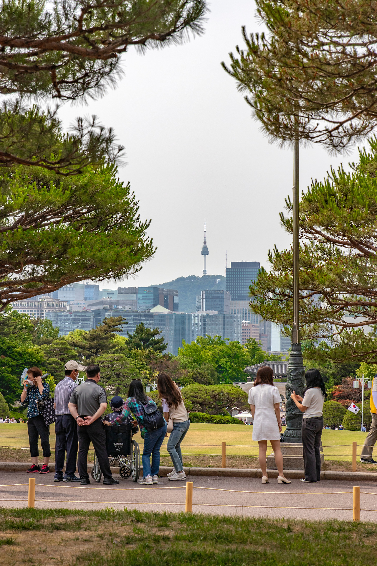 인증숏 미션을 성공리에 마치고 본관 입장 대기줄에 합류했다. 걱정했던 것과는 달리 생각보다 입장 속도가 빨랐다. 기다리면서 대정원 앞에서 못다 찍은 청와대 사진을 찍으니 시간 순삭. 어느새 청와대 본관 앞에 다다랐다. 줄 서는 내내 청와대만 바라보고 서있다가 청와대 앞에 도착하니 이제야 청와대 맞은편으로 펼쳐진 서울의 모습이 눈에 들어왔다. 아마 대통령님을 비롯한 청와대 관계자들은 이 아름다운 서울을 매일 보았겠지. 대정원, 종로의 빌딩 숲과 남산이 한 프레임에 담겨 자연과 도시가 공존하는 서울의 매력이 잘 드러났다. 뒤로는 북악산이 있고 앞으로는 청계천이 흘러 도시가 발달해 있는, 이것이야말로 배산임수(背山臨水)의 정석. 과연 명당이로소!
