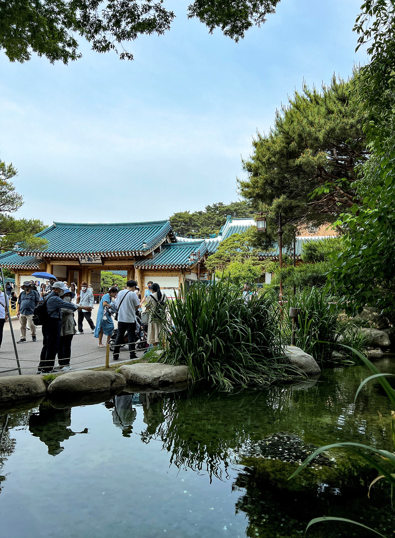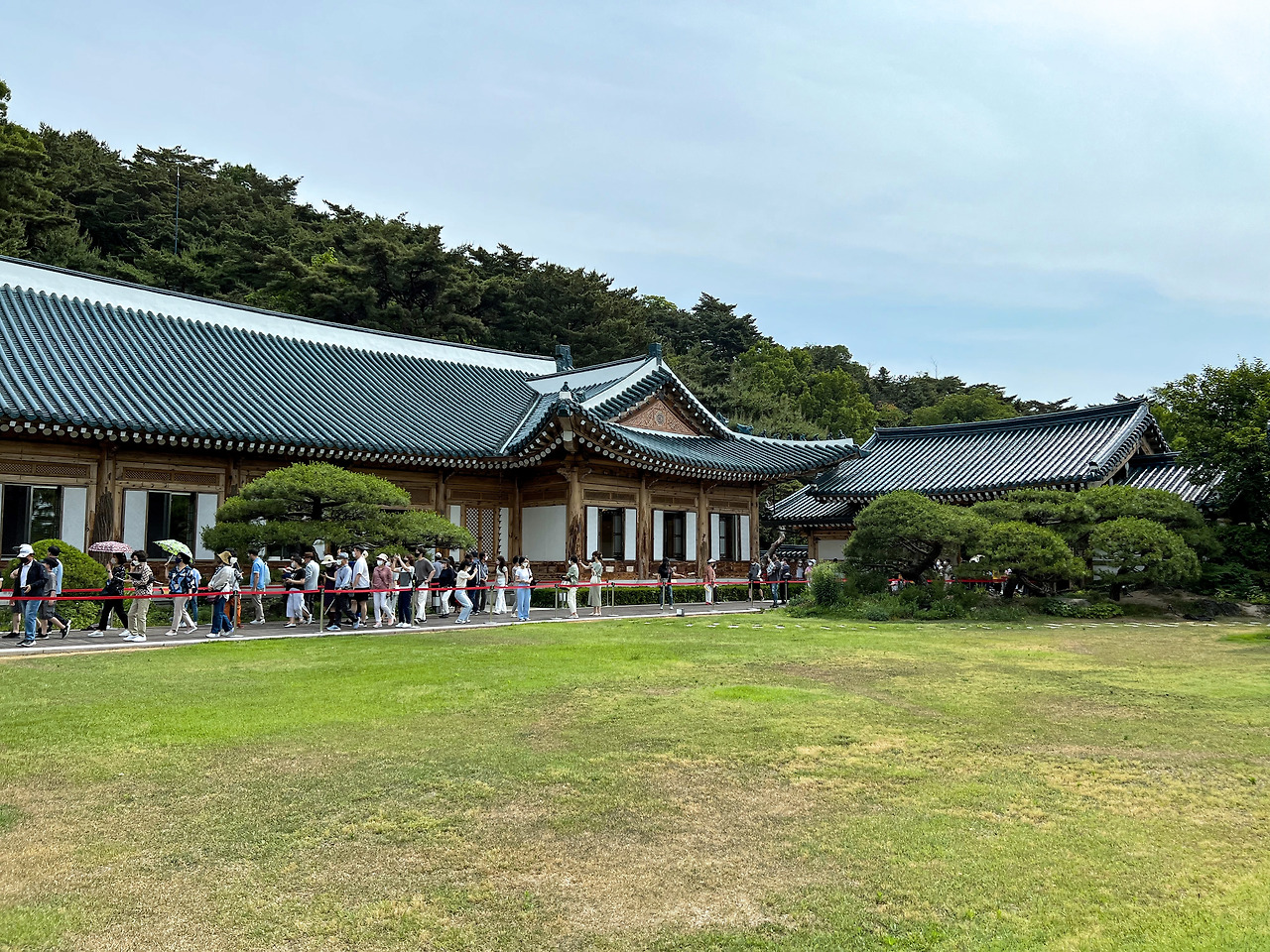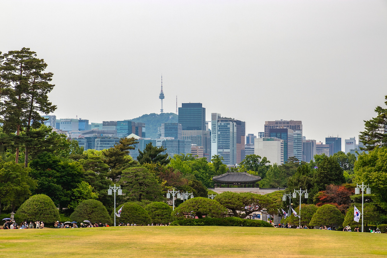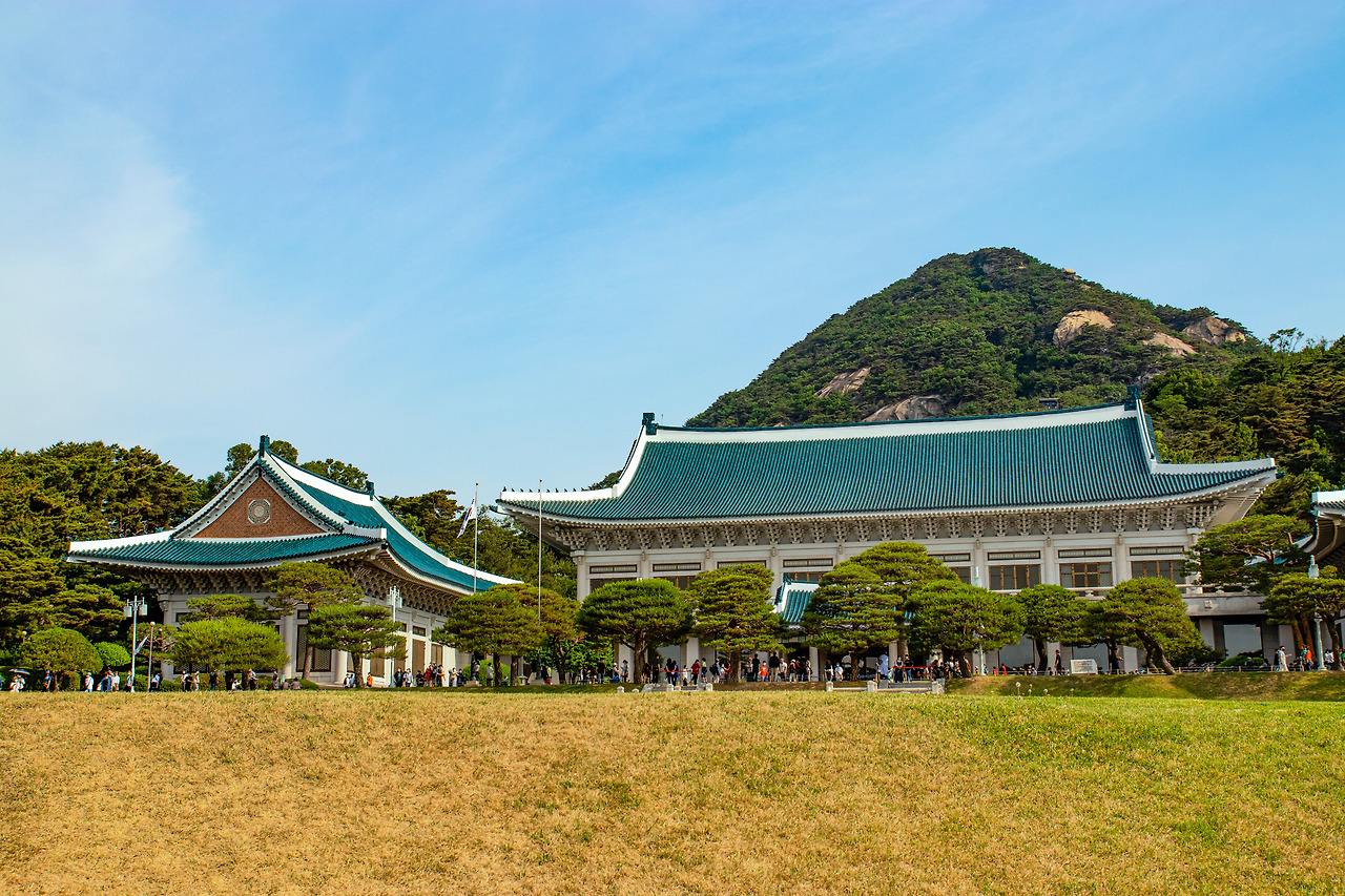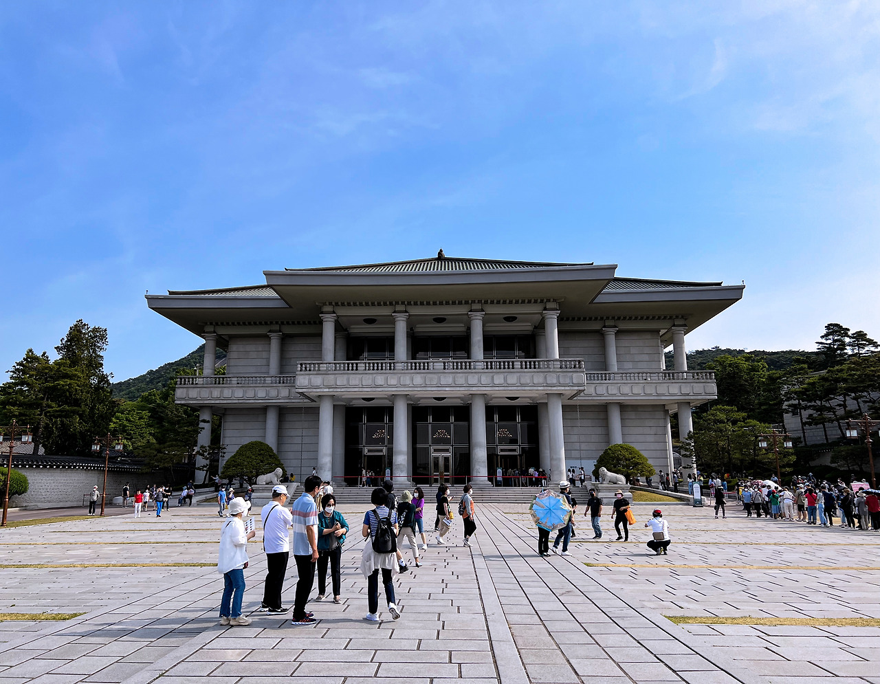 인증숏 미션을 성공리에 마치고 본관 입장 대기줄에 합류했다. 걱정했던 것과는 달리 생각보다 입장 속도가 빨랐다. 기다리면서 대정원 앞에서 못다 찍은 청와대 사진을 찍으니 시간 순삭. 어느새 청와대 본관 앞에 다다랐다. 줄 서는 내내 청와대만 바라보고 서있다가 청와대 앞에 도착하니 이제야 청와대 맞은편으로 펼쳐진 서울의 모습이 눈에 들어왔다. 아마 대통령님을 비롯한 청와대 관계자들은 이 아름다운 서울을 매일 보았겠지. 대정원, 종로의 빌딩 숲과 남산이 한 프레임에 담겨 자연과 도시가 공존하는 서울의 매력이 잘 드러났다. 뒤로는 북악산이 있고 앞으로는 청계천이 흘러 도시가 발달해 있는, 이것이야말로 배산임수(背山臨水)의 정석. 과연 명당이로소!