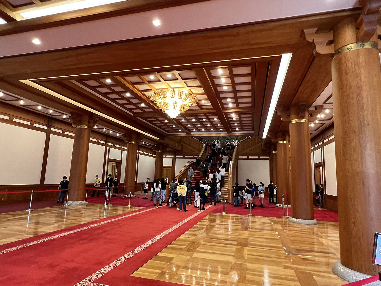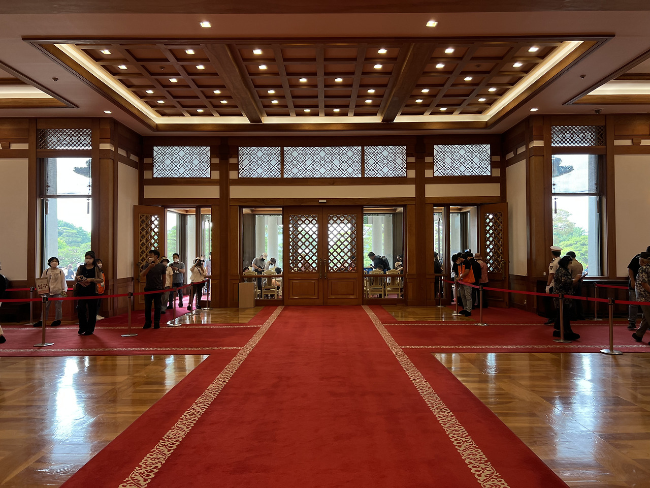 지하철 3호선 경복궁역에서 나와 왠지 청와대로 가는 것 같은 사람들 무리를 졸졸 따라가다 보니 본의 아니게 청와대 정문이 아닌 영빈문에서 입장을 했다. 그래서 들어서자마자 반겨준 건 청와대가 아닌 영빈관. 뭐 하는 곳인지는 잘 모르겠으나(내가 아는 영빈관은 무도장뿐이라^^;;) 아침부터 줄이 어~엄청 길게 늘어서 있어 꼬리에 붙어야 하나 말아야 하나 고민하는 찰나, 영빈관은 들어가 사진 찍고 나오는 데까지 1분이면 충분하니 우선 본관부터 보시라는 안내요원의 친절하면서도 간곡하면서도 짜증 조금 섞인 멘트에 감동받아 그의 수고에 보답하고자 (아무도 말 안 듣길래 우리라도) 본관으로 향했다.