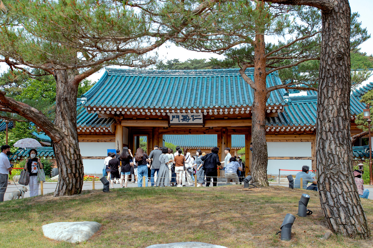 영빈관 옆 좁은 문을 지나 골목은 아니지만 수많은 인파로 골목이 되어버린 길을 따라 걸었다. 그리고 얼마 안가 병목현상이 서서히 사라질 때쯤, 쨔잔~ 마침내 광활한 대정원과 함께 선명한 청색 모자를 쓴 청와대가 그 모습을 드러냈다. 영빈관 줄과는 비교도 안 되는 어어어어~엄청 긴 줄과 함께. 과연 오늘 안에 입장은 가능할까 싶었지만 일단 줄은 줄이고, 줄 서기에 앞서 해야 할 일이 있었으니, '나 청와대 왔다!' 하고 인증하는 일. 대정원 앞은 청와대를 배경으로 인증숏을 찍는 사람들로 본관 입장 줄 못지않게 붐볐다.