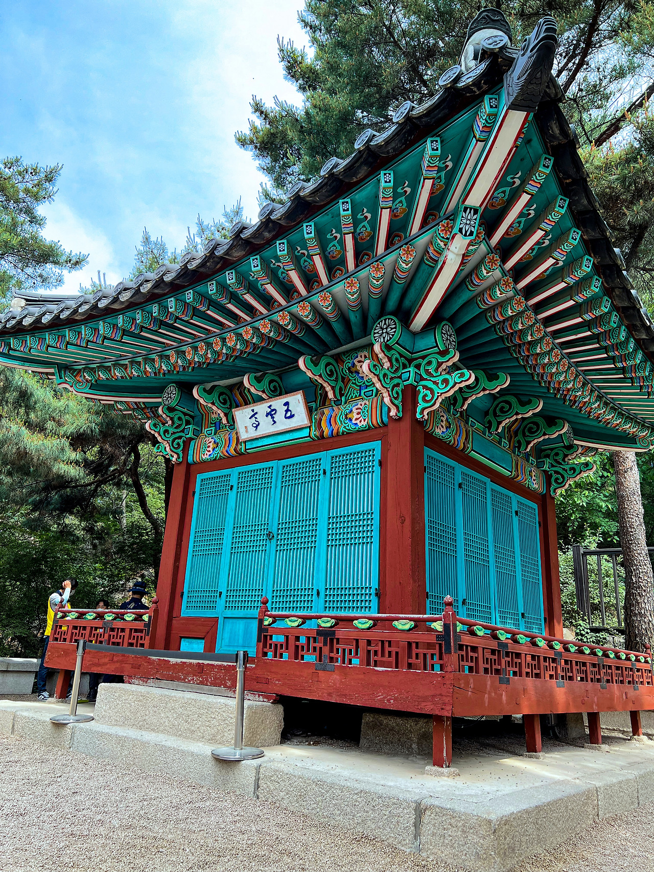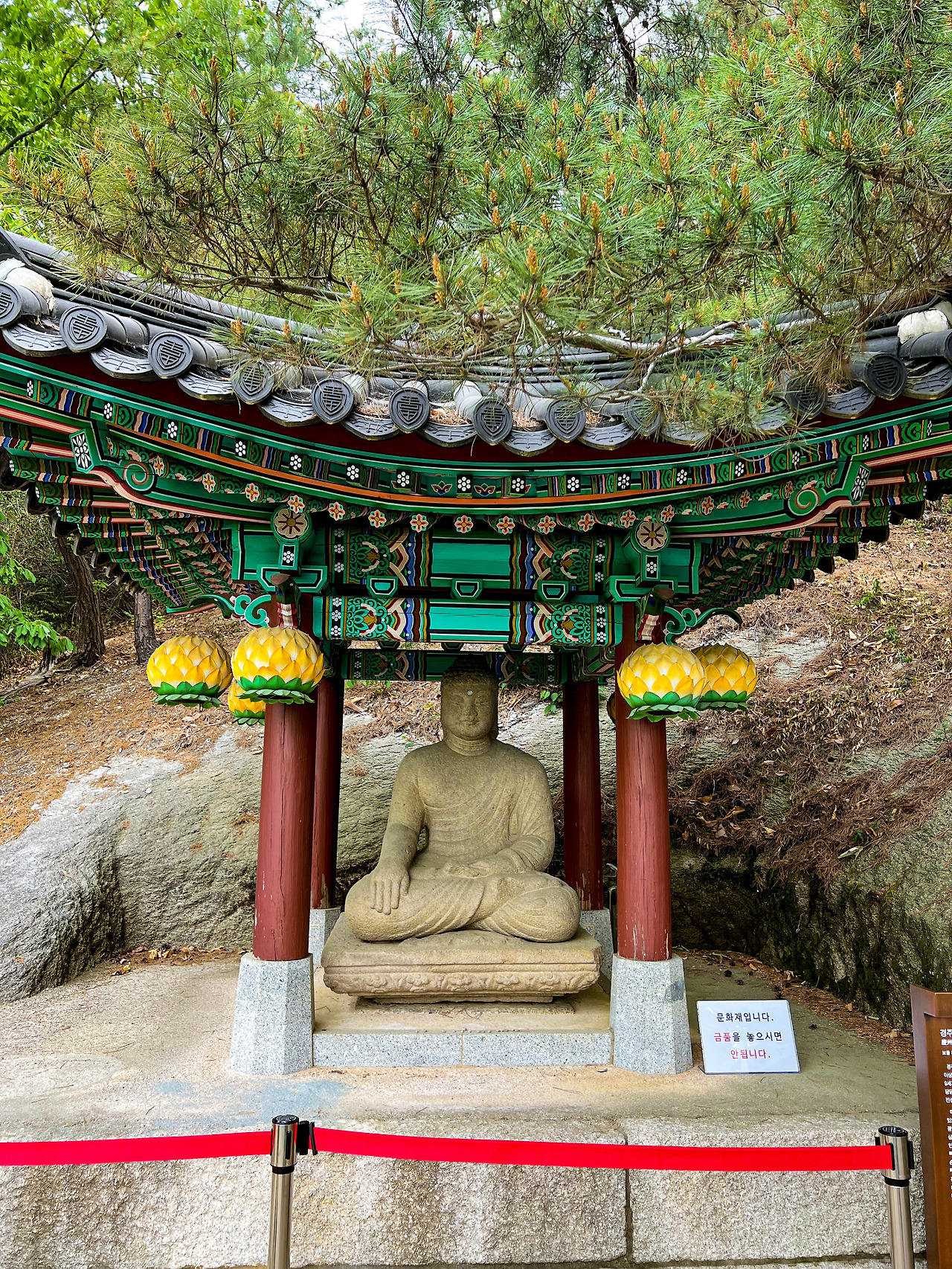 맺혀있는 땀이 슬슬 주르륵 흘러내릴 때 즈음 쉬어갈 수 있는 스폿이 나왔다. 오운정(五雲亭)이라는 정자. 실제로도 휴식을 위해 지어진 정자로 사람들은 오운정 주변 돌난간에 걸터앉아 휴식을 취하고 있었다. 우리도 잠시 쉬면서 오운정 본연의 의미를 만끽해볼까나 했으나 밑에서 기다리고 있는 엄마를 생각해 엄마에게 보여줄 사진만 건지고는 바로 출발했다. 그리고 얼마 지나지 않아 청와대 개방 소식과 함께 주요 볼거리로 소개되면서 국민들 곁으로 돌아온 미남불, 경주 방형대좌 석조여래좌상에 도착했다. 웅장하고 화려한 사찰 안에 있어야 할 부처님이 이런 누추한(물론 청와대 안에 있는 것이기는 하나) 뒷동산 산길에, 그것도 오운정보다도 작은 누각 안에 모셔져 있는 걸 보니 우리나라 '보물 제1977호'치고는 너무 푸대접을 받는 것 아닌가 생각이 들었다. 반면에 이런 누추한 곳에 계심으로서 국민들과 더 가까이 만날 수 있으니 이건 또 장점인 것 같기도 하고, 뭐 아무튼 미남불을 끝으로 엄마의 미션은 클리어!^^V