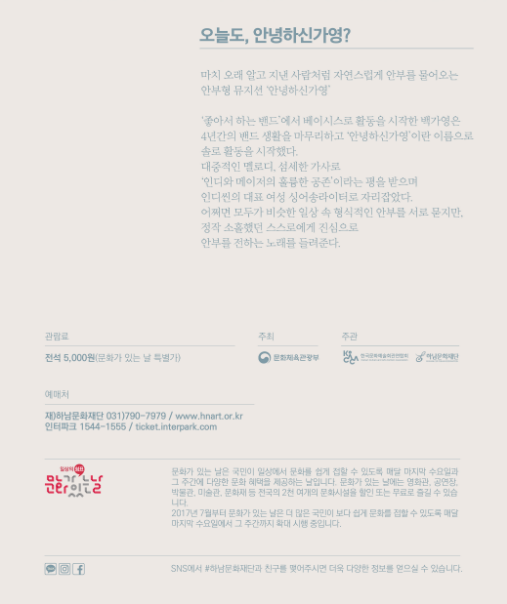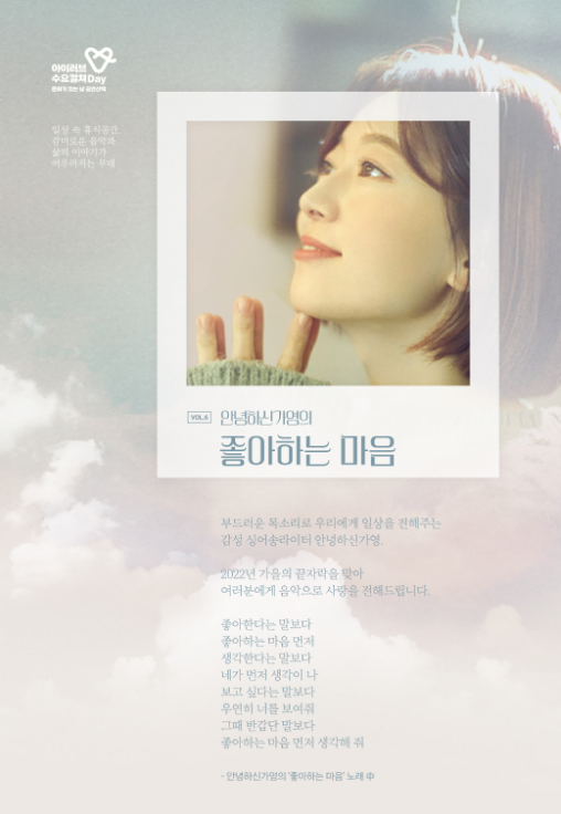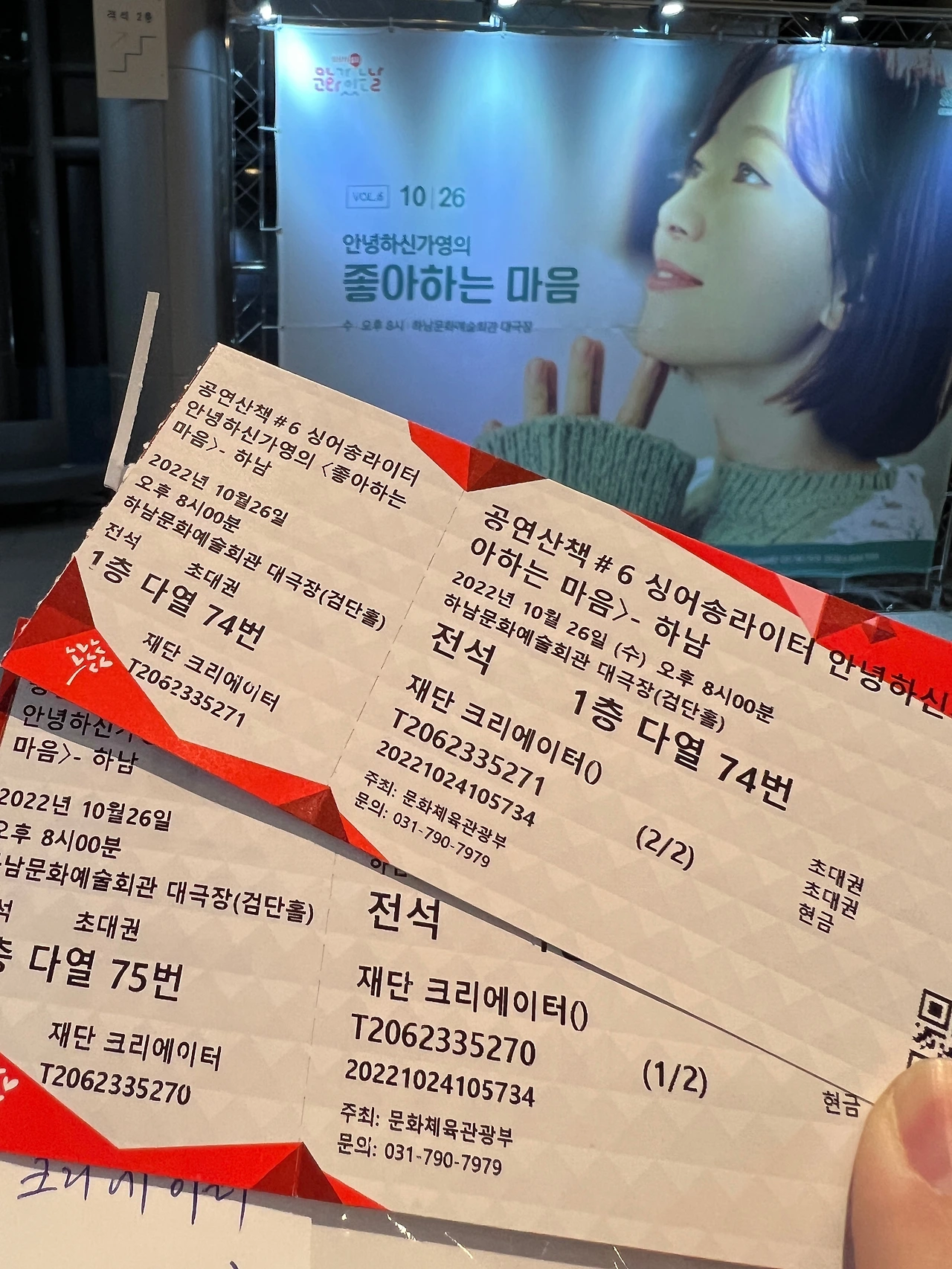 매월 마지막 수요일은 하남의 '문화가 있는 날'이다. 2017년 7월 시작되어 현재까지 유지되어 오고 있는 이 특별한 날은 하남시민들에게 일상에서 문화생활을 쉽게 접할 수 있는 가교 역할을 해오고 있다. 특히 올해인 2022년에는 '아이러브 수요컬쳐DAY 문화가 있는 날 공연산책'이라는 이름하에 감미로운 음악과 삶의 이야기가 어우러진 최정상 아티스트들의 공연이 4월부터 매달 열렸다. 그리고 완연한 가을이 찾아온 10월, 여섯 번째 산책으로 '안녕하신가영의 <좋아하는 마음>' 콘서트가 있었다. 직장에서 안녕하지 못한 하루를 보내고 콘서트를 보러 왔는데 콘서트가 끝나고 집으로 돌아가는 길은 안녕했다. 덕분에.