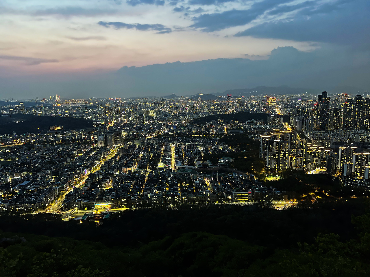 뉘엿뉘엿 해가 넘어가 점점 보랏빛으로 물드는 하늘과 동시에 반짝반짝 조명이 밝혀지는 서울을 보고 있자니 꼬르륵~ 배가 고파왔다. 퇴근 후 바로 오느라 아무것도 먹지도 못한 것. 금방 올라갔다 금방 내려오겠거니 싶어 일부러 아무것도 사지 않았는데 김밥 한 줄에 생수 1병 정도는 챙길 걸 하는 후회가 밀려왔다. 이것도 다 먹고살자고 하는 일인데. 아, 그리고 다음에는 한 가지 더 챙기련다. 등산 장비는 없어도 촬영 장비는 있어야겠더라. 핸드폰에만 담기에는 너무 아까운 서울이니까.