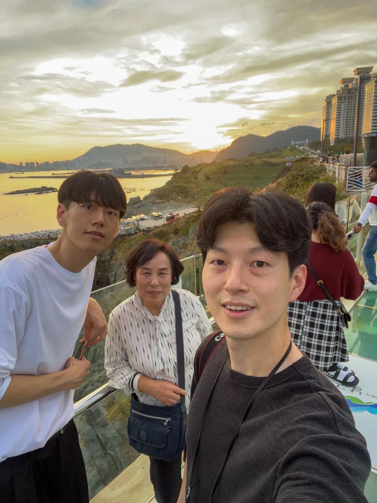 오륙도 스카이워크는 스카이워크라는 이름 그대로 해안절벽 위의 유리다리다. 요즘 해안절벽이나 혹은 높은 루프탑에서 흔히 볼 수 있는 아래가 훤히 들여다보이는 투명 유리 바닥. 사람들은 두께 55.49mm의 방탄유리 위에 몸을 맡기고 (겉으로는) 웃으며 오륙도와 인증숏을 찍었다. 때마침 노을이 지고 있어 하늘과 바다, 그리고 오륙도에 오렌지빛이 그라데이션처럼 스며드니 한껏 센치한 분위기를 풍겼다. 아, 오늘 하루도 이렇게 가는구나... 모처럼 갬성에 빠져있는데 동생이 초를 쳤다.