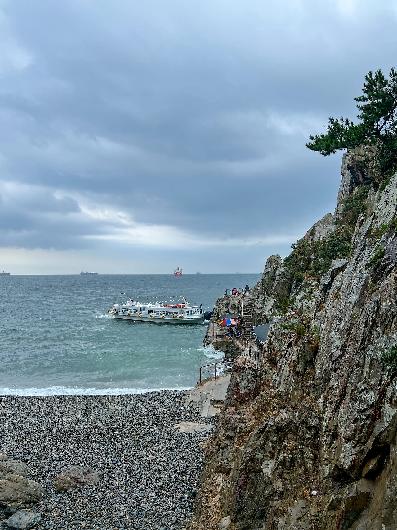 30년 전 엄마의 기억 속(어쩌면 이제 반은 상상일지도 모를) 태종대는 해안절벽 아래까지 내려가 사진을 찍었던 곳이라고 했다. 하지만 내가 검색해 본 지금의 태종대는 깔끔한 전망대가 있어 태종대와 바다 뷰를 감상하고 사진도 찍는 포토스폿이었다. 예나 지금이나 사진 찍는 곳인 건 여전했다. 그때 그 시절과 다른 게 하나 있다면 태종대 주차장에서 전망대까지 다누비열차라는 일종의 셔틀 같은 귀염뽀짝 열차가 있어 아기자기한 재미와 함께 편하게 태종대를 둘러볼 수 있다는 것. 근데 여기서 또 날씨가 문제였다. 비 오는 날에는 노면이 미끄러워 열차 운행을 안 한단다. 하는 수 없이 태종대 전망대까지 우산 쓰고 우중산책을 즐길 생각으로 주차장을 나서려는데 주차장 입구에 진을 치고 있는 아저씨 2명이 말을 걸어왔다. 이것은 필시 호객행위. 비가 와 다비누열차는 운행을 안 하고 걸어서 태종대까지 가려면 대충 1시간 좀 넘게 걸린다며 마치 걸어서는 절대 못 갈 곳처럼 말했다. 하지만 이미 지도앱으로 총 2.1km 거리에 도보로 약 32분 소요된다는 걸 찾아봤기에 나에게는 당연히 씨알도 안 먹혔다. 대신 다른 이야기가 솔깃했다. 본래 태종대라는 건 태종대 전망대를 말하는 게 아니라 침식으로 깎여진 기암괴석의 해안절벽이라고. 그래서 전망대에서가 아니라 바다에서 유람선을 타고 둘러봐야 제대로 보는 거라고. 평소의 나였다면 어떤 호객행위든 단 1초도 듣지도 생각하지도 않고 무시하는 편인데 그래도 여행 좀 다녀봤다는 (불효)놈으로서 엄마와 동생에게 뭔가 특별한 추억을 만들어 주고 싶다는 것과 비로 인해 다소 차질이 생긴 일정을 대체할 만한 플랜 B를 찾아야 한다는 강박관념에 사로잡힌 나머지 무려 몇 분이나 계속된 장황한 설명을 귀 담아 듣고, 곱씹어 생각한 끝에 그대로 호객행위에 홀라당 넘어가고 말았다.