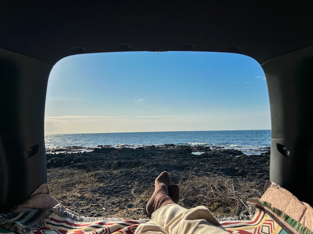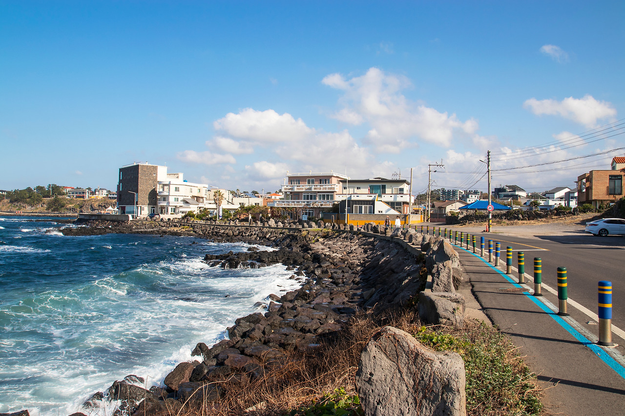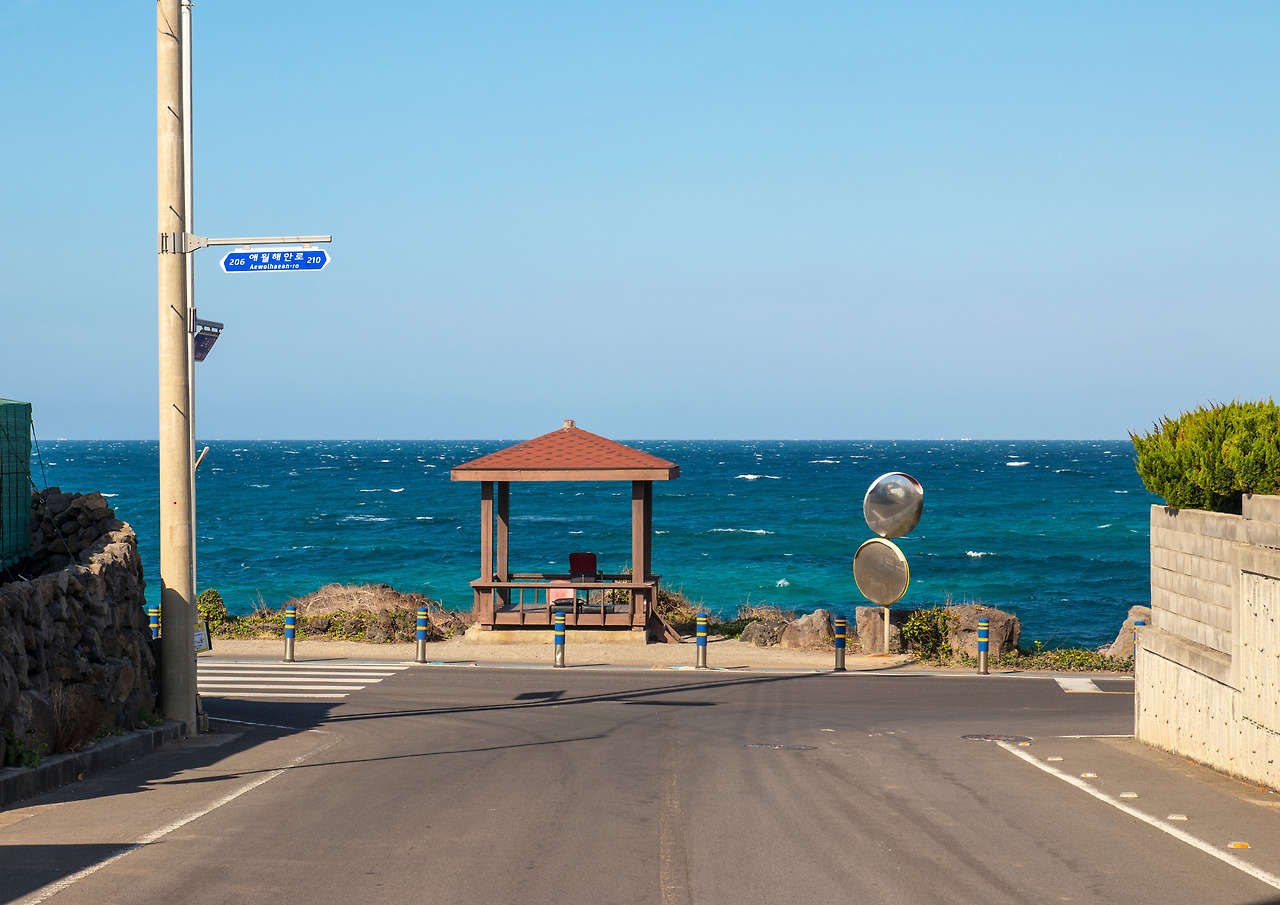 목적지에 대한 고민은 도로표지판에 적힌 '해안도로'가 해결해 주었다. 방황을 하더라도 일단 제주 바다를 보며 하자는 생각에 그대로 우회전을 했는데 순간 동네 골목길 사이로 드러난 제주바다와 네모정자의 모습이 진부하지만 액자 속 그림 같았다. 도저히 그냥 지나칠 수 없어 잠시 길가에 차를 대고 액자 속 그림을 카메라라는 액자에 다시 한번 담았다. 지나가는 길이 목적지가 되는 순간. 굳이 어디를 가려고 애쓰지 않아도 될 것 같았다. 지금처럼 가다 서다 가다 서다, 그러다가 오래 머물고 싶은 곳이 있으면 트렁크 열고 뒷좌석 눕히고 벌러덩 누우면 되니까. 이런 게 찐 차크닉이지.