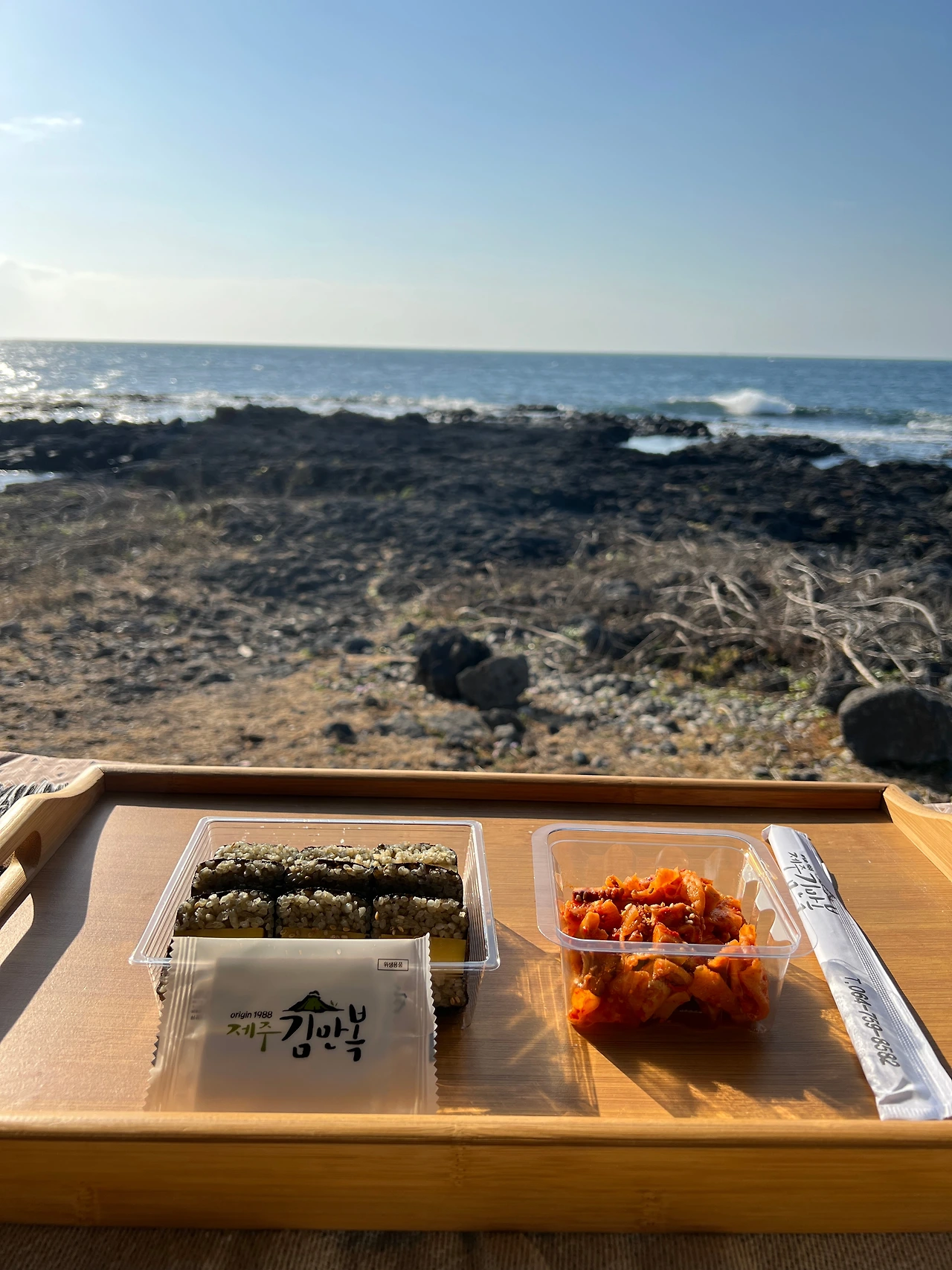 거센 바닷바람에 체온이 떨어지니 슬슬 배도 고파오는 것 같아 일단 배를 채우기로 했다. 모름지기 차크닉이라 하면 차에서 바다를 안주삼아 먹어야 할 터. 메뉴는 포장할 수 있고 뒤처리가 간편한 김밥으로 정했다. 물론 제주이니 만큼 육지 스타일 말고 제주 스타일로. 전복 내장이 들어가 살짝 탁한 색의 밥과 중간에 계란지단이 통으로 들어가고, 그 주위를 네모나게 김이 둘러싸고 있는(이 정도 묘사했으면 이미 알만한 사람은 다 알 것 같은) 만복이 아저씨네 김밥을 포장했다. 배운 사람답게 오징어무침도 함께. 식당 안 뷰도 생각보다 좋아(참고로 애월점) 순간 먹고 갈까 흔들렸지만 지금 차크닉 중이라는 사실을 상기시키며 반드시 더 좋은 뷰를 보며 먹겠다는 굳은 의지로 가게를 빠져나왔다.