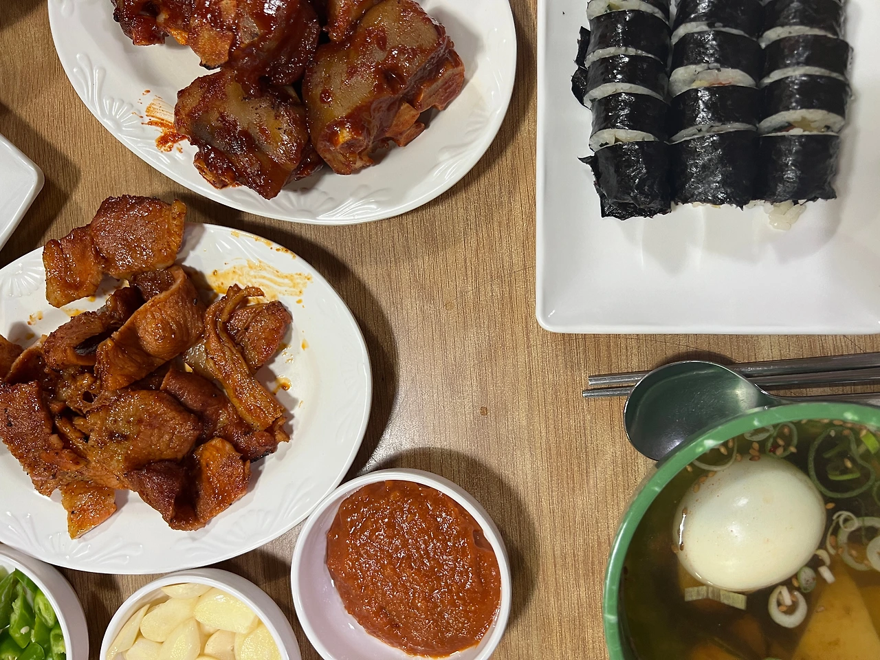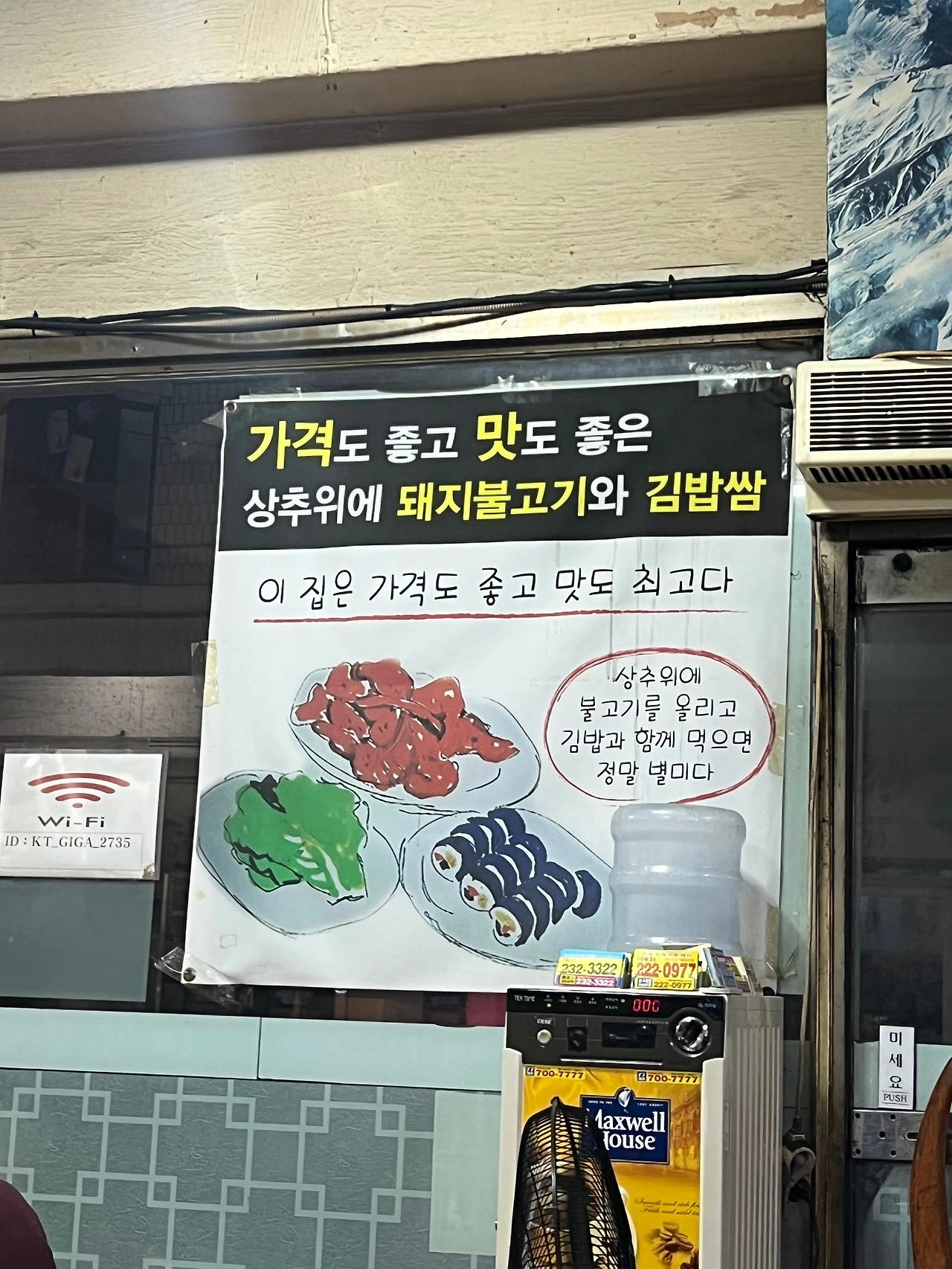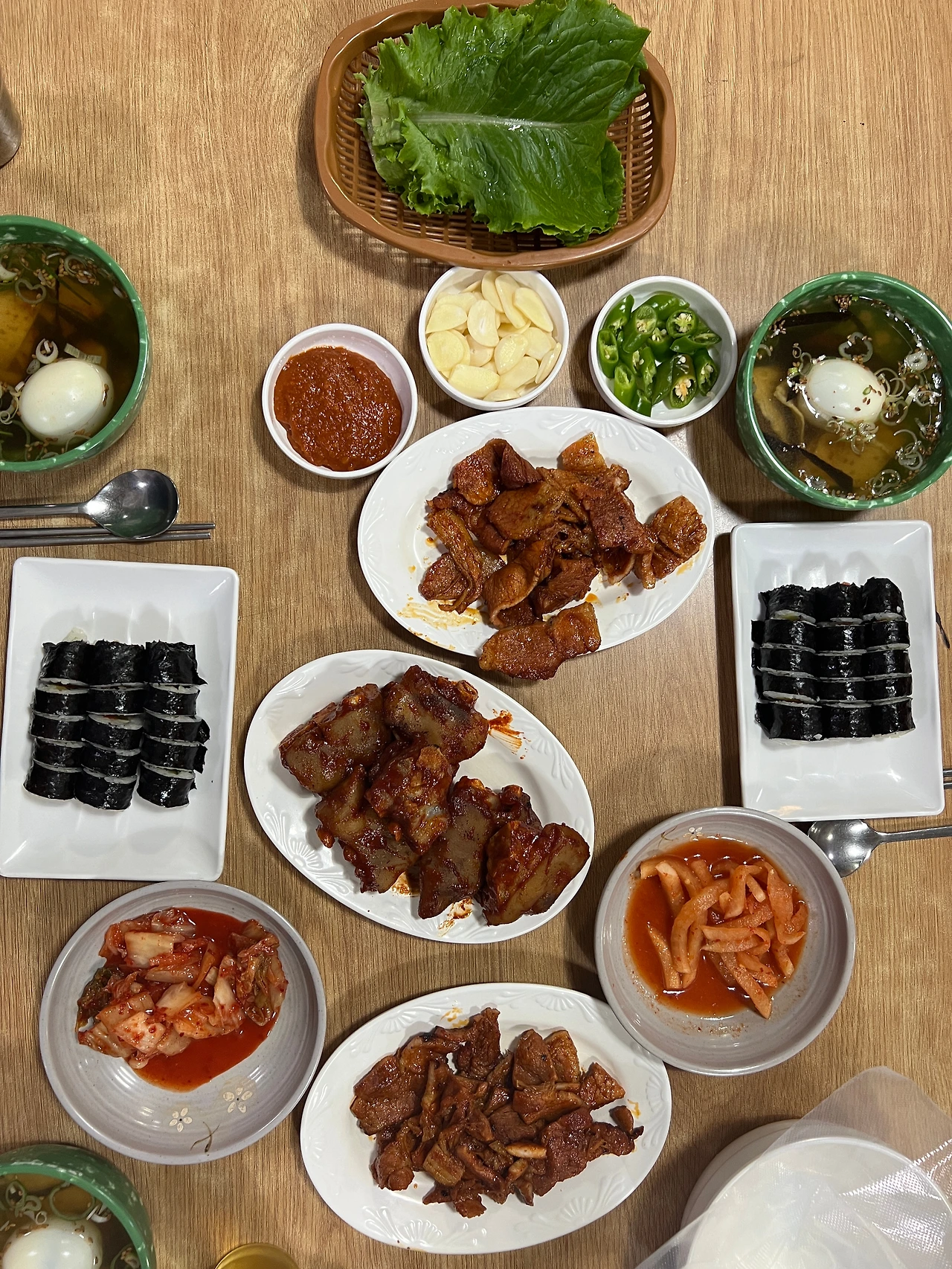 전주책쾌 1일 차 종료. 이제는 베케이션이다. 우리는 전주책쾌에서 주최하는 단체 뒤풀이를 뒤로하고 우리만의 프라이빗 베케이션을 즐기기로 했다. 일단 시간도 시간이고 종일 일하느라 고생했으니 저녁식사부터. 열심히 일한 당신 맛있는 걸 먹어라! 전주에 왔으니 전주스러운 한 끼를 먹기 위해 배작가의 먹킷리스트 지도를 염탐했다. 그중 우리의 간택을 받은 집은 태평진미집. 메뉴는 '상추 위에 돼지불고기와 김밥쌈'. 실제 메뉴 이름은 아니고 메뉴판상에는 연탄직화구이(한접시)와 김밥이 따로 있지만 먹는 방법이 그렇다 보니 비공식적인 메뉴 이름이 된 것 같았다. 이렇게 먹는 레시피를 사장님이 개발해 손님들에게 추천한 것인지, 우연히 손님들이 먹기 시작해 입소문 타고 이어지게 된 건지는 알 수 없지만 연탄불고기에 상추쌈은 너무 잘 아는 맛이고 거기에 또 다른 아는 맛인 김밥이 들어간 셈인데 한 마디로 별미다. 와~ 존맛탱! 은 아니지만 그렇다고 맛이 없는 것도 아닌(애초에 맛있는 것들만 싸 먹기에 맛이 없을 수는 없다) 그냥 특이한 맛? 전주에서만 맛볼 수 있는 맛? 나에게는 딱 그 정도였다. 만약 서울의 연탄불고기집에서 김밥을 함께 준다면 굳이 상추랑 싸 먹을 것 같지는 않다. 다만 전주이기에, 전주에서는 다들 이렇게 먹는다 하니, 전주감성을 맛볼 수 있는 전주의 맛이었다.