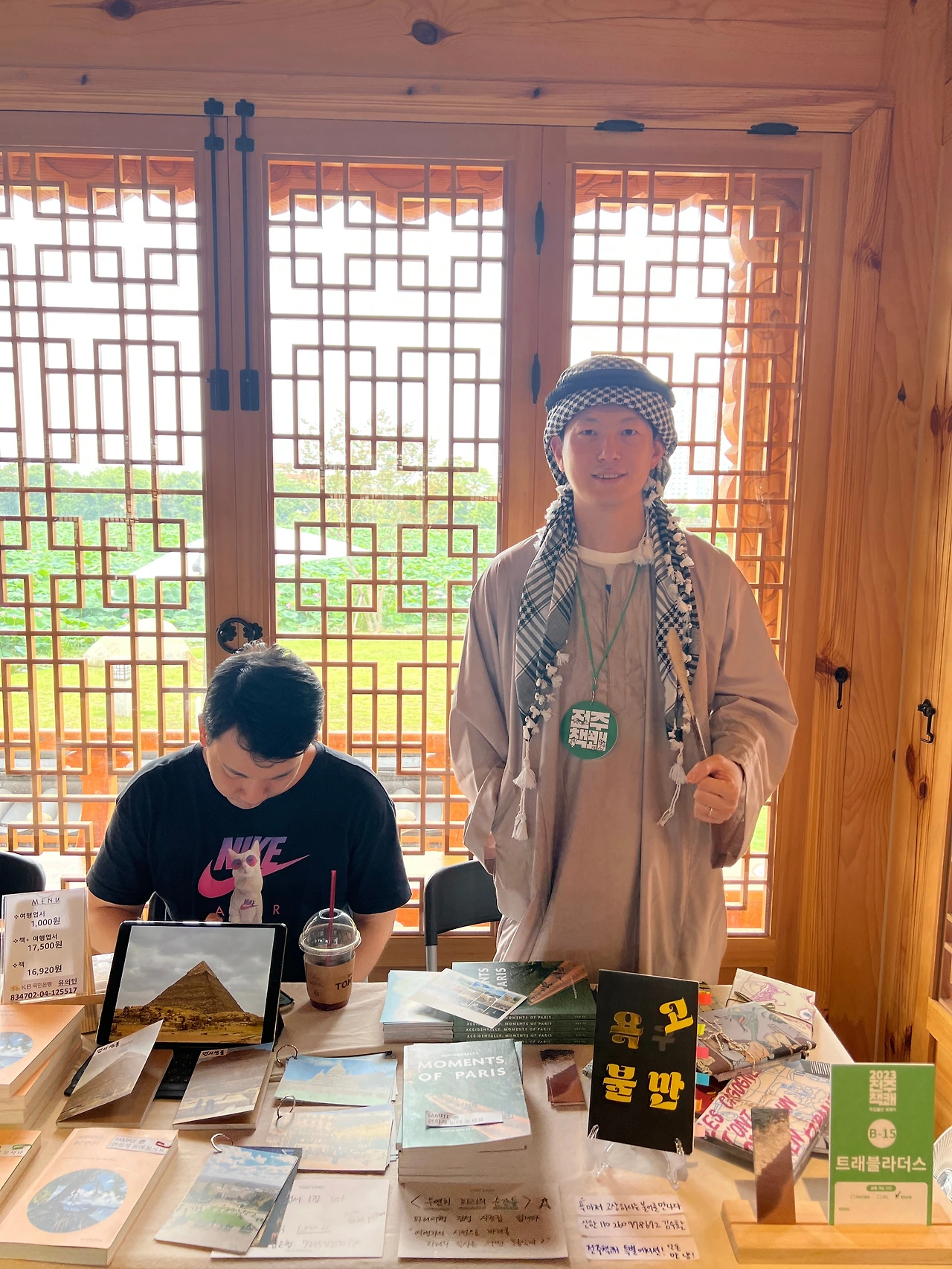 또 다른 이벤트였던 나의 비주얼 퍼포먼스는 이집션 코스프레였다. 이집트 신혼여행 때 산 이집트 전통 복장을 풀셋으로 장착하고 연화정도서관을 배회하며 트래블라더스를 홍보할 계획이었다. 완전 망했다. 일단 너무 더웠다. 에어컨이 있었지만 출입문이 항시 열려있었고 사람들은 많다 보니 그 열기를 천장에 외로이 붙어 있는 붙박이 에어컨이 혼자 감당하기에는 너무 가혹했다. 게다가 통로도 좁아 배회할 수 있는 여건도 되지 않았다. 배회는커녕 이리 낑기고 저리 낑겨 다닐 판. 결국 시작한 지 한두 시간 만에 퍼포먼스 강제 종료. 씁쓸함과 찝찝한 땀냄새만 남은 이벤트가 돼버렸다.