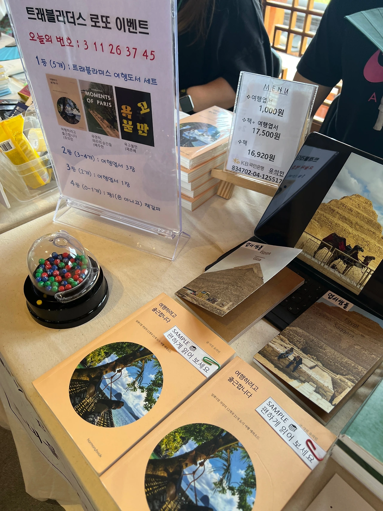 부스 세팅을 마치고 본격적인 손님맞이를 시작했다. 이번 전주책쾌에서는 전주시 못지않게 우리도 야심 차게 준비한 것이 있었으니, 하나는 로또 이벤트요, 다른 하나는 (물론 나만의 개인적인 이벤트지만) 비주얼 퍼포먼스였다. 먼저 로또 이벤트는 공 뽑기 장난감을 이용해 5개의 번호를 뽑아 로또처럼 당첨이 되면 차등을 두어 상품을 주는 이벤트다. 1등은 무려 트래블라더스 각 책 1권씩. 나머지는 여행엽서나 책갈피다. 이벤트 반응은 상당히 좋았다. 적극적으로 참여해 주시는 분들도 많았고, 소극적으로 참여하다 우리가 응대를 하면 적극적으로 참여해 주셨다. 다만 아쉬운 건 참여율 대비 책 판매량이 나오지 않았다는 점. 로또 이벤트의 주목적은 우리 책에 대한 관심을 유발하기 위함이었는데 '로또'라는 단어가 주는 임팩트와 공 뽑는 기계의 귀여움의 임팩트가 강했는지 관심이 책으로까지 이어지지는 못했다.
