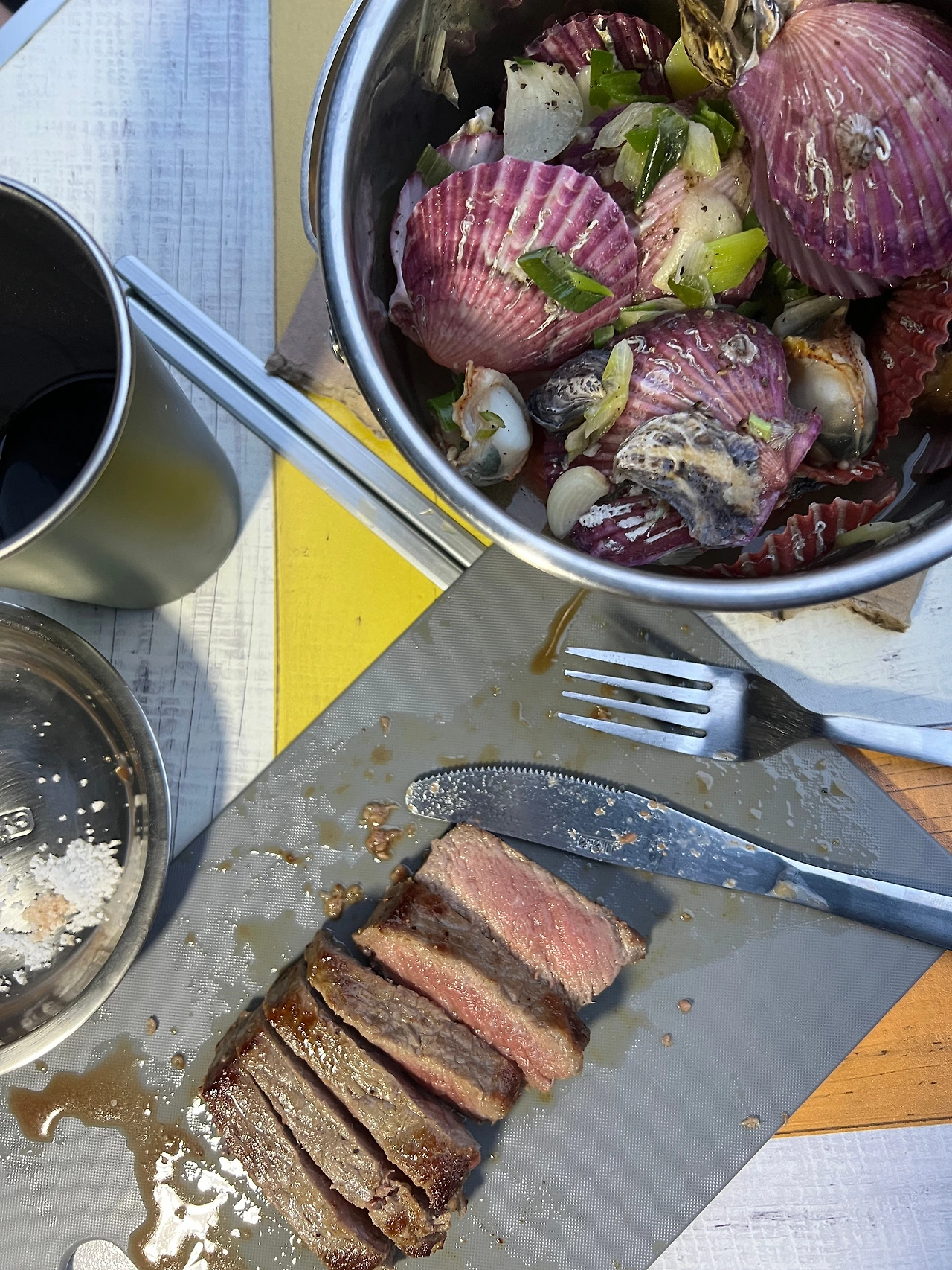 문어숙회와 막걸리를 다 먹기도 전에 바로 또 저녁이라니. 허나 시계를 보니 너무나 당연한 이야기였다. 주변에서도 이미 지지고 볶는 소리가 심심치 않게 냄새를 타고 들려왔다. 남아있는 문어 몇 점과 막걸리를 후딱 해치우고는 셰프모드 ON. 저녁 메뉴는 기름이 많이 튀어 캠핑장에서만 해 먹는 스테이크. 고기는 안심과 부채살로 준비했다. 고기 시즈닝 후 숙성을 시켜놓고 버터, 타임, 양송이, 올리브유 등 나머지 재료들을 준비했다. 그사이 아내는 가리비찜을 준비했다. 본래 조개류 찜에 일가견이 있어 능숙하게 냄비를 채우고는 불위에 올렸다. 가리비술찜은 이제 보글보글 끓으며 애들이 입 벌리기만을 기다리면 끝! 다시 난 스테이크로 돌아와서, 꺼내 팬에 올리브유를 둘러 적당히 달군 후 숙성(이라고 하기엔 너무 짧은 시간이지만) 시켜둔 고기를 올렸다.