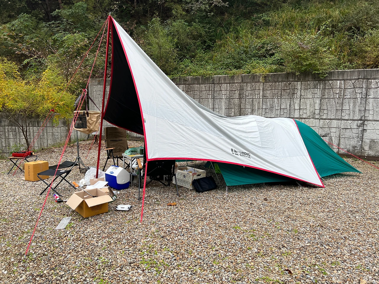 텐트까지는 스무스했다. 몇 달 전 빈대캠핑에서 피칭 연습을 해본 게 신의 한 수였다. 여기까지는 아내도 강 건너 불구경하듯 차에 앉아 오구오구 궁디 팡팡을 해주며 칭찬으로 나를 춤추게 만들었다. 아내의 응원에 힘입어 기세를 몰아 처음 개시하는 타프를 펼쳤다. 야침 차게 펼치긴 펼쳤는데 사이즈부터 텐트의 2배 정도는 되다 보니 혼자서는 어려울 것 같았다. 역시나 캠핑 중수답게 눈치 빠른 아내가 자리를 박차고 일어나 손을 거들었다. 타프지옥의 서막이다.