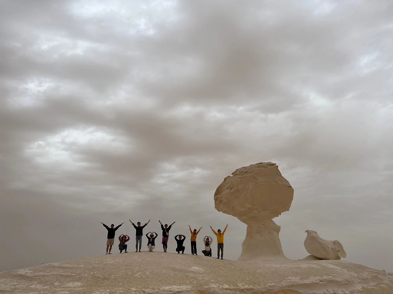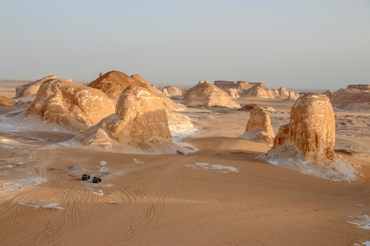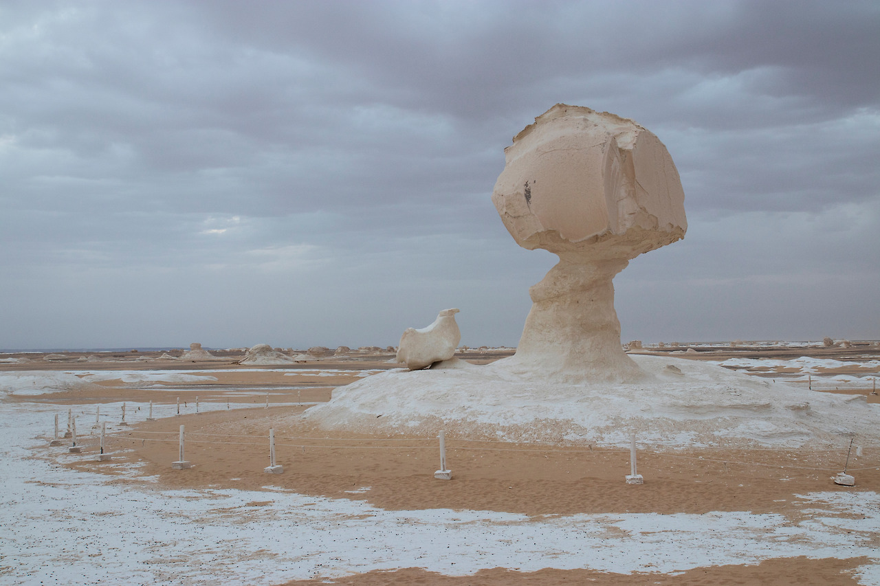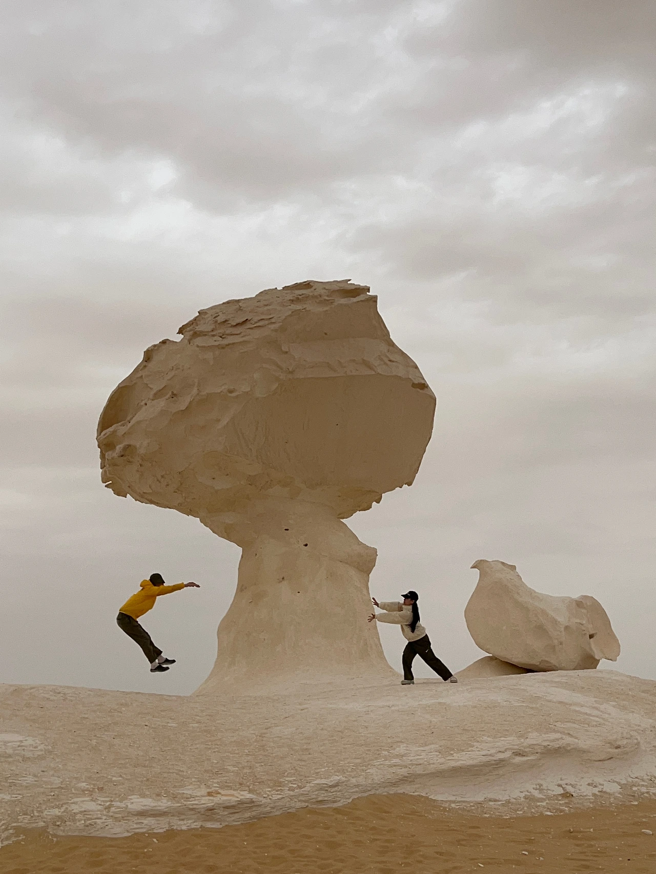 바하리야 사막투어의 마지막 사막이자 베이스캠프인 백사막은 모래사막 위에 눈이 소복이 쌓인 듯한 모습이다. 물론 눈은 아니고 석회암이다. 석회암이 사막 전체에 깔려있고 곳곳에 커다란 바위 형태로 널려있다. 석회암은 주로 조개껍질이나 산호와 같은 해양 환경으로부터의 퇴적물로 만들어지기 때문에 백사막은 바하리야 사막이 과거에 바다였다는 것을 가장 잘 뒷받침해 주는 증거다. 실제로 조개 화석 등이 발견되기도 했단다. 백사막의 커다란 석회암 바위들은 돌조각 공원에 온 것처럼 각자 두서없지만 개성 있는 모양을 하고 있는데 오랜 시간 바람을 맞아 깎인 결과물이다. 그야말로 바람의 예술작품. 그중 치킨바위와 버섯바위가 유명하다. 딱 보면 닭과 버섯이 떠오른다. 때문에 백사막의 단골 포토존이다. 혼자보단 둘 혹은 단체로 콘셉트를 정해 찍는 것이 좋다. 물론 콘셉트는 가이드의 몫. 여행자는 그냥 시키는 대로만 하면 인생숏은 따놓은 당상이다.