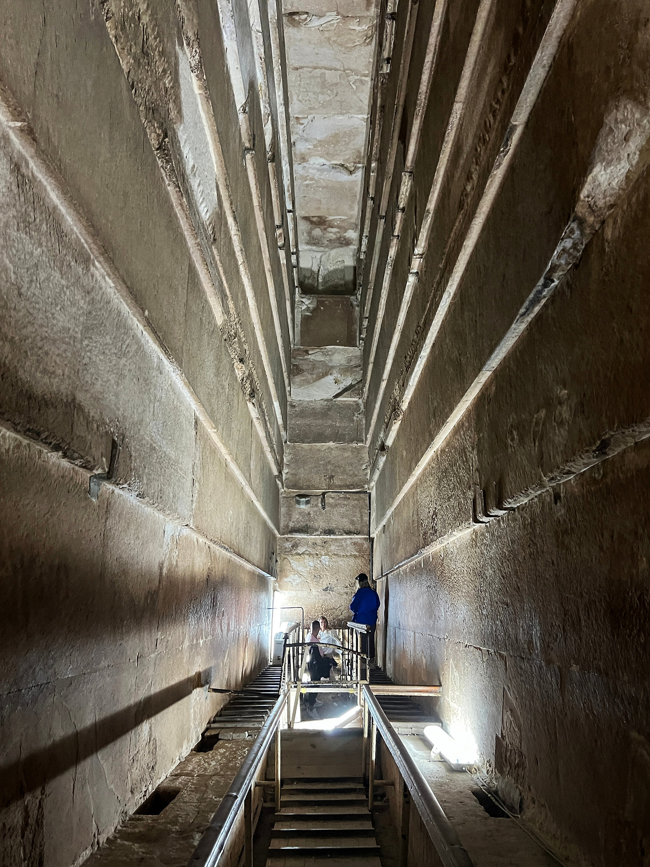 피라미드 내부는 오름의 연속이다. 초입을 지나 대회랑까지 오르는 통로는 두 발 직립보행보다 사족보행이 훨씬 수월하다. 대회랑에 도착하면 허리를 펼 수 있다. 하지만 이제부터는 계단 지옥. 사실 지옥이라 할 만큼 계단 높이가 높거나 개수가 많지는 않았는데 환풍구라고는 작은 틈새 하나 없는 벽돌 속이다 보니 조금만 움직여도 숨이 가빠 왔다. 폐소공포증과 같이 밀폐된 공간에 답답함이나 불편함을 느끼는 사람들에게는 비추천이다.