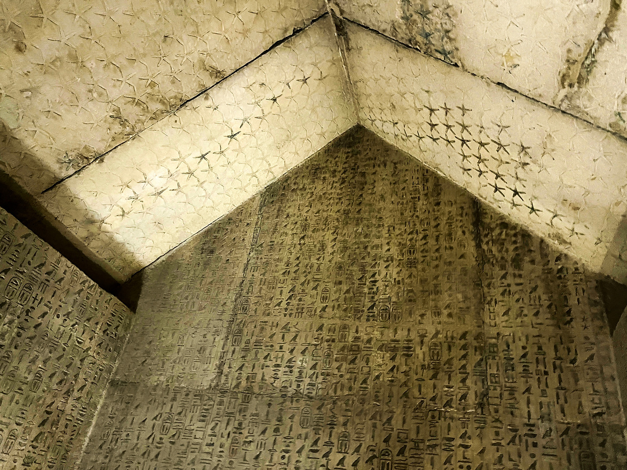 이집트 제5왕조 마지막 왕인 우나스의 피라미드는 꼭 내부를 관람해야 한다. 공사장에 공사가 끝나고 남은 돌덩이들을 무더기로 쌓아놓은 것 같이 생겨 피라미드라고는 보기 어려운 없는 겉모습과는 달리 내부는 아주 특별하다. 플립형 핸드폰처럼 허리를 반으로 접고 걸어야 될 만큼 좁디좁은 통로를 지나 비로소 곡소리를 내며 허리를 펼 수 있는 현실(*시체가 안치되어 있는 무덤 속의 방)에 도착하면 사방팔방으로 온갖 희한한 상형문자들이 도배되어 있다. ‘피라미드 텍스트(Pyramid Texts)’라 부르는 이 상형문자들은 사후세계에 있을 파라오의 부활을 돕기 위한 종교적인 주문서다. 일종의 주기도문인 셈. 우나스의 피라미드에서 최초로 시작됐고 이것이 전통이 되어 이후 만들어진 피라미드들에도 시대에 따라 형태는 조금씩 다르지만 벽화나 문서로 기록이 남겨지기 시작했다고 한다.